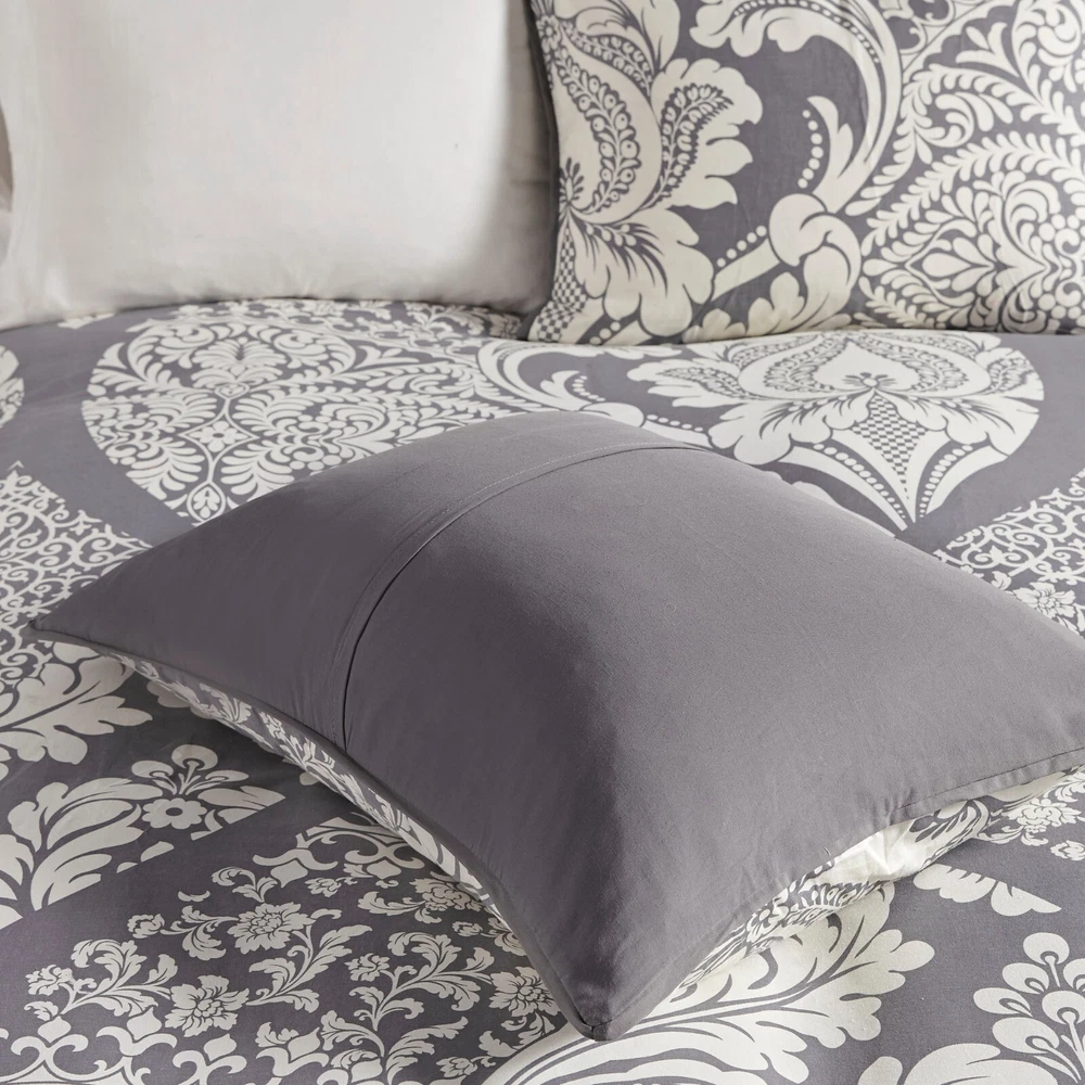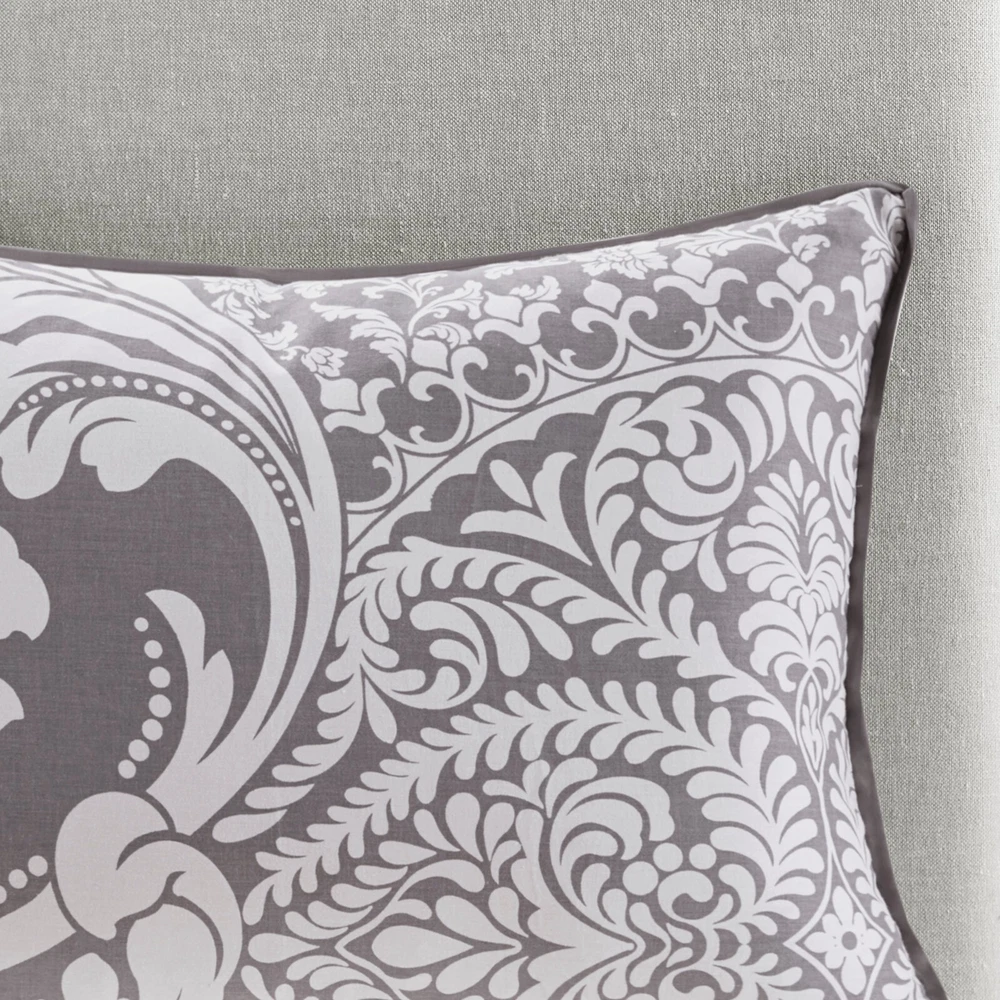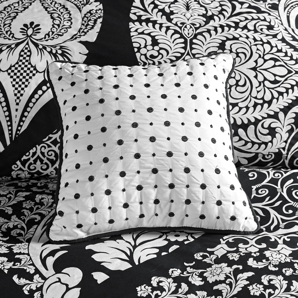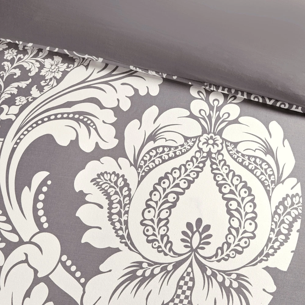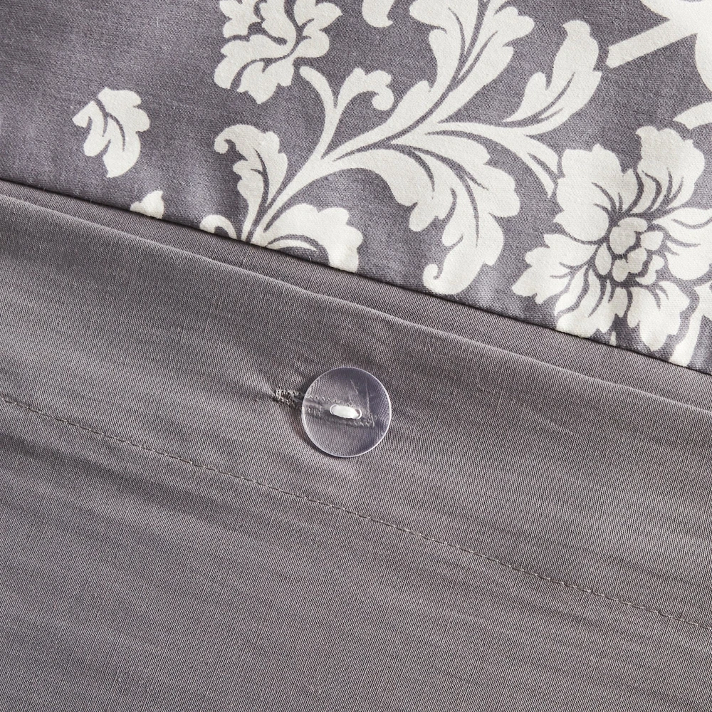 Store Categories Store Categories Bedding Comforters Decorative Pillows Duvet Covers Quilts & Coverlets Sheets Blankets & Throws Mattress Pads Pillows Home Decor Window Treatments Wall Art Home Accents Furniture Beds Dining Seating Ottomans & Benches Accent Chairs Accent Tables Dining Tables Sofas Bath Bath Robes Shower Curtains Towels Bath Rugs Bath Accessories Apparel Pajama Sets Nightgowns Rugs Rugs & Carpets Lighting Lamp Pendant Other Product Overview Details DESCRIPTION The Madison Park Vienna 6 Piece Printed Duvet Cover Set offers an eye-catching update to your bedroom decor. A beautifully intricate damask pattern is flaunted across the duvet cover and shams, for a chic transitional look. The solid reverse perfectly complements the top of the bed, while the flange border adds a charming accent to the duvet cover. Three decorative pillows with embroidered details and fabric manipulation complete the duvet cover set. Made from 100% cotton sateen, this bedding set is OEKO-TEX certified, meaning it does not contain any harmful substances or chemicals to ensure quality comfort and wellness. A button closure helps secure a comforter insert within the duvet cover and inside ties in the corners help prevent it from shifting (insert is NOT included). FEATURES • Transitional 6 piece cotton printed duvet cover set • Features Intricate damask design in black and white contrasted colors and solid black color on the reverse • Set includes 1 duvet cover, 2 matching shams and 3 decorative pillows • Embroidered and fabric manipulation decorative pillows • Button closure and inside ties to secure the insert (insert not included) • Oeko-Tex Certified, includes no harmful substances or chemicals • Machine washable for easy care MATERIAL Duvet Cover/Sham: 200TC Cotton sateen, printed Reverse/Sham: Cotton/polyester crossweave Pillows: Cotton/polyester crossweave with polyester filling Available Sizes: Full/Queen Duvet Cover Set includes: 1 Duvet Cover: 90"W x 90"L 2 Standard Shams: 20"W x 26"L + 2"D 1 Decorative Pillow: 18"W x 18"L 1 Decorative Pillow: 16"W x 16"L 1 Decorative Pillow: 12"W x 16"L K ing/California King Duvet Cover Set includes: 1 Duvet Cover: 104"W x 92"L 2 King Shams: 20"W x 36"L + 2"D 1 Decorative Pillow: 18"W x 18"L 1 Decorative Pillow: 16"W x 16"L 1 Decorative Pillow: 12"W x 16"L Bedding Comforters Decorative Pillows Duvet Covers Quilts & Coverlets Sheets Blankets & Throws Mattress Pads Pillows Home Decor Window Treatments Wall Art Home Accents Furniture Beds Dining Seating Ottomans & Benches Accent Chairs Accent Tables Dining Tables Sofas Bath Bath Robes Shower Curtains Towels Bath Rugs Bath Accessories Rugs Rugs & Carpets Lighting Lamp Pendant Product Overview Product Details DESCRIPTION The Madison Park Vienna 6 Piece Printed Duvet Cover Set offers an eye-catching update to your bedroom decor. A beautifully intricate damask pattern is flaunted across the duvet cover and shams, for a chic transitional look. The solid reverse perfectly complements the top of the bed, while the flange border adds a charming accent to the duvet cover. Three decorative pillows with embroidered details and fabric manipulation complete the duvet cover set. Made from 100% cotton sateen, this bedding set is OEKO-TEX certified, meaning it does not contain any harmful substances or chemicals to ensure quality comfort and wellness. A button closure helps secure a comforter insert within the duvet cover and inside ties in the corners help prevent it from shifting (insert is NOT included). FEATURES • Transitional 6 piece cotton printed duvet cover set • Features Intricate damask design in black and white contrasted colors and solid black color on the reverse • Set includes 1 duvet cover, 2 matching shams and 3 decorative pillows • Embroidered and fabric manipulation decorative pillows • Button closure and inside ties to secure the insert (insert not included) • Oeko-Tex Certified, includes no harmful substances or chemicals • Machine washable for easy care MATERIAL Duvet Cover/Sham: 200TC Cotton sateen, printed Reverse/Sham: Cotton/polyester crossweave Pillows: Cotton/polyester crossweave with polyester filling Available Sizes: Full/Queen Duvet Cover Set includes: 1 Duvet Cover: 90"W x 90"L 2 Standard Shams: 20"W x 26"L + 2"D 1 Decorative Pillow: 18"W x 18"L 1 Decorative Pillow: 16"W x 16"L 1 Decorative Pillow: 12"W x 16"L K ing/California King Duvet Cover Set includes: 1 Duvet Cover: 104"W x 92"L 2 King Shams: 20"W x 36"L + 2"D 1 Decorative Pillow: 18"W x 18"L 1 Decorative Pillow: 16"W x 16"L 1 Decorative Pillow: 12"W x 16"L