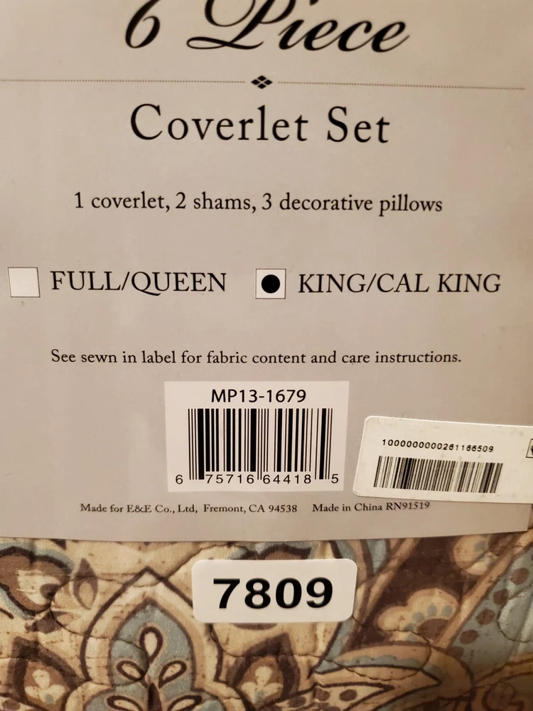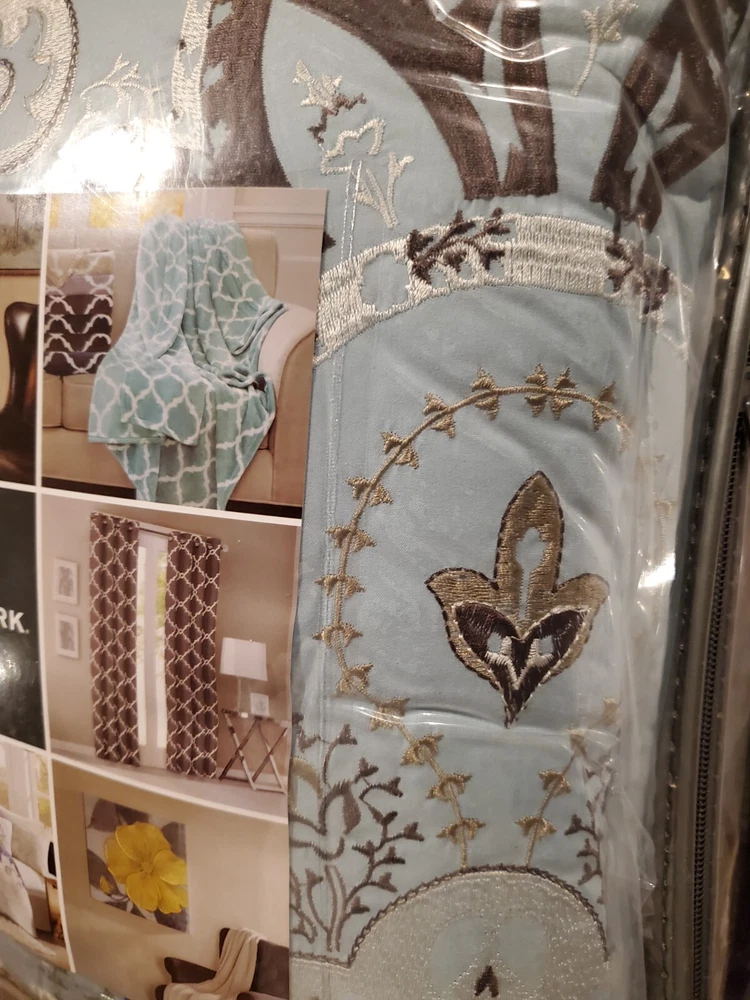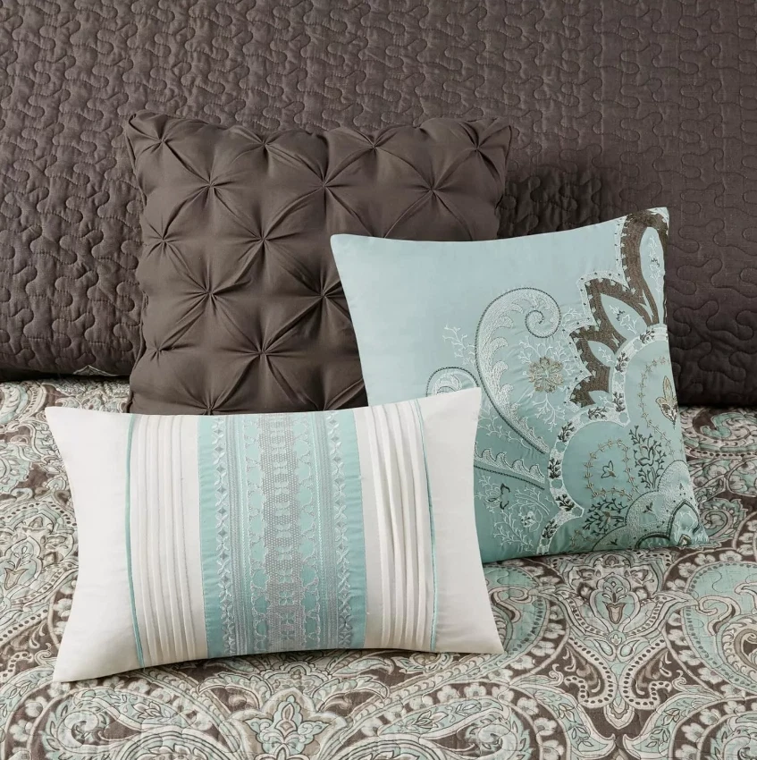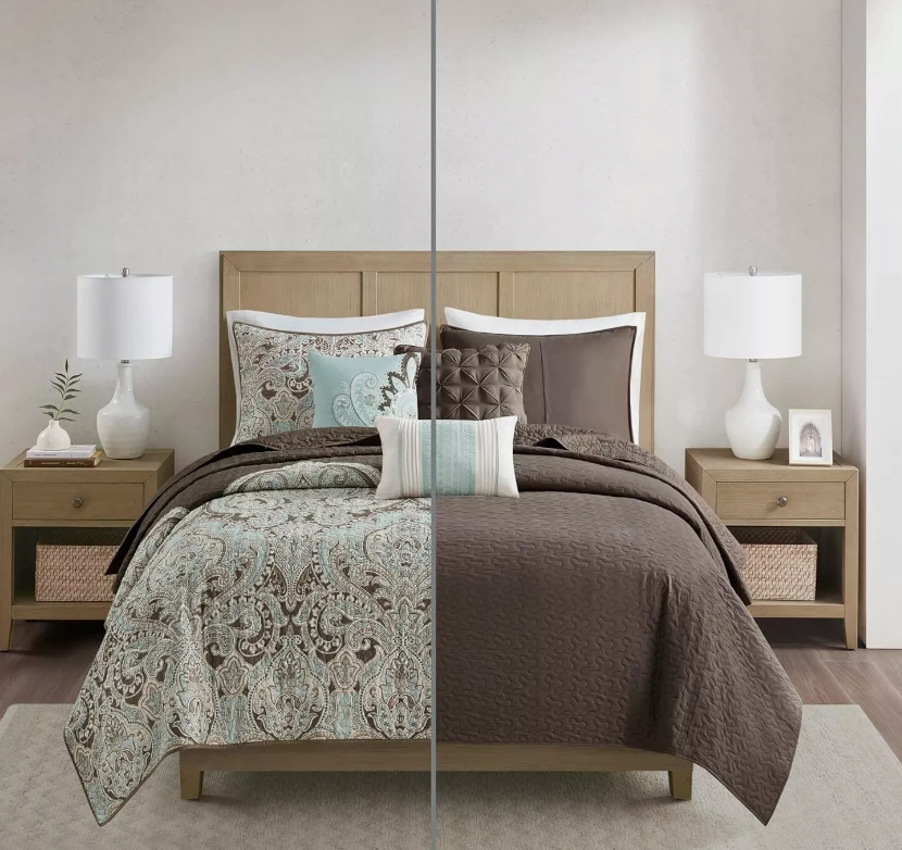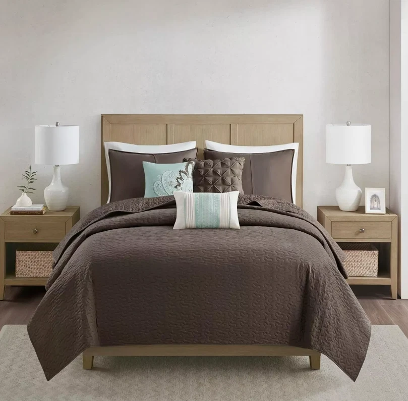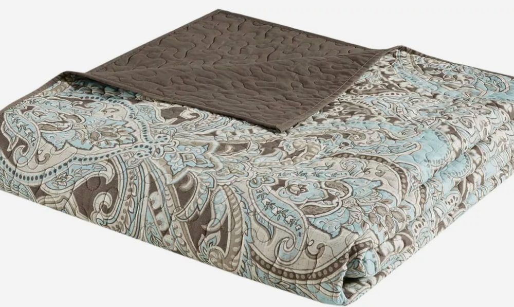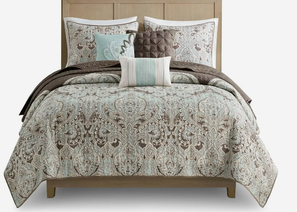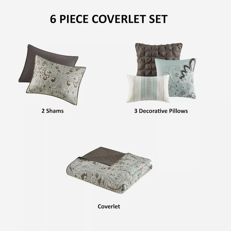 Brand: Madison Park Size: King /Cal King Color: Brown Aqua Material: Polyester Condition: NEW WITH TAGS 100% Microfiber Madison Park Geneva Coverlet Set showcase traditional damask design giving your décor an elegant update. The design features subtle contrast of light turquoise color against deep brown and accented with ivory creating a gorgeous color combination Naturally lightweight fabric perfect for summer use or layer it on for cold weather. Set includes: 1 Coverlet: 104"W x 94"L, 2 King Shams: 20"W x 36"L + 0.5"D, 3 Decorative Pillows: 18"W x 18"L/16"W x 16"L/12"W x 18"L Care instructions: machine wash cold, gentle cycle, and separately. Do not bleach. tumble dry low, remove promptly, do not iron. If there is no free movement in the washer or dryer, use large capacity commercial washer/dryer