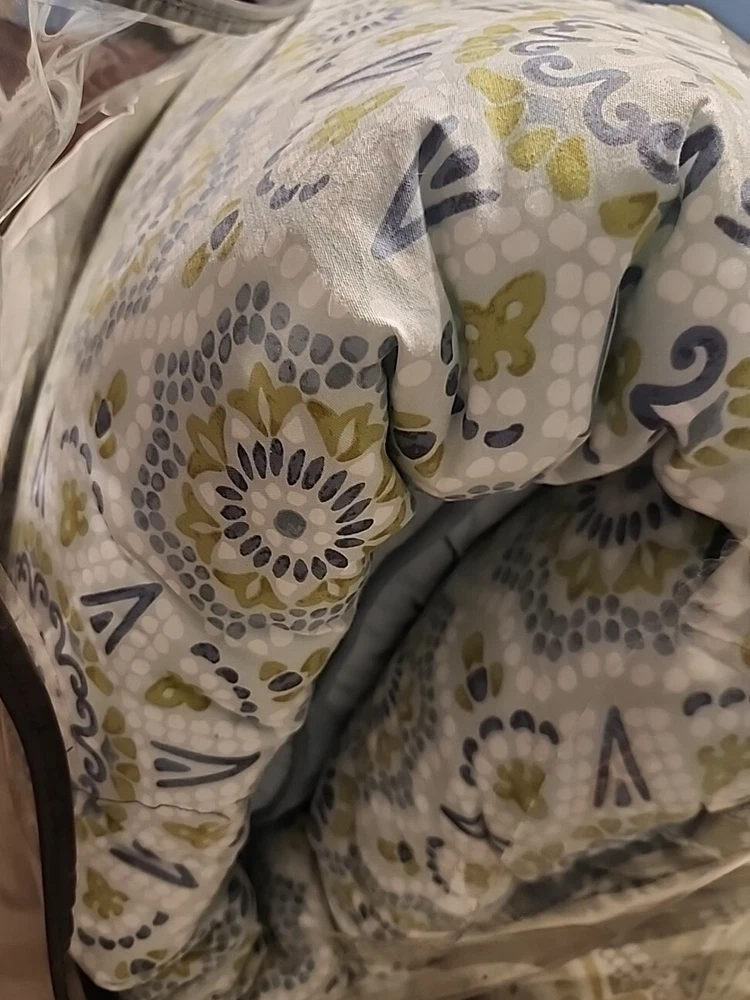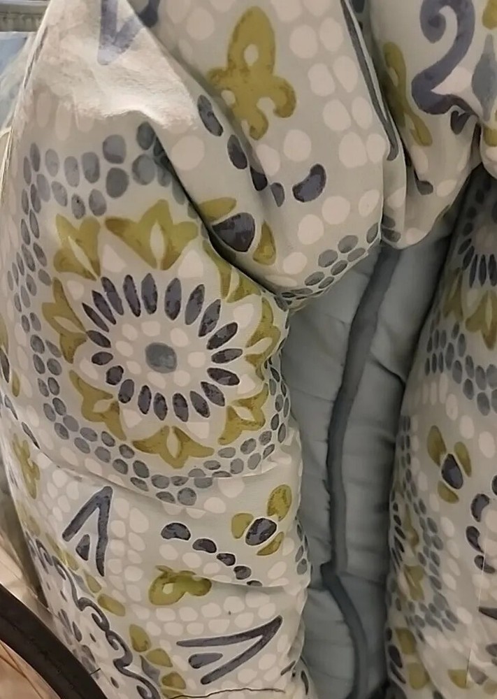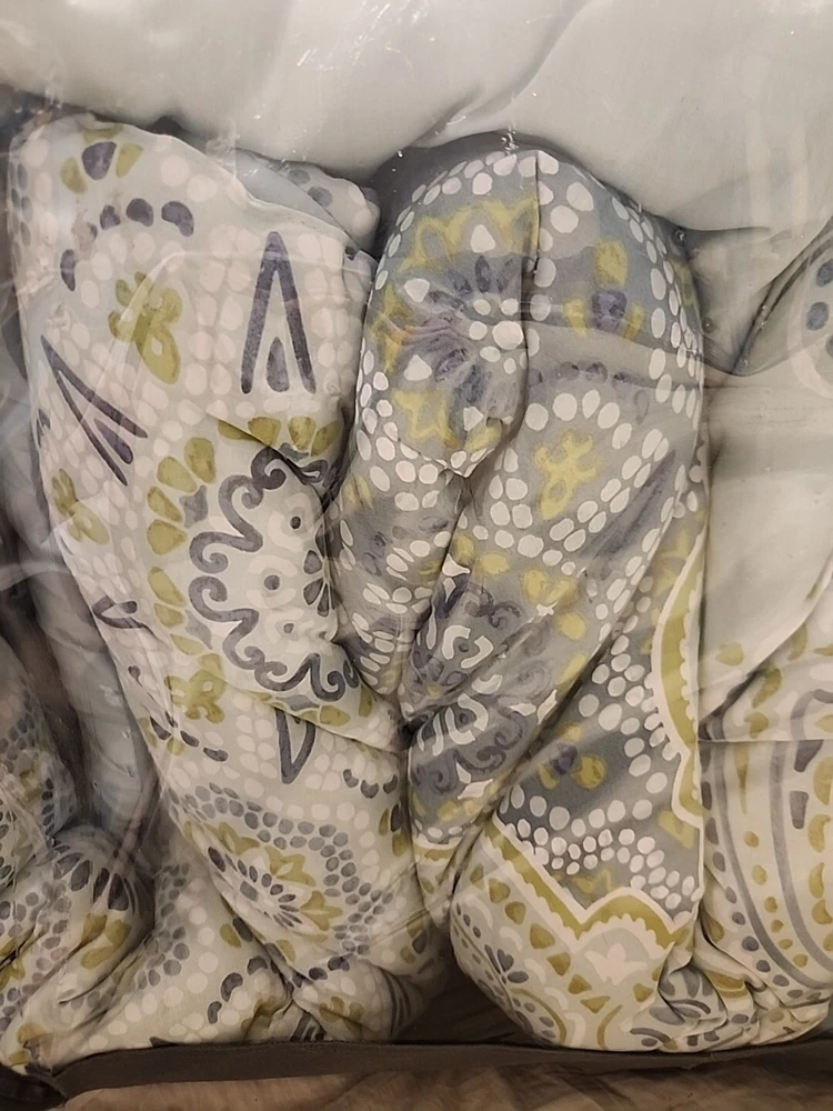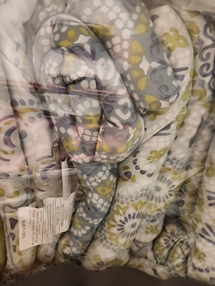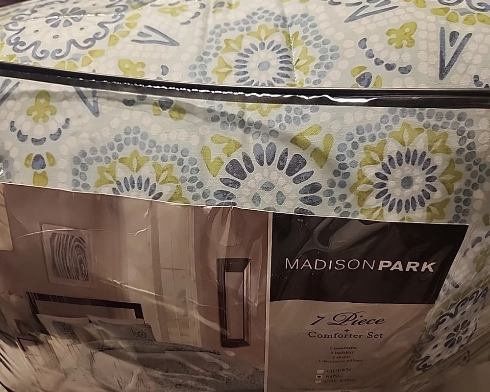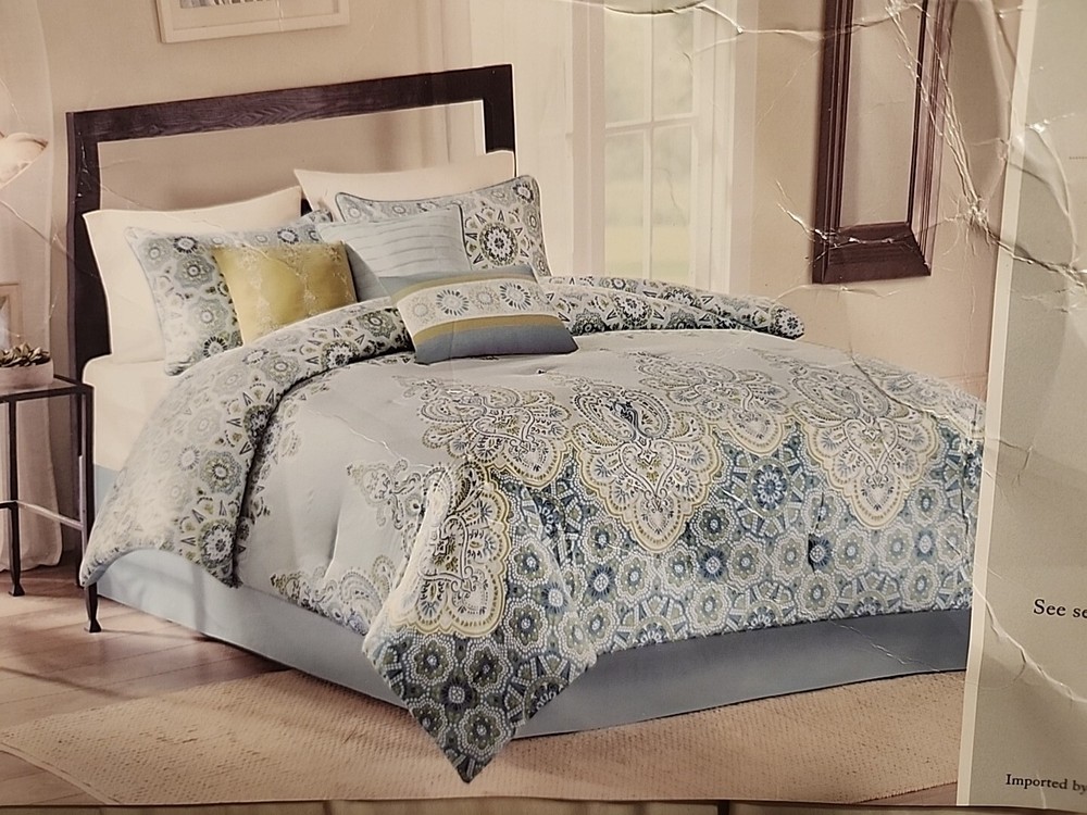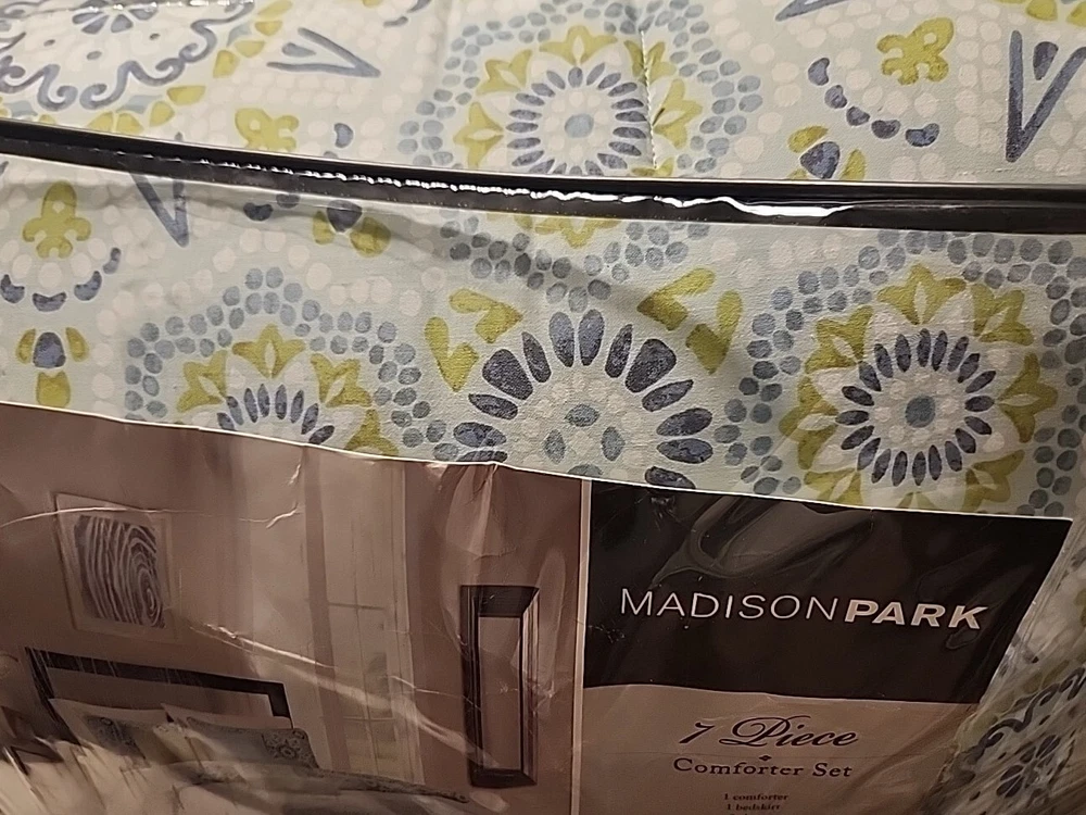 The item is New. The package is torn on the side and top. See pictures provided Thus 7 Piece blue/multi color King Comforter set includes Comforter, 1 bedksirt, 2 shams, 3 decorative pillows 100% Polyester MP10-1669 Package is ripped/spilt open on the side and top