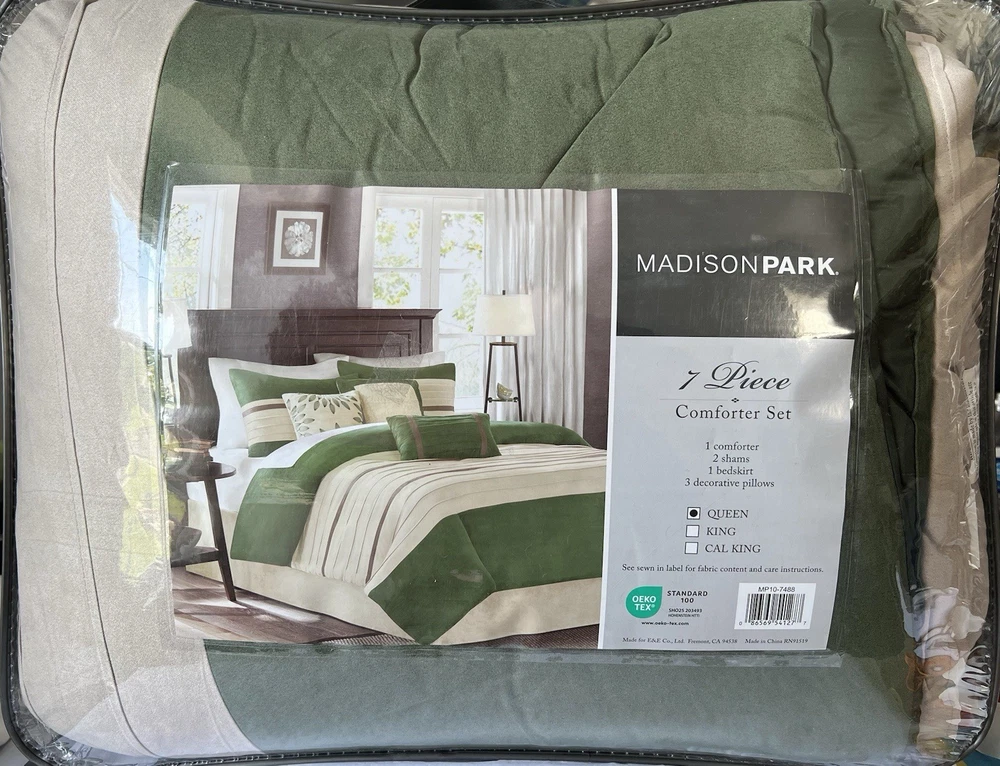 Elevate your bedroom with the Madison Park 7 Piece Comforter Set, a complete bedding ensemble that combines comfort and style. The set features a contemporary block pattern in a rich green hue, creating a bold and inviting ambiance. It's crafted with a blend of polyester, microfiber, and faux suede, offering a soft yet durable texture that's machine washable for easy care. The set includes a queen-sized comforter, pillow shams, a decorative pillow, and a bed skirt, ensuring a coordinated look. Designed to accommodate all seasons, the hypoallergenic fill material provides year-round insulation. This Palmer model set is a perfect fit for both teens and adults, making it an ideal choice for anyone looking to refresh their bedroom decor with a touch of family warmth.