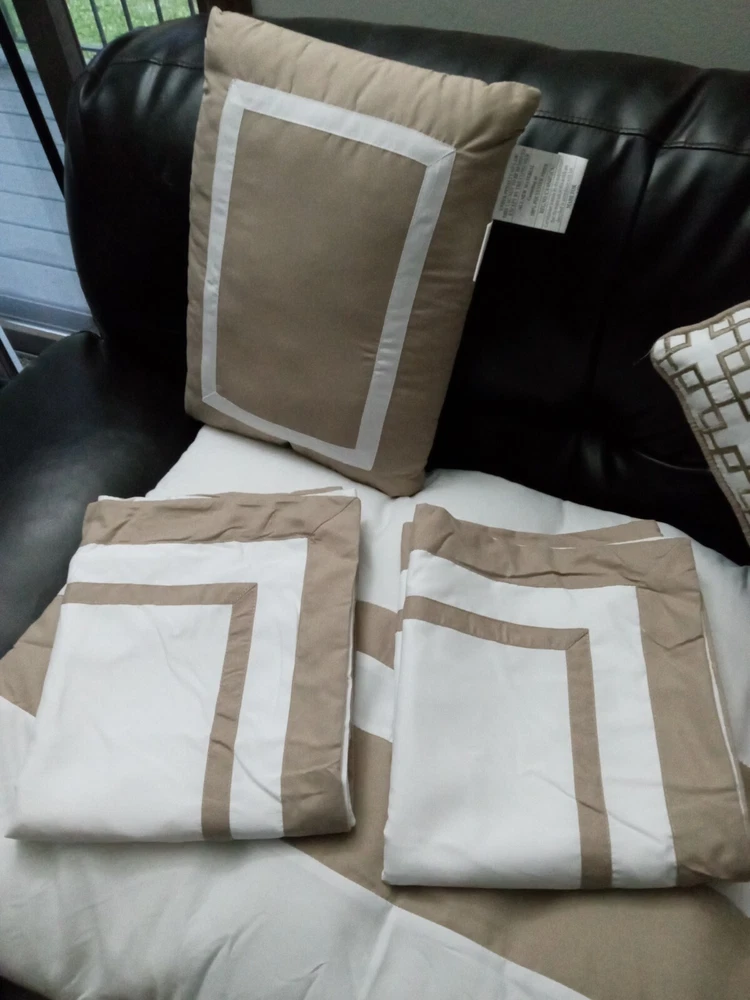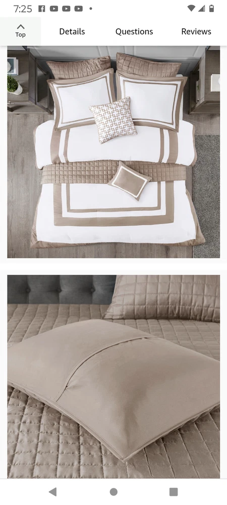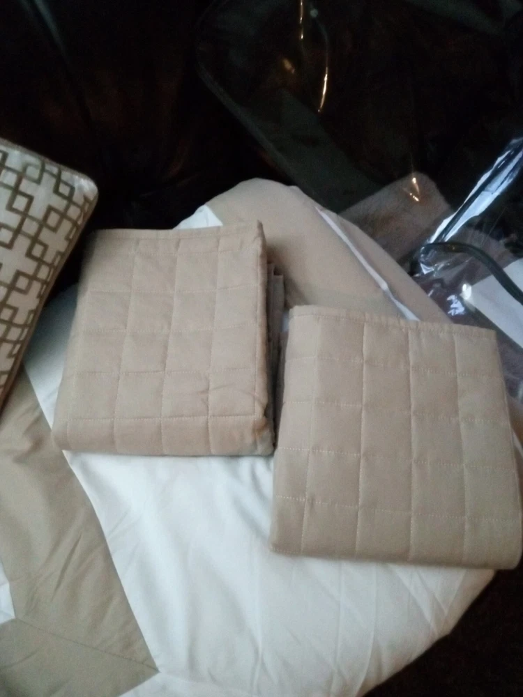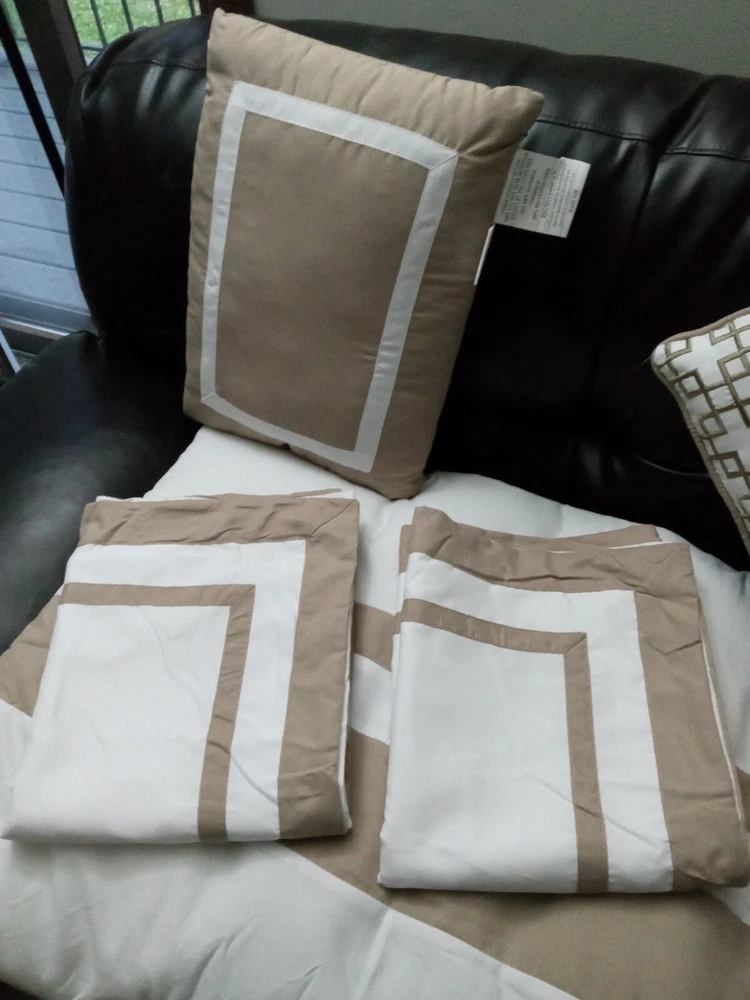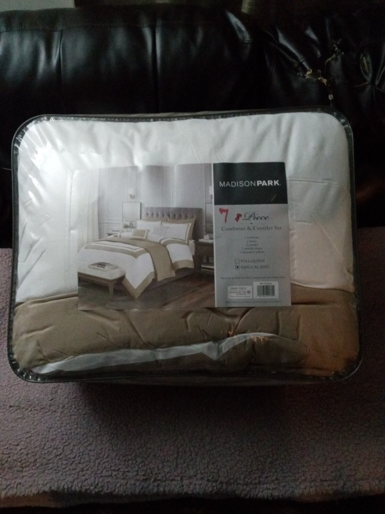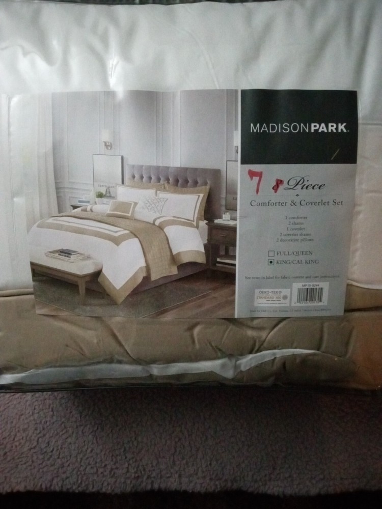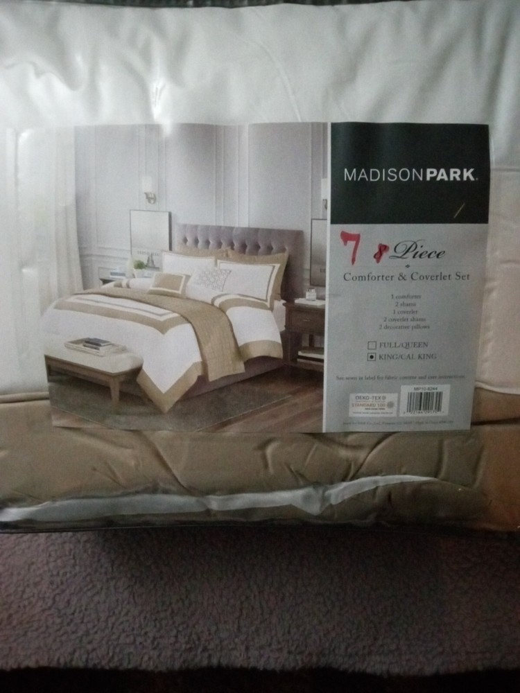 Add a touch of contemporary style to your bedroom with this Madison Park 7 Piece Comforter Set in King size. The set includes a decorative pillow, pillow sham, and comforter, all made of lightweight and breathable polyester material. The Taupe and White block pattern adds a subtle yet stylish touch to your bedding. This comforter set is machine washable and is perfect for those who want a comfortable and stylish addition to their bedding. The set is 92 inches in length and 104 inches in width, making it suitable for any king-sized bed. Get this Madison Park comforter set today and transform your bedroom into a cozy and stylish sanctuary.. Comforter 104'w x 92'l, #4 Standard Shams 20'w x 36'l, #1 Pillow 16'w x 16'l, #1 Pillow 12'w x 16'l . PLEASE READ, there is not a coverlet in this set. It's shown on the comforter bag, but it is not included. This is a 7 piece set. Thank You
