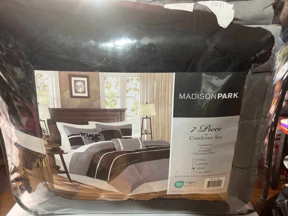Elevate your bedroom decor with this Madison Park seven-piece comforter set. The luxurious black finish adds a touch of elegance to your bedding. The set includes a decorative pillow, sham, comforter, and bed skirt, all made of 100% polyester material that is machine washable for easy maintenance. Ideal for teens, adults, and kids, this traditional style comforter set is perfect for any bedroom theme. The stripes pattern adds a classic touch to your bedding. The set is made in China and features a no closure type. Upgrade your bedding with this Madison Park comforter set and experience the ultimate comfort.