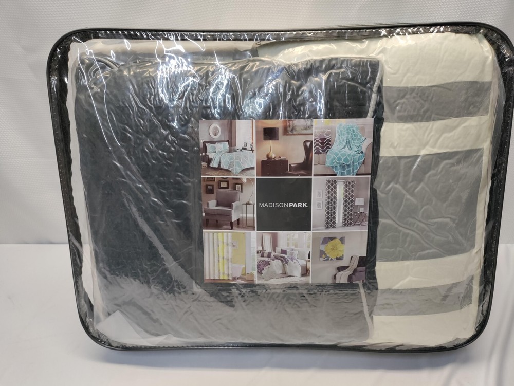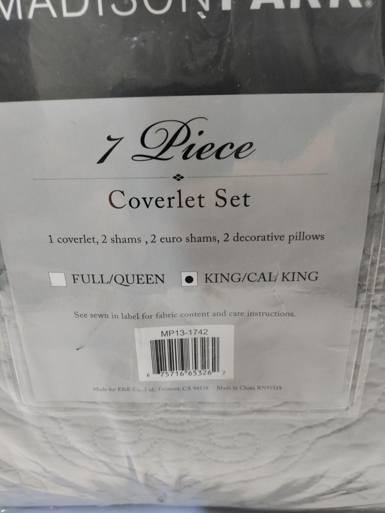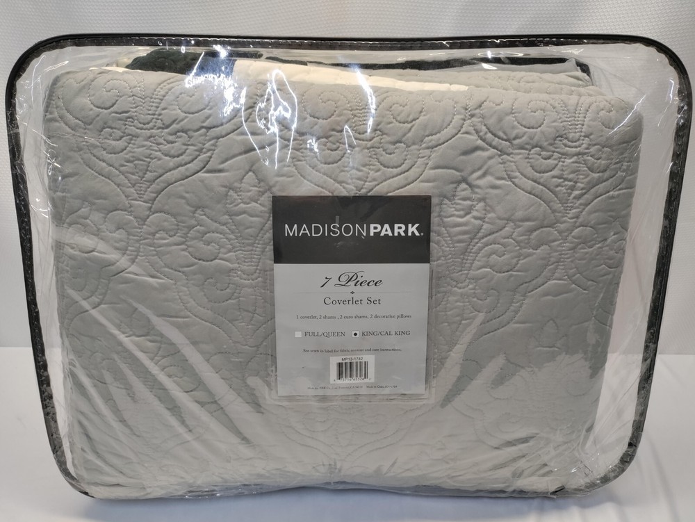 Madison Park Attingham 7-Piece King/California King Reversible Coverlet Set Brand New In Package UPC : 675716653262 The Attingham 7 Piece Reversible Coverlet Set is Set in a Black, Ivory and Grey, all Working Together to Create this Beautiful Neutral Colorway. The Black and Grey Portions of the Coverlet Have an Intricate Woven Design that add Dimension to this Coverlet. Made from 100% Polyester, this Coverlet will be Easy to Care for and Keep you Cozy all Year Round. Woven Design Made of Polyester, Cotton and Microfiber Traditional Style 2 Decorative Pillows: 16x16" / 12x18" 2 King Shams: 20x36+2" (2) 1 Coverlet: 104x94" 2 Euro Shams: 26x26+2" (2) PART OF A MAJOR RETAILER BUYOUT. PACKAGING MAY SHOW SIGNS OF SHELF WEAR HAVE MINOR DAMAGE OR BE DUSTY FROM STORAGE. ALL ITEMS ARE NEW UNLESS NOTED OTHERWISE.PLEASE SEE PICTURES FORBOX QUALITY OR PLEASE ASK FOR ADDITIONAL PHOTOS. WE WILL COMBINE SHIPPING IF YOU PURCHASE MORE THAN ONE ITEM FROM OUR STORE. ITEMS MUST BE PAID FOR IN THE SAME TRANSACTION TO SHIP TOGETHER AND BE COMBINED. S H I P P I N G & H A N D L I N G: Please note that Delivery Dates provided by eBay & the Shipping Carrier for Standard, Expedited & Overnight Shipping are only ESTIMATES, and are subject to variability. Once an item is dropped off with the Shipping Carrier, we are unable to control the speed of delivery, thus we cannot guarantee that a package will arrive on an exact date. Shipping estimates are best estimated using the guidelines provided below, as they are generated based on analysis of my extensive selling history. • For Shipping Purposes, Business Days are Monday-Friday 9am-12pm(Eastern Time) No shipments on Weekends & Holidays. • If another form of shipment is needed, (i.e –Overnight, Expedited,etc.) Buyer is Responsible U N S U C C E S S F U L SHIPPING In the case your item needs to be intercepted (I.E Incorrect Address) or the package is returned to us, due to UTF or RTS. BUYER IS RESPONSIBLE FOR SECOND SHIPMENT. You will be invoiced via PayPal ; PAYMENT IS DUE BEFORE SHIPPING OUT A 2ND TIME. O F F E R S Offers will be seen Sunday-Thursday from 9am to 6pm Eastern Standard Time Fridays from 9am - 4pm Eastern Standard Time ** EXCLUDING HOLIDAYS ** ** OFFERS WILL NOT BE SEEN / VIEWED ON SATURDAYS ** ( as we’re out of the office ) ALL Winning offers have 48 Business* hours to pay their invoices - Please see above for Hours of Business * After 48 Business hours, orders will be canceled and re-listed R E T U R N S In the case you ordered the incorrect Size, please message us prior to opening a return as we may be able to exchange for the size you need ALL Returns need to arrive in the exact condition it was shipped out in (New,Sealed,Etc.) ANY Item that has been tampered with, is subject to No Refund F E E D B A C K • We are committed to providing an easy, efficient & worry-free shopping experience and ensuring 100% customer satisfaction. • We will happily leave 5-Star Positive Feedback for our customers upon a successfully completed transaction. • Please be sure to leave us 5-Star Positive Feedback once you receive the item! If at any time during your purchasing process you feel you are not 100% satisfied, please contact us and,we will respond as soon as possible. JS