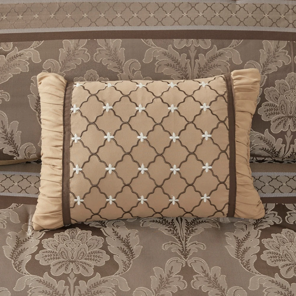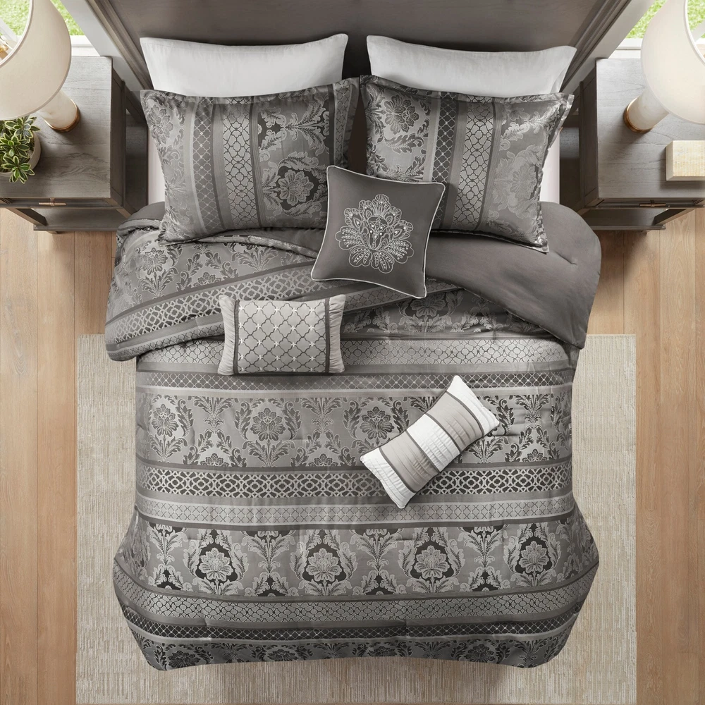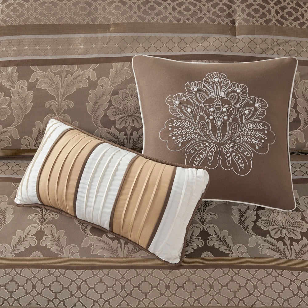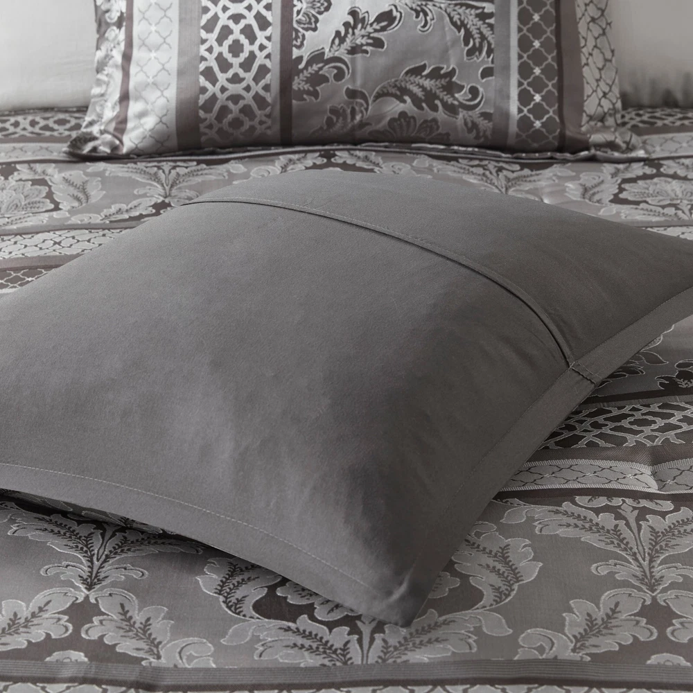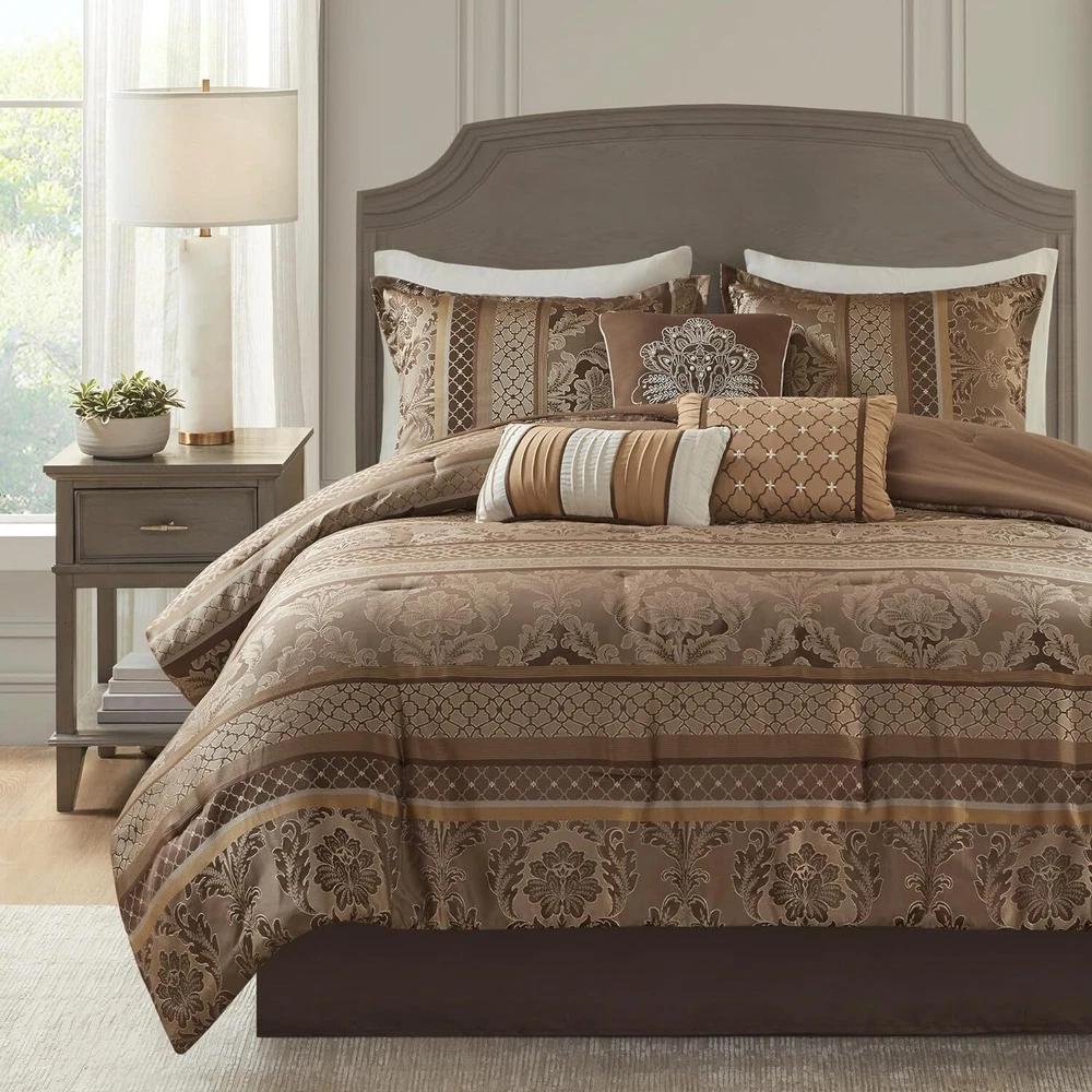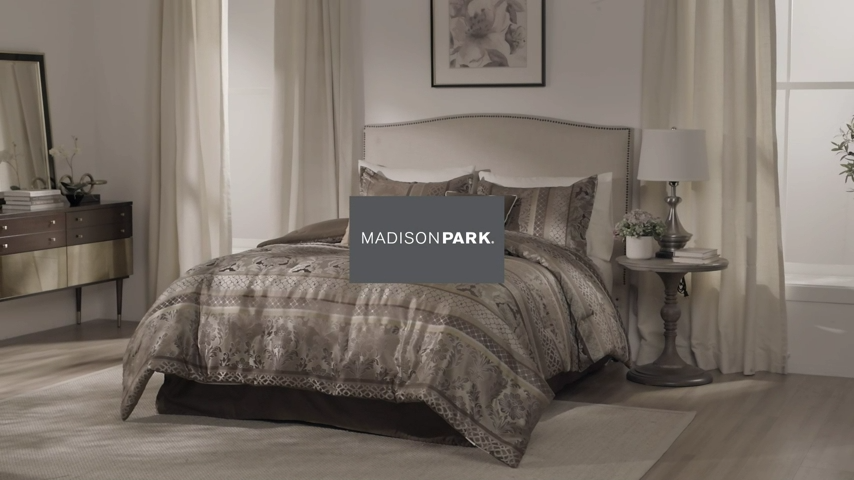 Store Categories Store Categories Bedding Comforters Decorative Pillows Duvet Covers Quilts & Coverlets Sheets Blankets & Throws Mattress Pads Pillows Home Decor Window Treatments Wall Art Home Accents Furniture Beds Dining Seating Ottomans & Benches Accent Chairs Accent Tables Dining Tables Sofas Bath Bath Robes Shower Curtains Towels Bath Rugs Bath Accessories Apparel Pajama Sets Nightgowns Rugs Rugs & Carpets Lighting Lamp Pendant Other Product Overview Details DESCRIPTION The Madison Park Bellagio 7 Piece Comforter Set offers a luxurious update to your room. Made from polyester jacquard, the comforter and shams share leaf, striping and ironwork motifs that add a touch of richness to your current decor. Pops of lustre are also used throughout this collection adding a lavish feeling to your decor. Three decorative pillows feature pleating and embroidery details that correspond back to the comforter, while a rich bedskirt helps bring the entire look together. FEATURES • Set includes comforter, 2 shams, 1 bedskirt, and 3 throw pillows • Made from high-quality polyester jacquard for durability and a luxurious feel • Features leaf, striping, and ironwork motifs accentuated by elegant stitching for an eye-catching design • Pops of gold throughout the collection add a lavish feeling to your décor • Three decorative pillows feature pleating and embroidery details • Items may come in compressed packaging to ensure efficient shipping • Items will need to be fluffed up and steam ironed if compressed MATERIAL polyester jacquard, 8oz/sq yard polyester filling, microfiber bedskirt, embroidered decorative pillows ; Available Sizes: Queen Comforter Set includes: 1 Comforter: 90"W x 90"L 2 Standard Shams: 20"W x 26"L + 1"D 1 Bedskirt: 60"W x 80"L + 15"D 1 Decorative Pillow: 16"W x 16"L 1 Decorative Pillow: 12"W x 18"L 1 Decorative Pillow: 10"W x 18"L King Comforter Set includes: 1 Comforter: 104"W x 92"L 2 King Shams: 20"W x 36"L + 1"D 1 Bedskirt: 78"W x 80"L + 15"D 1 Decorative Pillow: 16"W x 16"L 1 Decorative Pillow: 12"W x 18"L 1 Decorative Pillow: 10"W x 18"L California King Comforter Set includes: 1 Comforter: 104"W x 92"L 2 King Shams: 20"W x 36"L + 1"D 1 Bedskirt: 72"W x 84"L + 15"D 1 Decorative Pillow: 16"W x 16"L 1 Decorative Pillow: 12"W x 18"L 1 Decorative Pillow: 10"W x 18"L Bedding Comforters Decorative Pillows Duvet Covers Quilts & Coverlets Sheets Blankets & Throws Mattress Pads Pillows Home Decor Window Treatments Wall Art Home Accents Furniture Beds Dining Seating Ottomans & Benches Accent Chairs Accent Tables Dining Tables Sofas Bath Bath Robes Shower Curtains Towels Bath Rugs Bath Accessories Rugs Rugs & Carpets Lighting Lamp Pendant Product Overview Product Details DESCRIPTION The Madison Park Bellagio 7 Piece Comforter Set offers a luxurious update to your room. Made from polyester jacquard, the comforter and shams share leaf, striping and ironwork motifs that add a touch of richness to your current decor. Pops of lustre are also used throughout this collection adding a lavish feeling to your decor. Three decorative pillows feature pleating and embroidery details that correspond back to the comforter, while a rich bedskirt helps bring the entire look together. FEATURES • Set includes comforter, 2 shams, 1 bedskirt, and 3 throw pillows • Made from high-quality polyester jacquard for durability and a luxurious feel • Features leaf, striping, and ironwork motifs accentuated by elegant stitching for an eye-catching design • Pops of gold throughout the collection add a lavish feeling to your décor • Three decorative pillows feature pleating and embroidery details • Items may come in compressed packaging to ensure efficient shipping • Items will need to be fluffed up and steam ironed if compressed MATERIAL polyester jacquard, 8oz/sq yard polyester filling, microfiber bedskirt, embroidered decorative pillows ; Available Sizes: Queen Comforter Set includes: 1 Comforter: 90"W x 90"L 2 Standard Shams: 20"W x 26"L + 1"D 1 Bedskirt: 60"W x 80"L + 15"D 1 Decorative Pillow: 16"W x 16"L 1 Decorative Pillow: 12"W x 18"L 1 Decorative Pillow: 10"W x 18"L King Comforter Set includes: 1 Comforter: 104"W x 92"L 2 King Shams: 20"W x 36"L + 1"D 1 Bedskirt: 78"W x 80"L + 15"D 1 Decorative Pillow: 16"W x 16"L 1 Decorative Pillow: 12"W x 18"L 1 Decorative Pillow: 10"W x 18"L California King Comforter Set includes: 1 Comforter: 104"W x 92"L 2 King Shams: 20"W x 36"L + 1"D 1 Bedskirt: 72"W x 84"L + 15"D 1 Decorative Pillow: 16"W x 16"L 1 Decorative Pillow: 12"W x 18"L 1 Decorative Pillow: 10"W x 18"L