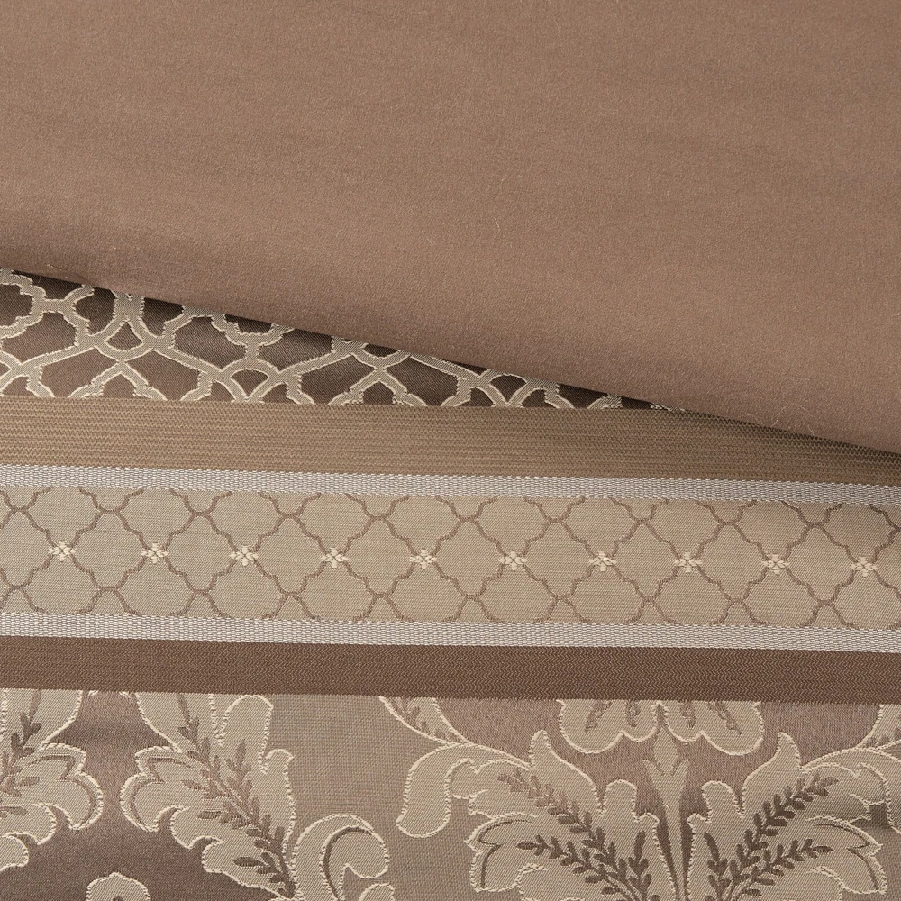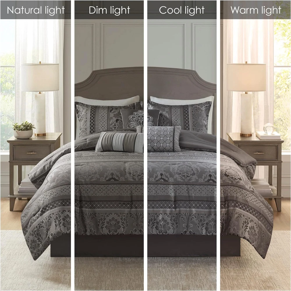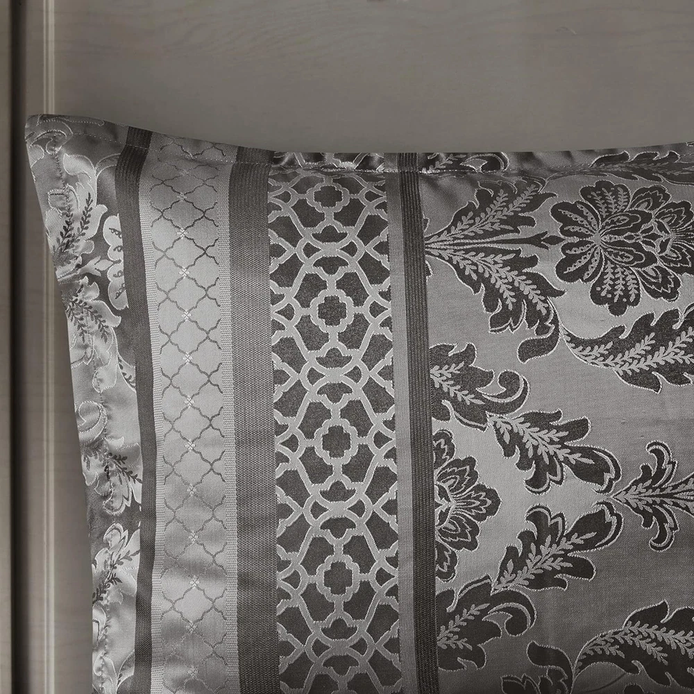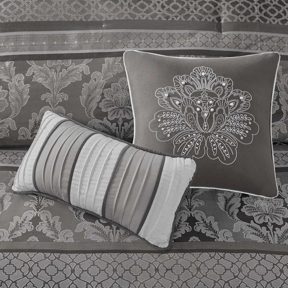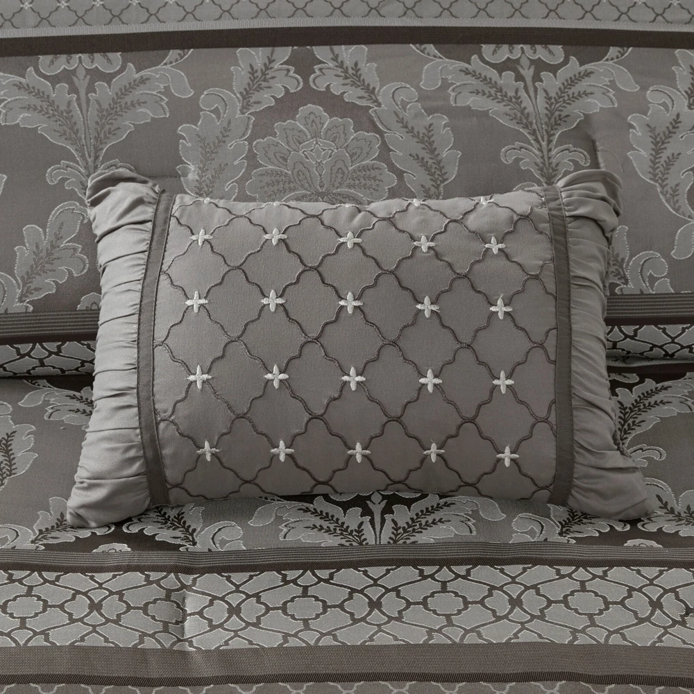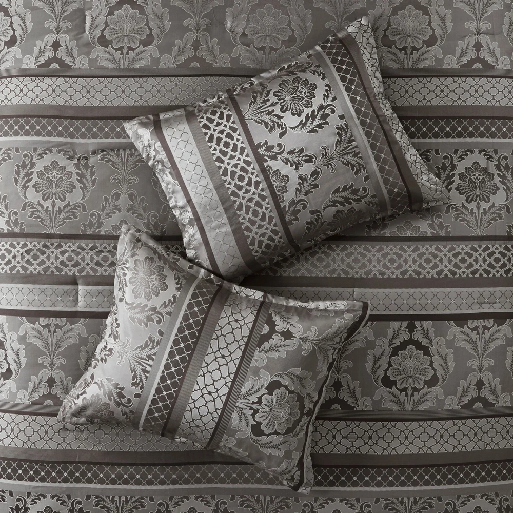 Store Categories Store Categories Bedding Comforters Decorative Pillows Duvet Covers Quilts & Coverlets Sheets Blankets & Throws Mattress Pads Pillows Home Decor Window Treatments Wall Art Home Accents Furniture Beds Dining Seating Ottomans & Benches Accent Chairs Accent Tables Dining Tables Sofas Bath Bath Robes Shower Curtains Towels Bath Rugs Bath Accessories Apparel Pajama Sets Nightgowns Rugs Rugs & Carpets Lighting Lamp Pendant Other Product Overview Details DESCRIPTION The Madison Park Bellagio 7 Piece Comforter Set offers a luxurious update to your room. Made from polyester jacquard, the comforter and shams share leaf, striping and ironwork motifs that add a touch of richness to your current decor. Pops of lustre are also used throughout this collection adding a lavish feeling to your decor. Three decorative pillows feature pleating and embroidery details that correspond back to the comforter, while a rich bedskirt helps bring the entire look together. FEATURES • Set includes comforter, 2 shams, 1 bedskirt, and 3 throw pillows • Made from high-quality polyester jacquard for durability and a luxurious feel • Features leaf, striping, and ironwork motifs accentuated by elegant stitching for an eye-catching design • Pops of gold throughout the collection add a lavish feeling to your décor • Three decorative pillows feature pleating and embroidery details • Items may come in compressed packaging to ensure efficient shipping • Items will need to be fluffed up and steam ironed if compressed MATERIAL polyester jacquard, 8oz/sq yard polyester filling, microfiber bedskirt, embroidered decorative pillows ; Available Sizes: Queen Comforter Set includes: 1 Comforter: 90"W x 90"L 2 Standard Shams: 20"W x 26"L + 1"D 1 Bedskirt: 60"W x 80"L + 15"D 1 Decorative Pillow: 16"W x 16"L 1 Decorative Pillow: 12"W x 18"L 1 Decorative Pillow: 10"W x 18"L King Comforter Set includes: 1 Comforter: 104"W x 92"L 2 King Shams: 20"W x 36"L + 1"D 1 Bedskirt: 78"W x 80"L + 15"D 1 Decorative Pillow: 16"W x 16"L 1 Decorative Pillow: 12"W x 18"L 1 Decorative Pillow: 10"W x 18"L California King Comforter Set includes: 1 Comforter: 104"W x 92"L 2 King Shams: 20"W x 36"L + 1"D 1 Bedskirt: 72"W x 84"L + 15"D 1 Decorative Pillow: 16"W x 16"L 1 Decorative Pillow: 12"W x 18"L 1 Decorative Pillow: 10"W x 18"L Bedding Comforters Decorative Pillows Duvet Covers Quilts & Coverlets Sheets Blankets & Throws Mattress Pads Pillows Home Decor Window Treatments Wall Art Home Accents Furniture Beds Dining Seating Ottomans & Benches Accent Chairs Accent Tables Dining Tables Sofas Bath Bath Robes Shower Curtains Towels Bath Rugs Bath Accessories Rugs Rugs & Carpets Lighting Lamp Pendant Product Overview Product Details DESCRIPTION The Madison Park Bellagio 7 Piece Comforter Set offers a luxurious update to your room. Made from polyester jacquard, the comforter and shams share leaf, striping and ironwork motifs that add a touch of richness to your current decor. Pops of lustre are also used throughout this collection adding a lavish feeling to your decor. Three decorative pillows feature pleating and embroidery details that correspond back to the comforter, while a rich bedskirt helps bring the entire look together. FEATURES • Set includes comforter, 2 shams, 1 bedskirt, and 3 throw pillows • Made from high-quality polyester jacquard for durability and a luxurious feel • Features leaf, striping, and ironwork motifs accentuated by elegant stitching for an eye-catching design • Pops of gold throughout the collection add a lavish feeling to your décor • Three decorative pillows feature pleating and embroidery details • Items may come in compressed packaging to ensure efficient shipping • Items will need to be fluffed up and steam ironed if compressed MATERIAL polyester jacquard, 8oz/sq yard polyester filling, microfiber bedskirt, embroidered decorative pillows ; Available Sizes: Queen Comforter Set includes: 1 Comforter: 90"W x 90"L 2 Standard Shams: 20"W x 26"L + 1"D 1 Bedskirt: 60"W x 80"L + 15"D 1 Decorative Pillow: 16"W x 16"L 1 Decorative Pillow: 12"W x 18"L 1 Decorative Pillow: 10"W x 18"L King Comforter Set includes: 1 Comforter: 104"W x 92"L 2 King Shams: 20"W x 36"L + 1"D 1 Bedskirt: 78"W x 80"L + 15"D 1 Decorative Pillow: 16"W x 16"L 1 Decorative Pillow: 12"W x 18"L 1 Decorative Pillow: 10"W x 18"L California King Comforter Set includes: 1 Comforter: 104"W x 92"L 2 King Shams: 20"W x 36"L + 1"D 1 Bedskirt: 72"W x 84"L + 15"D 1 Decorative Pillow: 16"W x 16"L 1 Decorative Pillow: 12"W x 18"L 1 Decorative Pillow: 10"W x 18"L