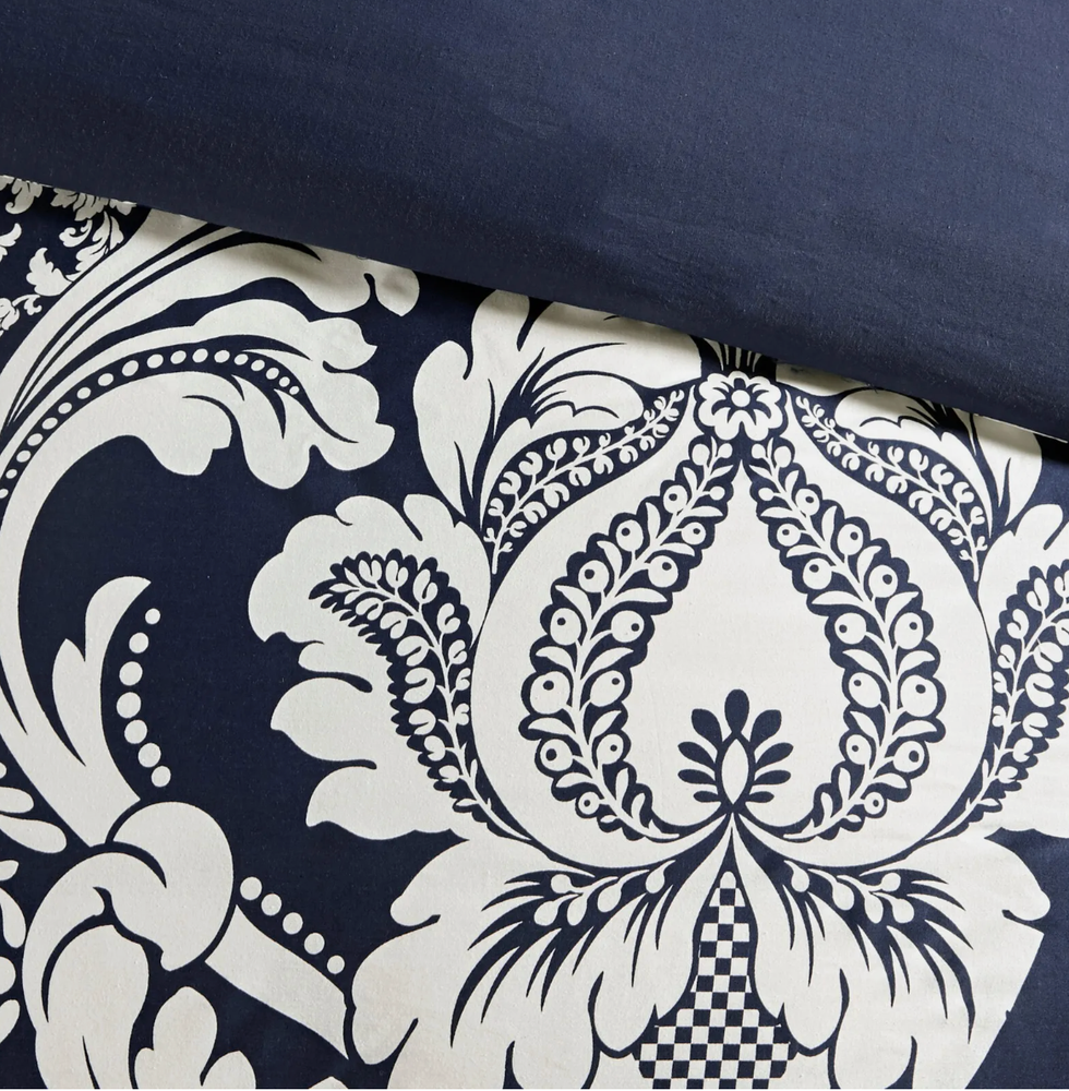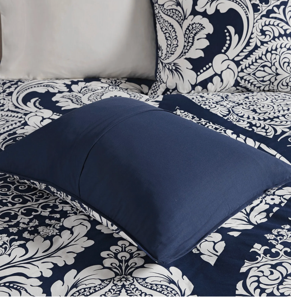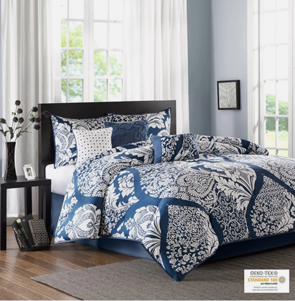 The Adela 7 Piece Cotton Printed Comforter Set offers an eye-catching update to your bedroom decor. A beautifully intricate damask pattern is flaunted across the comforter and shams, for a chic transitional look. The solid reverse perfectly complements the top of the bed, while the flange border adds a charming accent to the comforter. Three decorative pillows with embroidered details and fabric manipulation and a solid bed skirt complete the comforter set. Made from 100% cotton sateen, this bedding set is OEKO-TEX certified, meaning it does not contain any harmful substances or chemicals to ensure quality comfort and wellness. Dimensions: 24.02 in (L) x 19.29 in (W) x 17.32 in (H)
