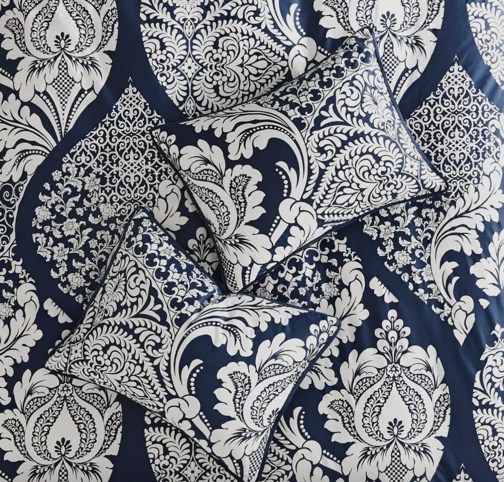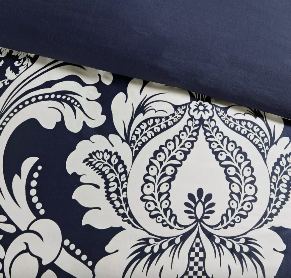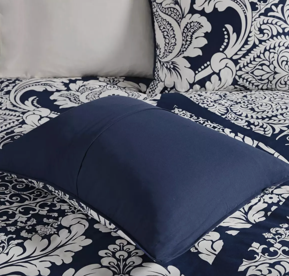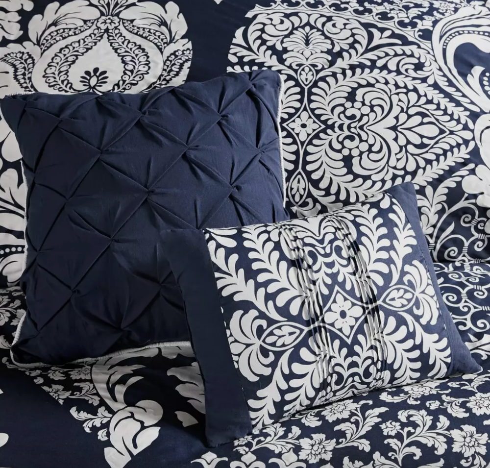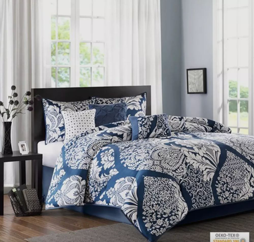 The Adela 7 Piece Cotton Printed Comforter Set offers an eye-catching update to your bedroom decor. A beautifully intricate damask pattern is flaunted across the comforter and shams, for a chic transitional look. The solid reverse perfectly complements the top of the bed, while the flange border adds a charming accent to the comforter. Three decorative pillows with embroidered details and fabric manipulation and a solid bed skirt complete the comforter set. Made from 100% cotton sateen, this bedding set is OEKO-TEX certified, meaning it does not contain any harmful substances or chemicals to ensure quality comfort and wellness. Dimensions: 24.02 in (L) x 19.29 in (W) x 17.32 in (H)