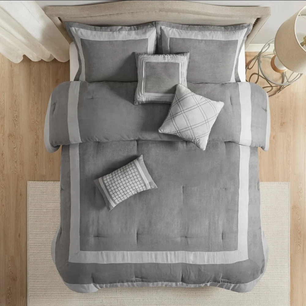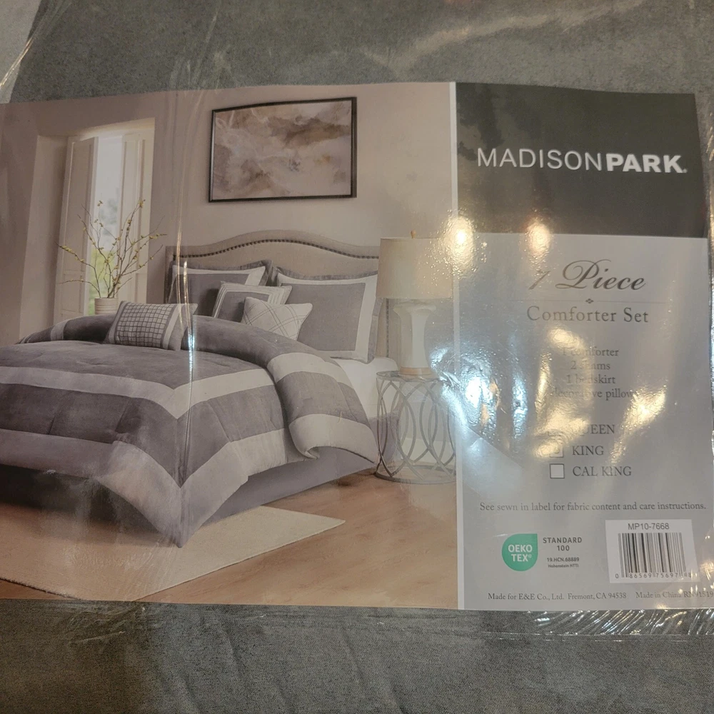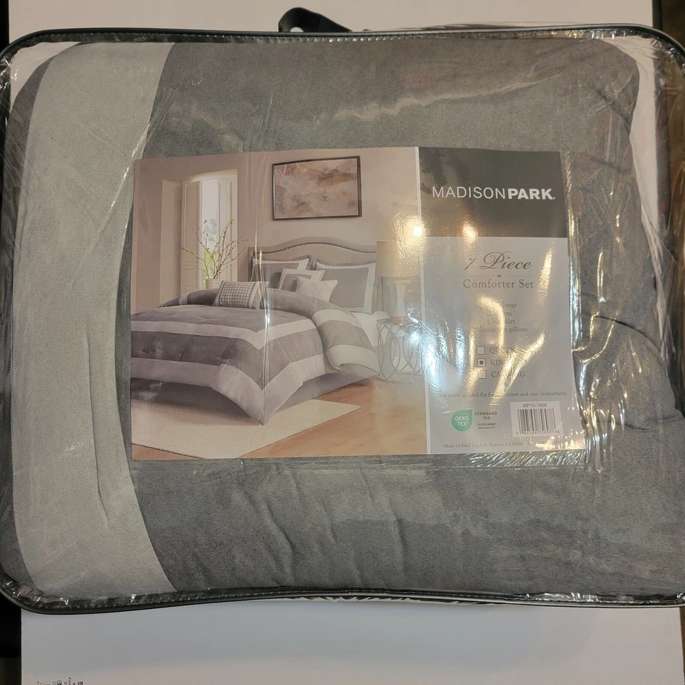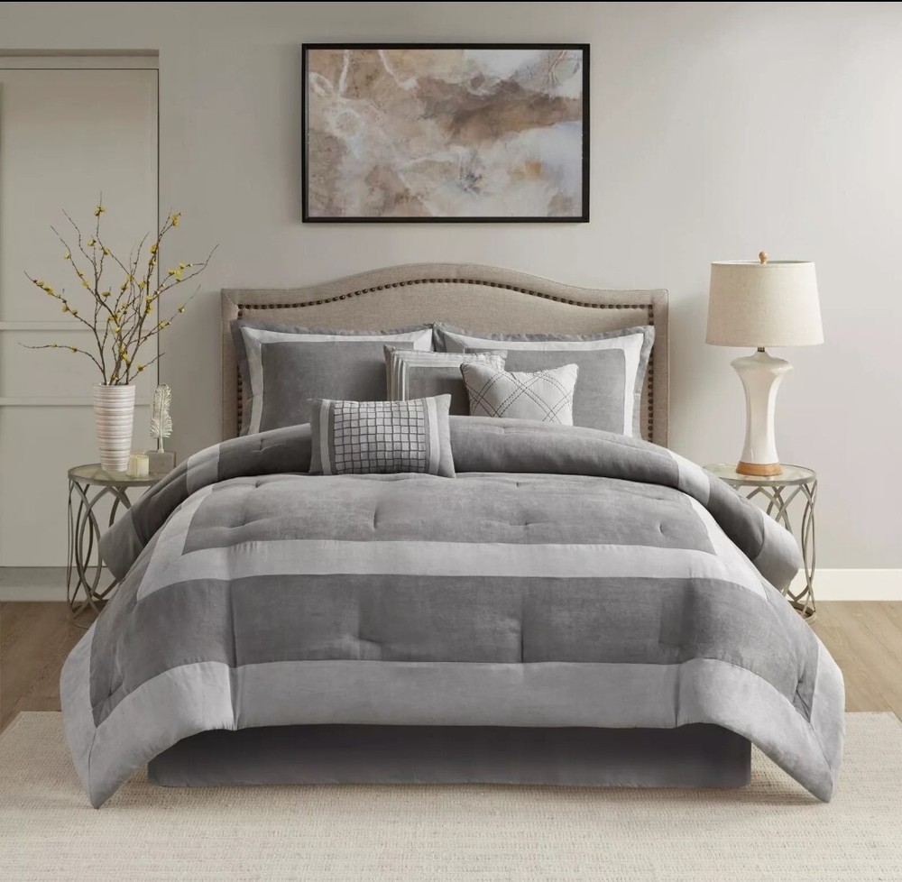 Upgrade your bedding with this Madison Park 7pc King Noah Microsuede Comforter Set in a stylish gray color. The set includes a decorative pillow, pillow sham, comforter, and bed skirt, all made from a cozy and hypoallergenic polyester and microfiber blend. Perfect for both teens and adults, this contemporary style comforter set is insulated for all seasons and features a block pattern. The Madison Park Dax model is made in China and is STANDARD 100 by OEKO-TEX certified. Machine wash care instructions make it easy to maintain. This comforter set is perfect for a modern bedroom and will provide a comfortable and stylish sleep experience. Transitional style 7 piece comforter set in microsuede fabric Unique pieced color blocking for a modern update Set includes: 1 Comforter:104"W x 92"L 2 King Shams:20"W x 36"L(2) 1 Bed Skirt:78"W x 80"L + 15"D 3 Decorative Pillows:16"W x 16"L/12"W x 18"L/18"W x 18"L Hypoallergenic polyester filling in the comforter and pillows Machine washable and steam iron for wrinkle removal Retail $280