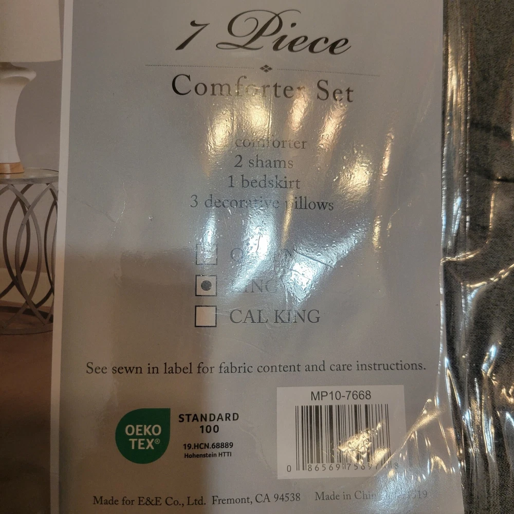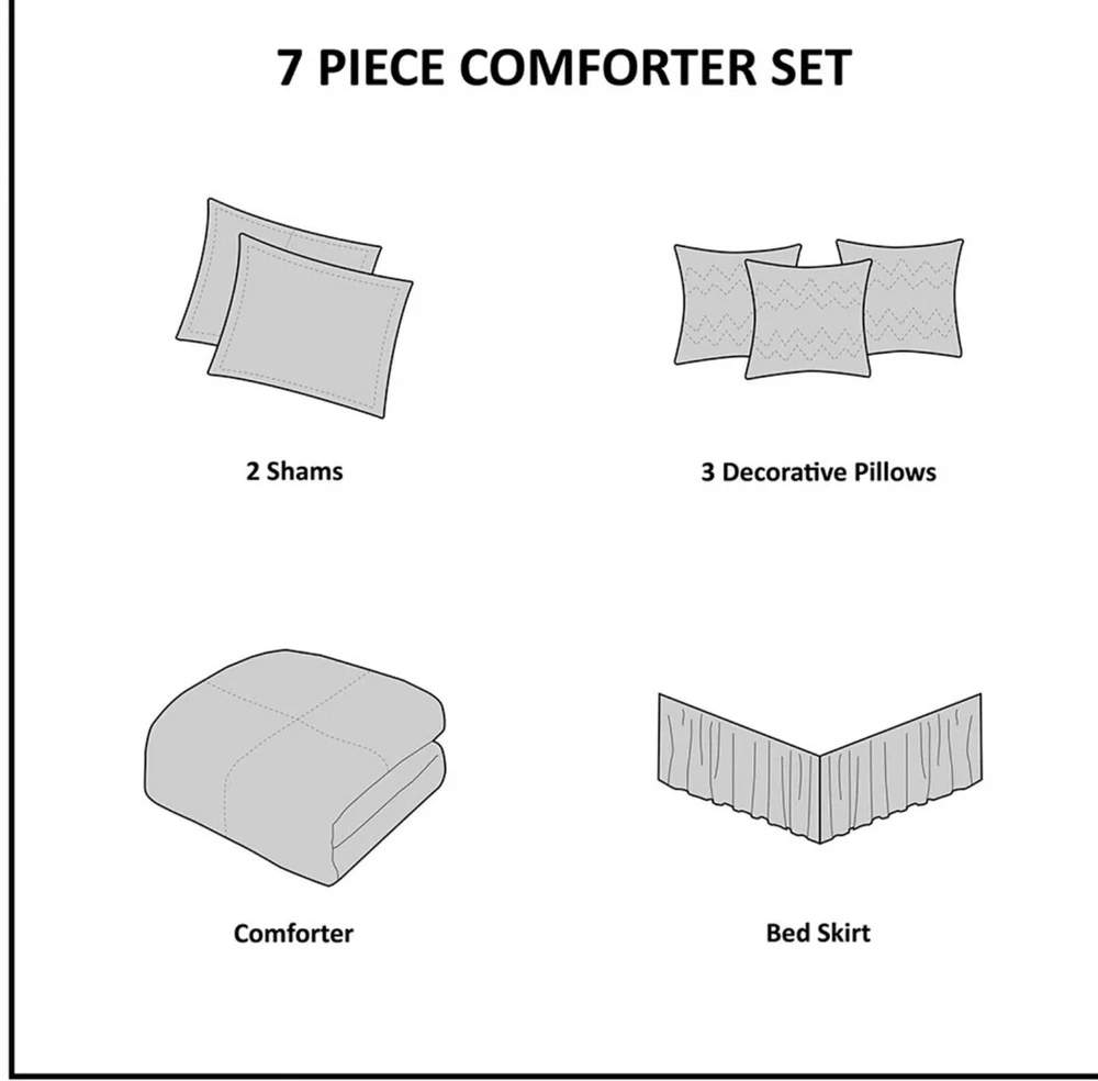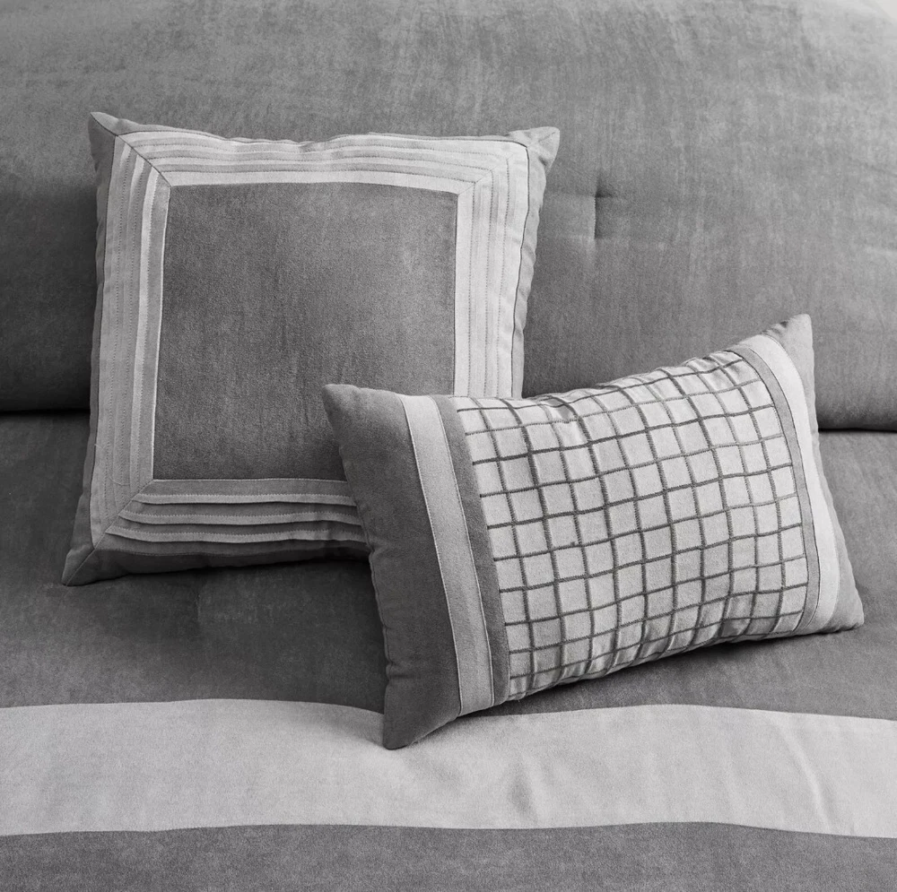 Upgrade your bedding with this Madison Park 7pc King Noah Microsuede Comforter Set in a stylish gray color. The set includes a decorative pillow, pillow sham, comforter, and bed skirt, all made from a cozy and hypoallergenic polyester and microfiber blend. Perfect for both teens and adults, this contemporary style comforter set is insulated for all seasons and features a block pattern. The Madison Park Dax model is made in China and is STANDARD 100 by OEKO-TEX certified. Machine wash care instructions make it easy to maintain. This comforter set is perfect for a modern bedroom and will provide a comfortable and stylish sleep experience. Transitional style 7 piece comforter set in microsuede fabric Unique pieced color blocking for a modern update Set includes: 1 Comforter:104"W x 92"L 2 King Shams:20"W x 36"L(2) 1 Bed Skirt:78"W x 80"L + 15"D 3 Decorative Pillows:16"W x 16"L/12"W x 18"L/18"W x 18"L Hypoallergenic polyester filling in the comforter and pillows Machine washable and steam iron for wrinkle removal Retail $280