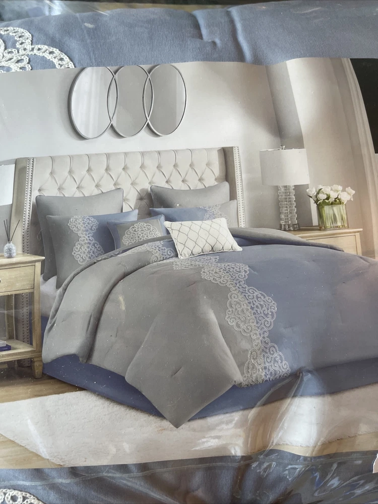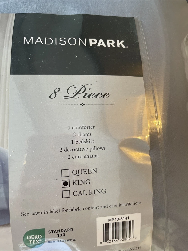 Upgrade your bedding collection with this Madison Park 8 Piece Embroidered Microfiber Comforter Set in blue. The set includes a king size comforter, decorative pillow, pillow sham, and bed skirt, all made of hypoallergenic polyester and microfiber material. The block pattern adds a contemporary touch to your bedroom decor, while the all-season insulation makes it perfect for winter. This comforter set is machine washable and certified STANDARD 100 by OEKO-TEX, ensuring both quality and durability. Ideal for teens and adults, it is a perfect addition to any bedroom. Add this stylish and comfortable comforter set to your collection today!