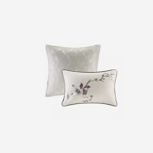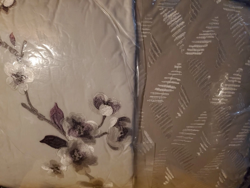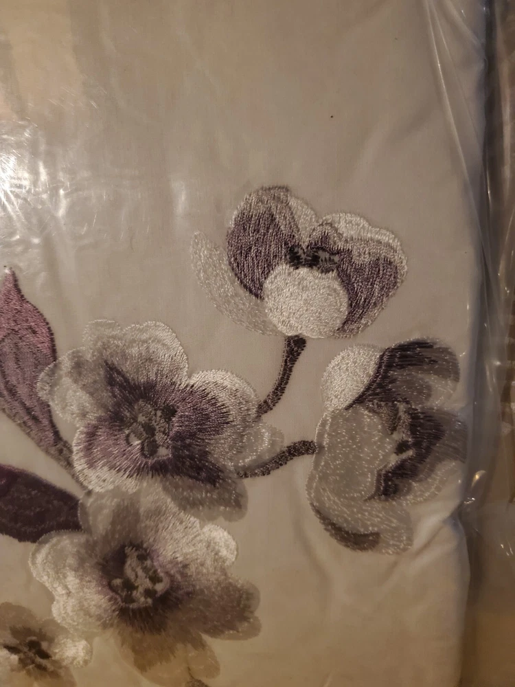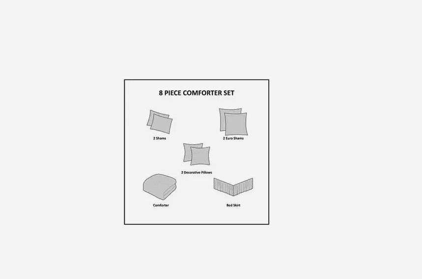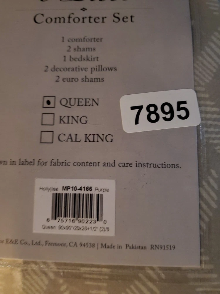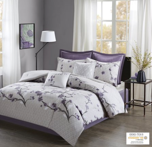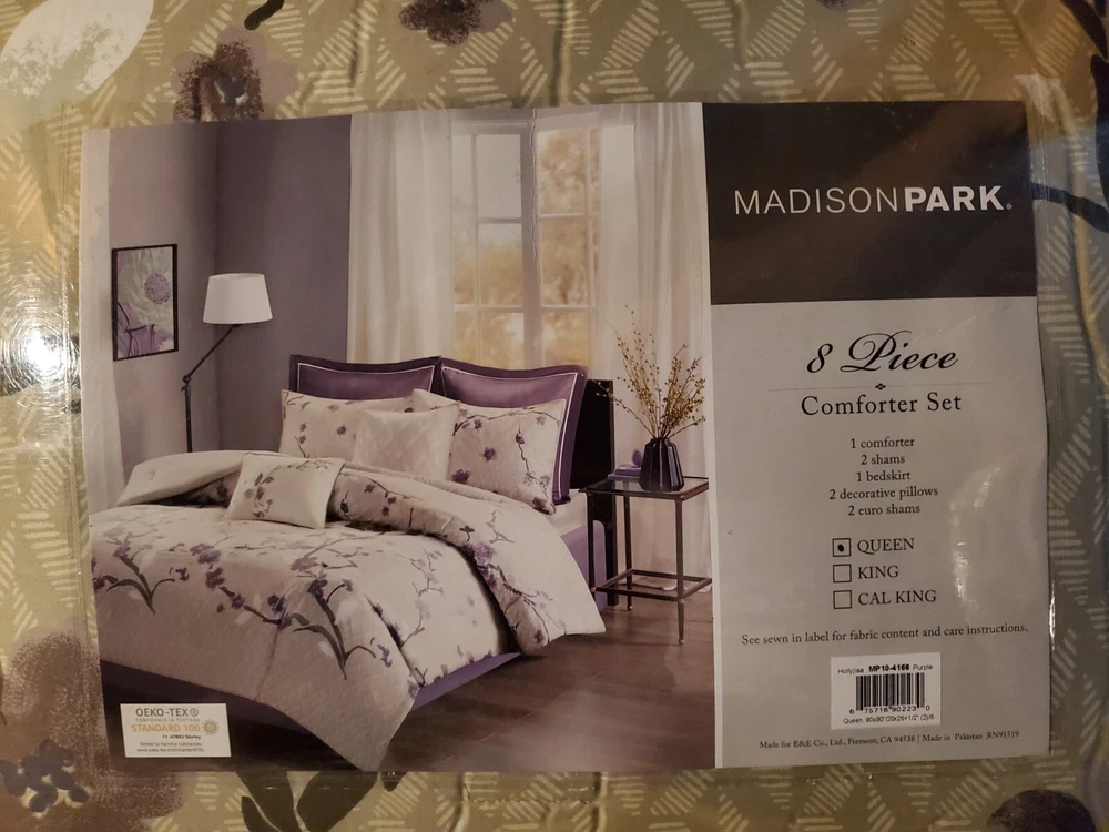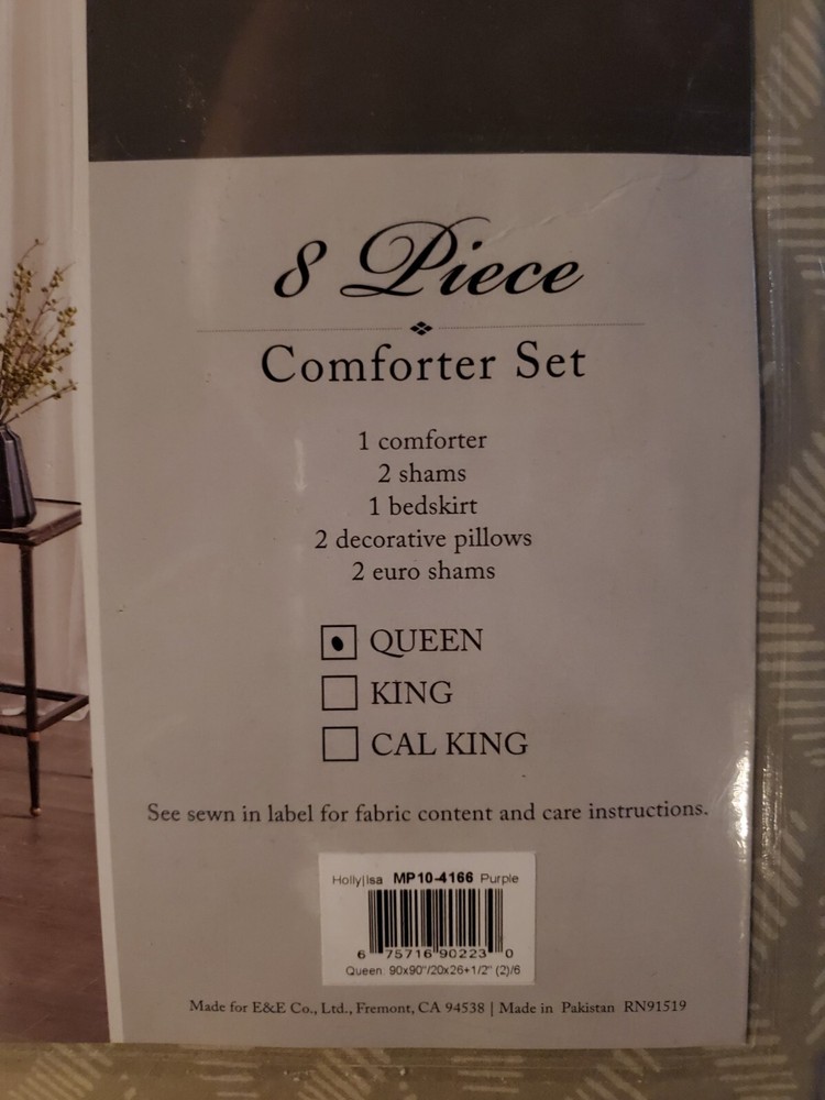 100% Cotton Holly 8 Piece Cotton Comforter Set Purple Queen 200TC cotton sateen, printed, 8oz/sq yard polyester filling, cotton/polyester crossweave reverse; 1 Comforter: 90x90" 2 Standard Shams: 20x26"(2) 1 Bed skirt: 60x80+15" 2 Decorative Pillows: 18x18"/12x18" 2 Euro Shams: 26x26+2"(2) Machine wash cold, gentle cycle, and separately. Do not bleach. Tumble dry low, remove promptly, do not iron. If t is no free movement in the washer or dryer, use large capacity commercial washer/dryer Anti Allergy Asthma Benefit : Hypoallergenic Components