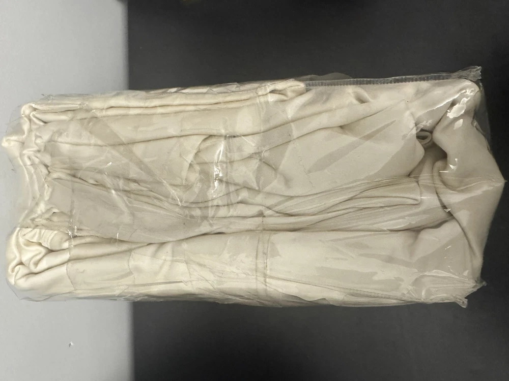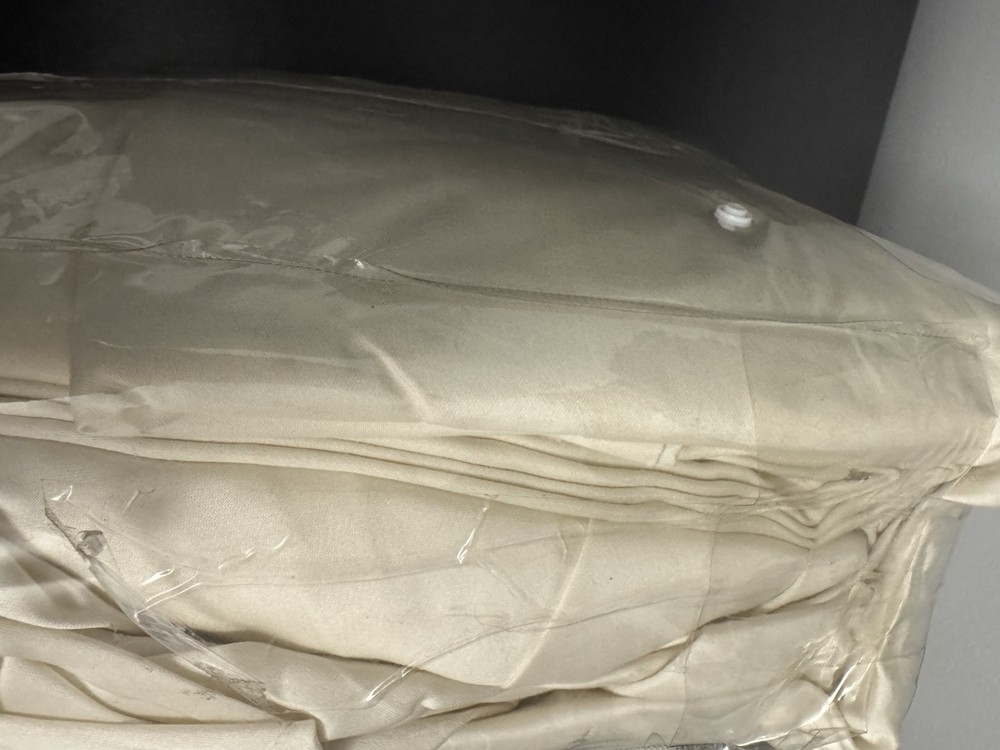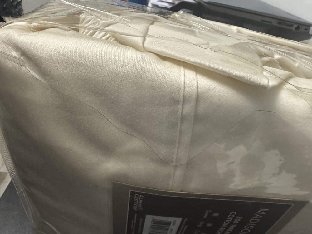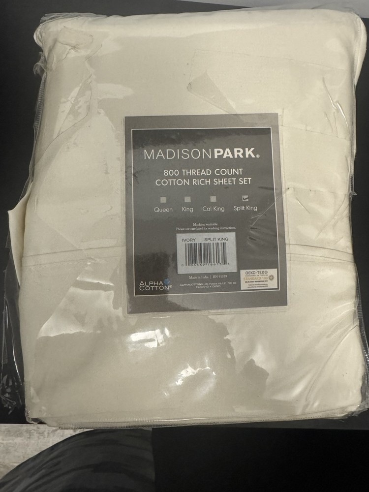 Elevate your bedroom with the Madison Park 800 Thread Count Cotton Blend Sheet Set in a luxurious ivory color. This set includes 7 pieces - 1 flat sheet, 2 fitted sheet, 4 pillowcases for a split king bed. Made from a soft and breathable cotton blend, these sheets are designed to provide a comfortable and hypoallergenic sleep experience. With a deep pocket and a rectangular shape, these sheets are perfect for any bedroom. They are also wrinkle-resistant and feature anti-microbial properties, making them easy to care for and maintain. The set comes in a modern style and is suitable for all seasons. Upgrade your bedding with the Madison Park 800 Thread Count Cotton Blend Sheet Set Split King Ivory. The packaging has damage but items are fine.