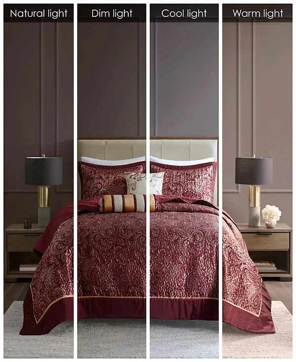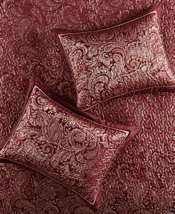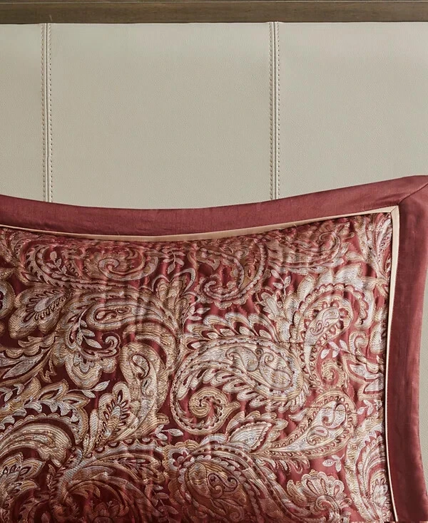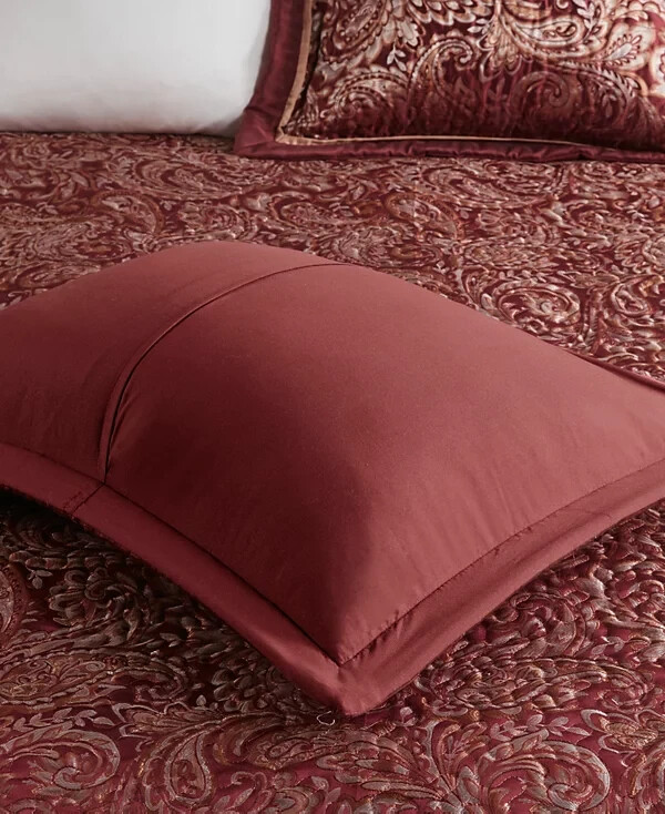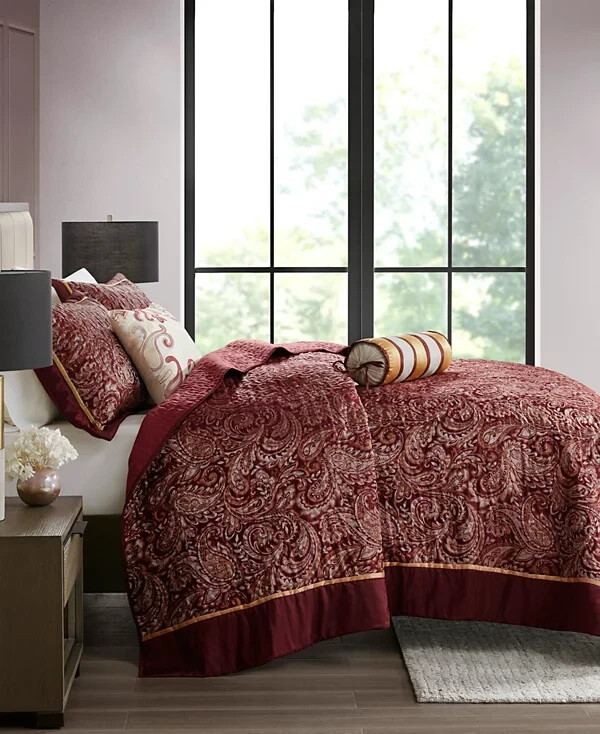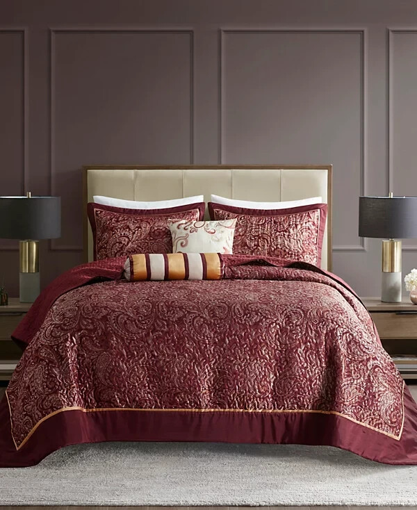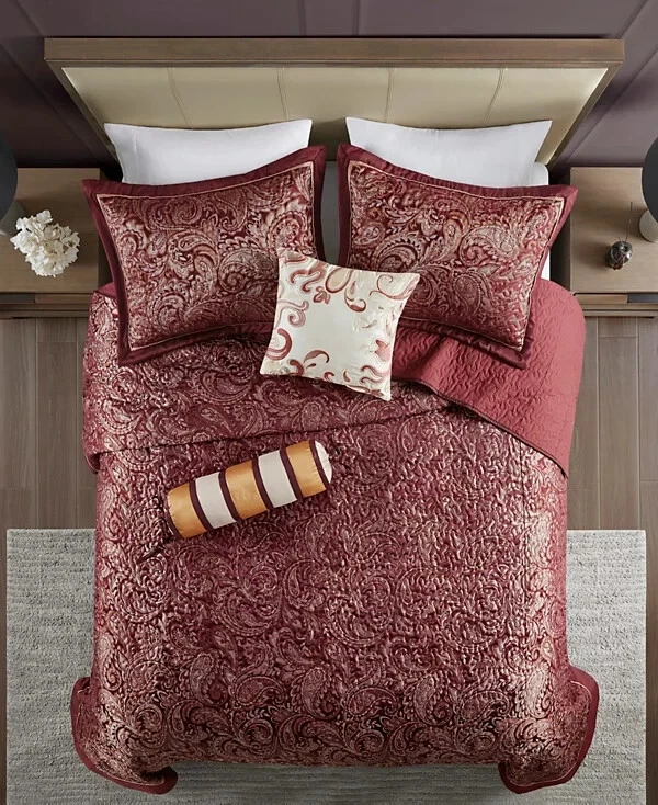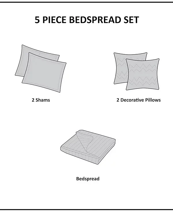 The Madison Park Adeline Paisley 5-piece reversible jacquard bedspread set provides a classic update for your bedroom. The jacquard weave is inspired from an updated paisley motif and is woven into a beautiful combination of rich colors. Product Features Bed size - King Bedspread dimensions - 118" L x 120" W x 0.25" H King shams - 20" W x 36" L plus 2" D Decorative pillow 1 - 18" W x 18" L Decorative pillow 2 - 6.5" D x 18" L Product weight - 13.09 lbs. Set includes - 1 bedspread, 2 king shams, 1 decorative pillow, 1 decorative pillow Classic traditional style 5-piece jacquard bedspread set Updated paisley motif design in beautiful black, silver and taupe colors with solid black border Polyester reverse side in solid black color with all over vermicelli quilling Embroidery details on decorative pillow Cotton filling for comfort and durability Polyester Jacquard Bedspread and Sham, Cotton and Polyester Filling, Polyester Pillow with Filling Machine Washable Imported Please feel free to contact me with any que stions. I would rather provide you with more information now than have you be disappointed when your item arrives. (Smoke Free storage/environment.) Returns are only allowed on items that are not as described or damaged. This is how I am able to keep my prices low and offer free shipping. Please be sure that you genuinely want the item before purchasing.