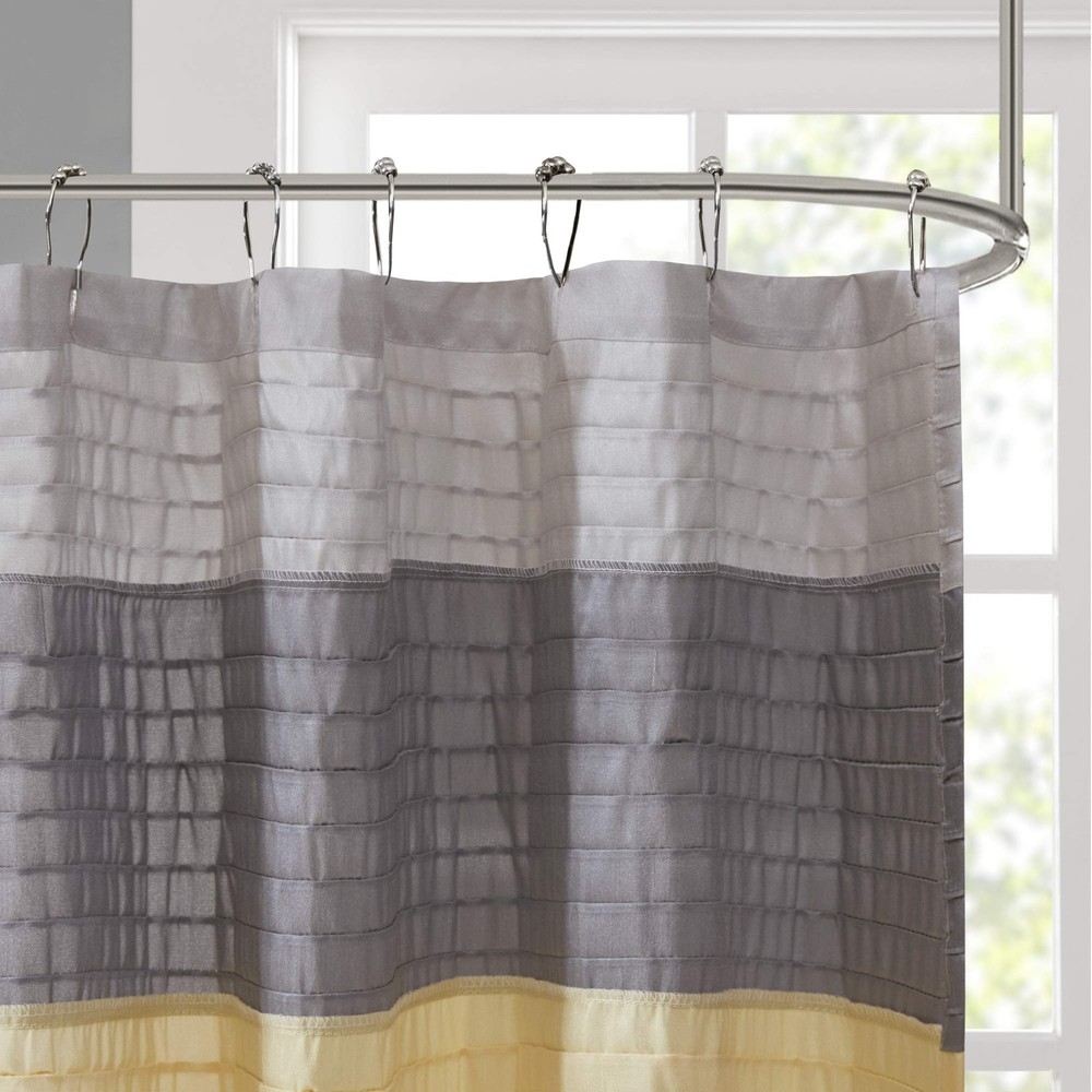 Product Page Madison Park Amherst Bathroom Shower Curtain Faux Silk Pieced Striped Kitchen Description: Update your bathroom with Madison Park’s simple, yet beautiful Amherst shower curtain. The faux silk fabric drapes beautifully and is machine washable, for easy care. The shower curtain features piecing and pleated details that add charm and dimension. Various sizes are available to fit any bathroom space. All 72" width sizes feature a standard of 12 button holes, while our special 54" width features 9 button holes and 108" extra width size features 18 button holes. Features: COLOR AND DESIGN -- contrast colors pieced with each other and in pleated design, looks classic and elegant, great for use at home, dorm or hotel room; it provides you a feeling like bathing in a Spa MATERIAL AND FEATURES -- faux silk fabric, drapes becautifully; it is machine washable, easy to take care of, just toss it into the washing machine and you will get a clean one after wash. OEKO-TEX Certified, includes no harmful substances or chemicals SIZE -- besides the conventional size 72x72; we also offer size like 107x72" , 54x78" ; you can choose the right size for your bath room EASY USE -- Simple hook ready design to hang on the rod with the liners, liner is recommended; pretty easy to hang on the hooks of the shower rod; it is great for all season; no vinyl smell SATISFACTION - We offer 100% satisfaction for our elegant designer microfiber fabric bath accessories sets with 30-day free return for our unique bathroom shower curtains set