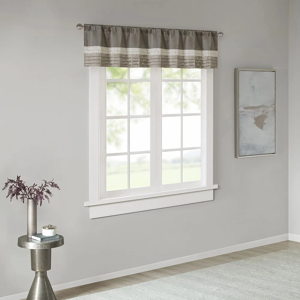 100% Polyester Imported NEW & TRENDY - Give your home a decorator’s touch with the Madison Park Amherst window curtain valance. Made from a faux silk fabric, this elegant window valance features multi color blocks with pintuck details. The luxurious sheen provides a touch of sophistication to your decor. For added sophistication, it comes with back tab rod pocket to fit curtain rods up to 1.25 inch in diameter. Complete the collection with coordinating window curtains and bedding set, each sold separately. PRIVACY - The living room curtain valances come with back lining for added privacy and better drapability. It also increases its ability to dim outside light coming in creating more cozy ambiance BACK TAB POCKET - This elegant small kitchen window curtain features a back tab rod pocket to conceal/cover the curtain rod creating a more professional tailor look; the rod pocket can fit rods up to 1.25 inch in diameter MEASUREMENT - 1 Window Valance: 50"W x 18"L CARE - Machine wash cold on gentle cycle, tumble dry on low heat, wash alone, do not bleach
