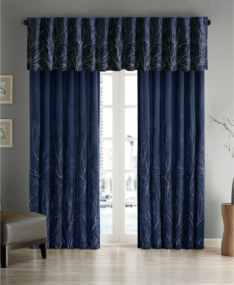 Color: Navy Size: 50" x 95" Make a stylish statement with the Andora curtains from Madison Park. The branches in this pattern grow from the bottom to create the illusion one is gazing about the tree tops. This updated design is embroidered on faux silk, and the panels are lined to keep out additional light, increase privacy and add fullness to the appearance of the window treatment. Hang on the rod pocket for a casual look or by using the back tabs for an updated, tailored look. Dimensions: 50" x 95" Fits up to 1.25" diameter curtain rod Rod pocket and back tab hanging options Includes: 1 curtain panel Polyester Machine washable Imported