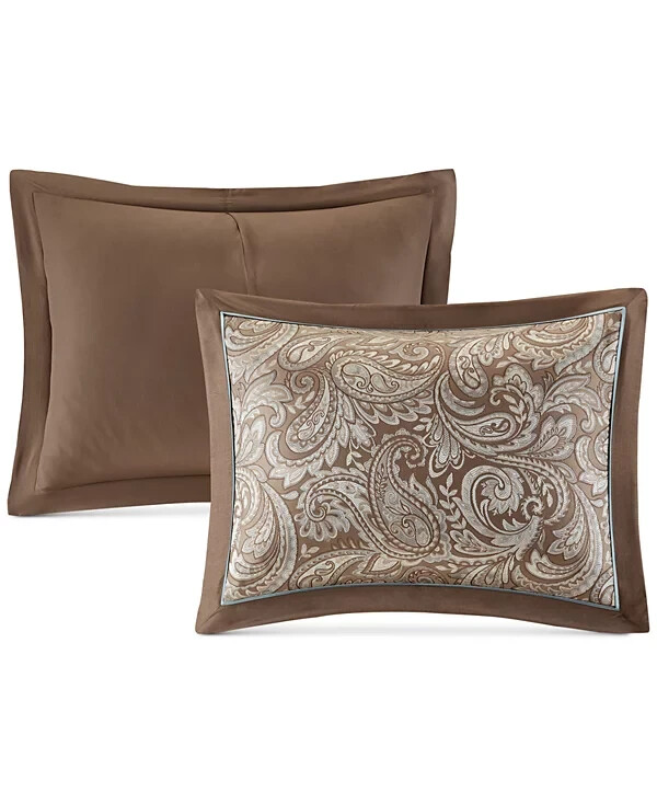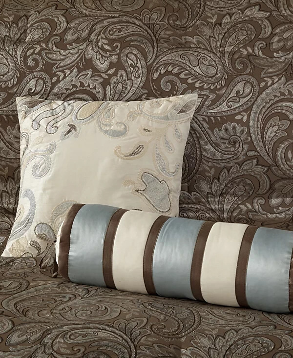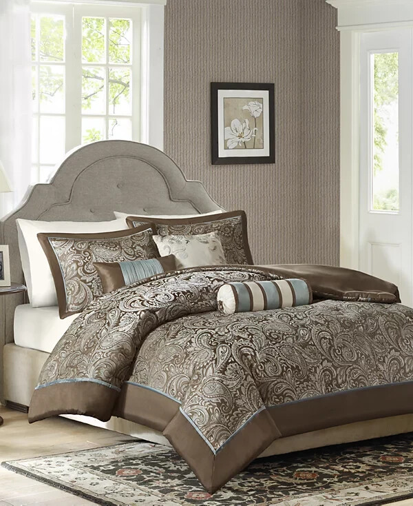 Give your bedroom a classic and elegant look with the Madison Park Aubrey 12 Piece Complete Bed Set including cotton bed sheets. This stunning set features a jacquard weave with a modern paisley pattern in soft blue, taupe, and a hint of platinum for a touch of sheen to your bedding. The comforter and shams have a 2" flange and 1/2" flat piping in a soft blue for a refined touch. The comforter reverses to a dark sand shade that complements with the soft blue tones of the 100% cotton, 200 thread count sheet set. This set includes everything you need to create a luxurious and cozy bed. Some items may arrive in compact packaging: just fluff them up or iron lightly and they’re ready to use. Comforter/Sham: 100% polyester jacquard with 1/2" poly charmeuse piping, 100% brushed polyester microfiber reverse Fill: Polyester filling Sheets: 100% cotton twill Euro Sham: Polyester polyoni, quilted Square Pillow: 100% polyester jacquard, polyoni reverse, polyester filling Neckroll Pillow: 100% polyester charmeuse, pieced with polyoni, pintuck, polyoni reverse, polyester filling Bedskirt: 100% polyester charmeuse fabric drop, polyester platform * The set includes everything you need: 1 comforter, 2 euro shams, 2 matching shams, 2 decorative pillows, 1 bed skirt, 1 fitted sheet, 1 flat sheet and 2 pillow cases * Transform your bedroom with this elegant 12 piece bed set * Enjoy the stylish paisley pattern in lovely colors * Relax on the soft and cozy 100% cotton sheets * Simple to maintain: wash in the machine and iron out the wrinkles * Some items are packed tightly for shipping: give them a shake and a fluff to restore their shape Please feel free to contact me with any que stions. I would rather provide you with more information now than have you be disappointed when your item arrives. (Smoke Free storage/environment.) Returns are only allowed on items that are not as described or damaged. This is how I am able to keep my prices low and offer free shipping. Please be sure that you genuinely want the item before purchasing.