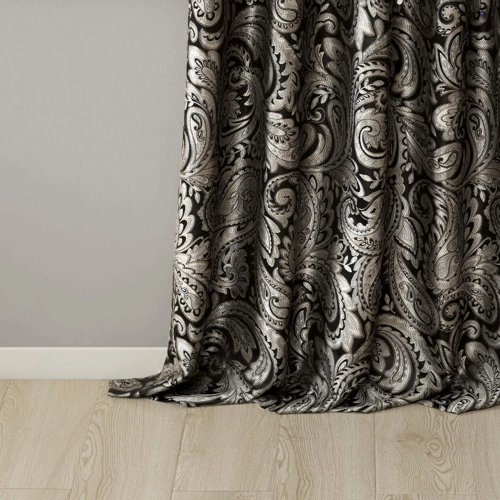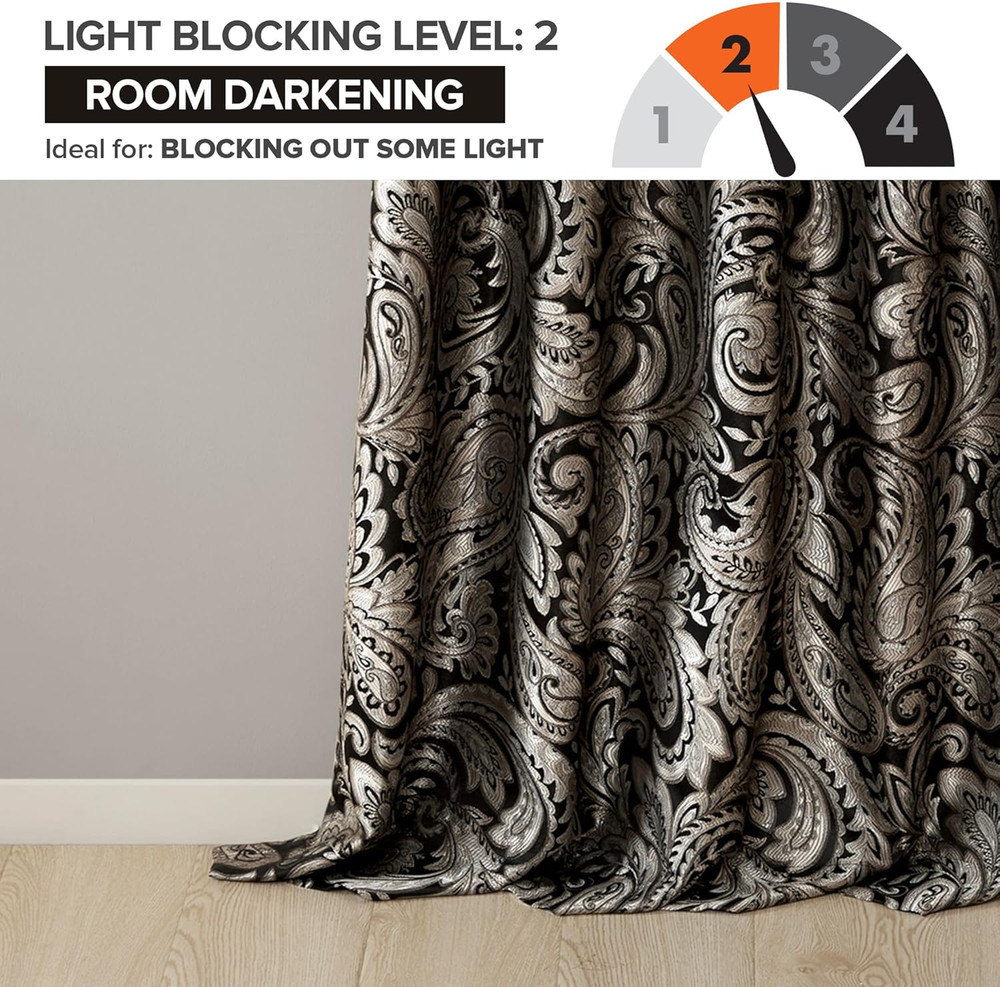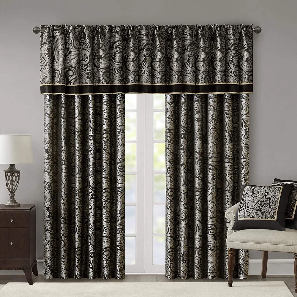Madison Park Aubrey 2 Panel Curtain Faux Silk Paisley Jacquard, Rod Pocket Curtain for Living Room, Kitchen, Room Darkening Window Drape for Bedroom and Dorm, 2-PK 50x108, Black 100% Polyester Imported Set of 2 curtain panels showcasing an elegant paisley jacquard with a sophisticated natural luster, perfect for a fresh and stylish update For a luxuriously classic style, our Madison Park Aubrey Window Curtain Pair adds an elegant touch to your décor while providing room darkening effect, for enhanced privacy The window panels are pieced with solid faux silk and beautiful flat piping details in gold, creating an elegant look OEKO-TEX certification, meaning it does not contain any harmful substances or chemicals, ensuring quality comfort and wellness. Simply hang on rod pocket or back tabs for a tailored finish; fits up to a 1. 25 diameter rod CARE - Machine wash cold on gentle cycle, tumble dry on low heat, wash alone, do not bleach For a luxuriously classic style, our Madison Park Aubrey Window Curtain Pair is the perfect touch to your decor. The alluring jacquard weave is inspired from an updated paisley motif and is woven in beautiful hues of black, gold, and a hint of platinum for a shimmering accent. The window panels are pieced with solid faux silk and beautiful flat piping details in gold, creating an elegant look. While also achieving the OEKO-TEX certification, meaning it does not contain any harmful substances or chemicals, ensuring quality comfort and wellness. Rod pocket or back tabs top finish makes this curtain easy to hang, open, and close panels throughout the day; while fitting up to a standard 1.25" diameter rod. Coordinating bedding is also available and sold separately.