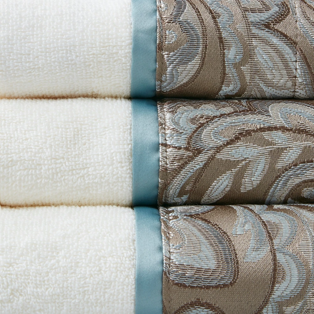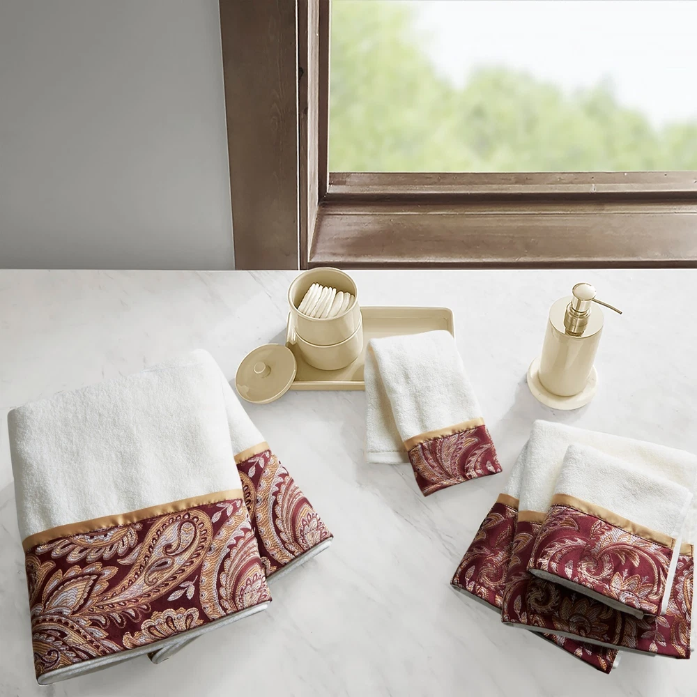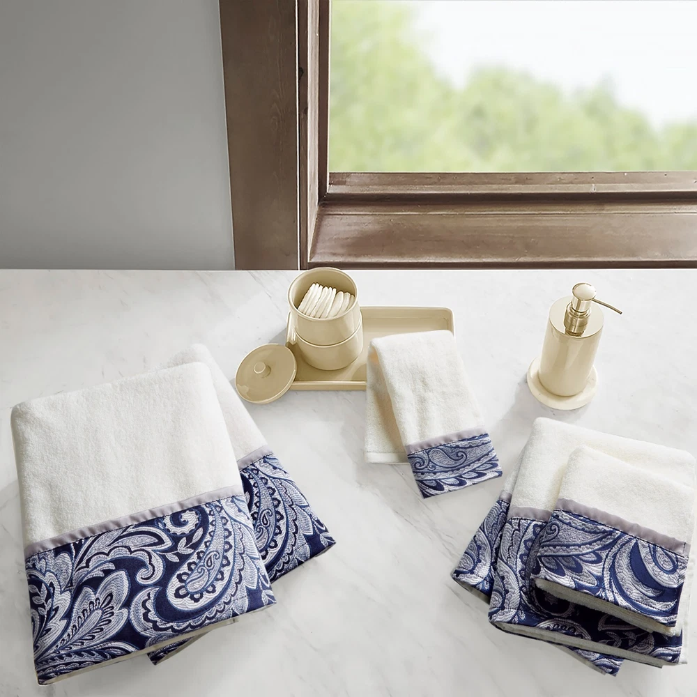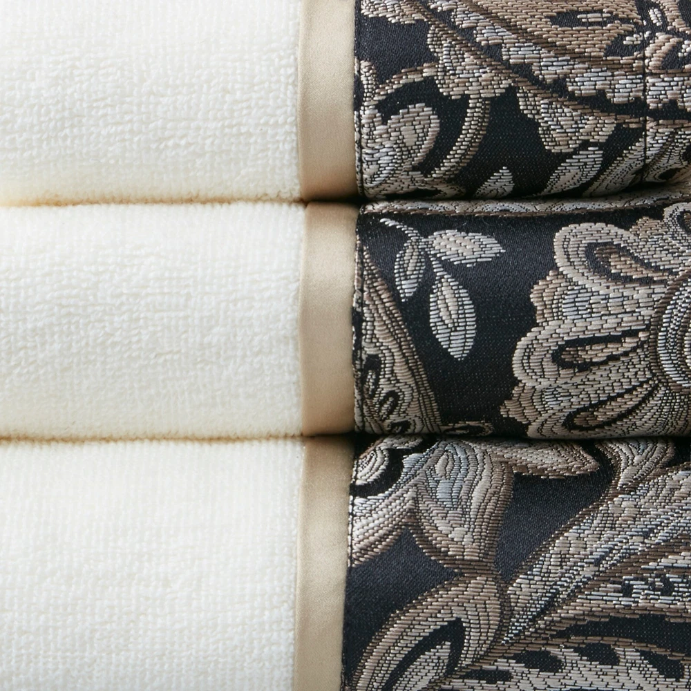 Store Categories Store Categories Bedding Comforters Decorative Pillows Duvet Covers Quilts & Coverlets Sheets Blankets & Throws Mattress Pads Pillows Home Decor Window Treatments Wall Art Home Accents Furniture Beds Dining Seating Ottomans & Benches Accent Chairs Accent Tables Dining Tables Sofas Bath Bath Robes Shower Curtains Towels Bath Rugs Bath Accessories Apparel Pajama Sets Nightgowns Rugs Rugs & Carpets Lighting Lamp Pendant Other Product Overview Details Description: Add a sophisticated style to your bathroom with our Madison Park Aubrey 6 Piece Jacquard Towel Set. This towel set features a pieced design with a woven paisley jacquard hem, in rich black and gold hues, for an elegant and decorative touch. These cotton towels are also OEKO-TEX certified, meaning they do not contain any harmful substances, ensuring quality comfort and wellness. Made from 100% cotton terry, this towel set is incredibly soft, absorbent, and machine washable for easy care. Place these jacquard cotton towels in your bathroom to add the perfect finishing touches to your traditional style decor. Coordinating shower curtains and rugs are available and sold separately for a complete look. Set includes: 2 standard 27x52" bath towels, 2 standard 16x28" hand towels, and 2 standard 12x18" fingertip towels. See below Size include: 2 Bath Towels:27"W x 52"L (2)2 Hand Towels:16"W x 28"L (2) 2 Fingertip Towels:12"W x 18"L (2) Care Instruction: Wash before first use. Machine wash gentle cycle with like color in cold water. Only use non-chlorine bleach when needed. Do not wash with sharp items that may pull the towel fibers, such as zippers or hooks. To maintain the quality and performance of your towels, avoid the use of fabric softeners and dry sheets. Tumble dry low, remove promptly. Cool iron if necessary. Fold towels neatly and store in a dry ventilated place. Before use, simply shake towels to restore fluff and pile. Material Details: 550gsm cotton, terry Bedding Comforters Decorative Pillows Duvet Covers Quilts & Coverlets Sheets Blankets & Throws Mattress Pads Pillows Home Decor Window Treatments Wall Art Home Accents Furniture Beds Dining Seating Ottomans & Benches Accent Chairs Accent Tables Dining Tables Sofas Bath Bath Robes Shower Curtains Towels Bath Rugs Bath Accessories Rugs Rugs & Carpets Lighting Lamp Pendant Product Overview Product Details Description: Add a sophisticated style to your bathroom with our Madison Park Aubrey 6 Piece Jacquard Towel Set. This towel set features a pieced design with a woven paisley jacquard hem, in rich black and gold hues, for an elegant and decorative touch. These cotton towels are also OEKO-TEX certified, meaning they do not contain any harmful substances, ensuring quality comfort and wellness. Made from 100% cotton terry, this towel set is incredibly soft, absorbent, and machine washable for easy care. Place these jacquard cotton towels in your bathroom to add the perfect finishing touches to your traditional style decor. Coordinating shower curtains and rugs are available and sold separately for a complete look. Set includes: 2 standard 27x52" bath towels, 2 standard 16x28" hand towels, and 2 standard 12x18" fingertip towels. See below Size include: 2 Bath Towels:27"W x 52"L (2)2 Hand Towels:16"W x 28"L (2) 2 Fingertip Towels:12"W x 18"L (2) Care Instruction: Wash before first use. Machine wash gentle cycle with like color in cold water. Only use non-chlorine bleach when needed. Do not wash with sharp items that may pull the towel fibers, such as zippers or hooks. To maintain the quality and performance of your towels, avoid the use of fabric softeners and dry sheets. Tumble dry low, remove promptly. Cool iron if necessary. Fold towels neatly and store in a dry ventilated place. Before use, simply shake towels to restore fluff and pile. Material Details: 550gsm cotton, terry