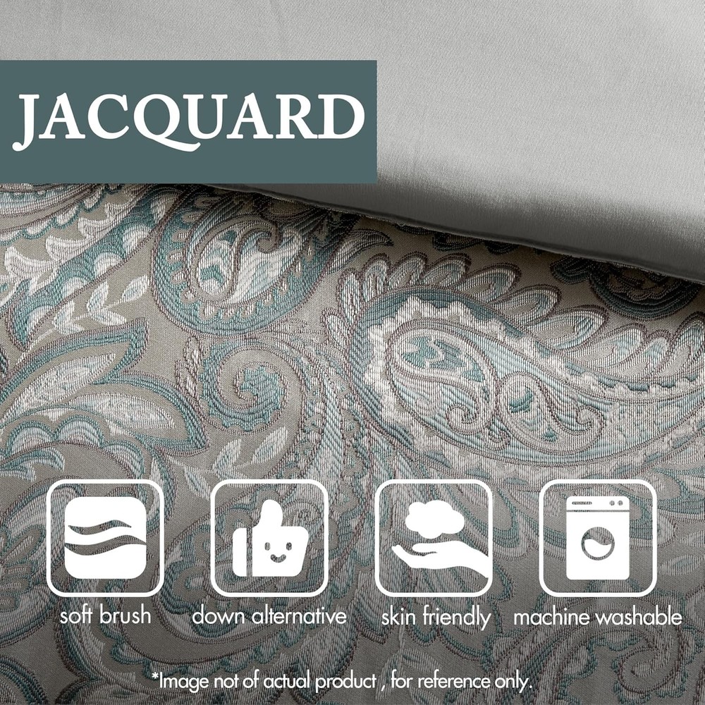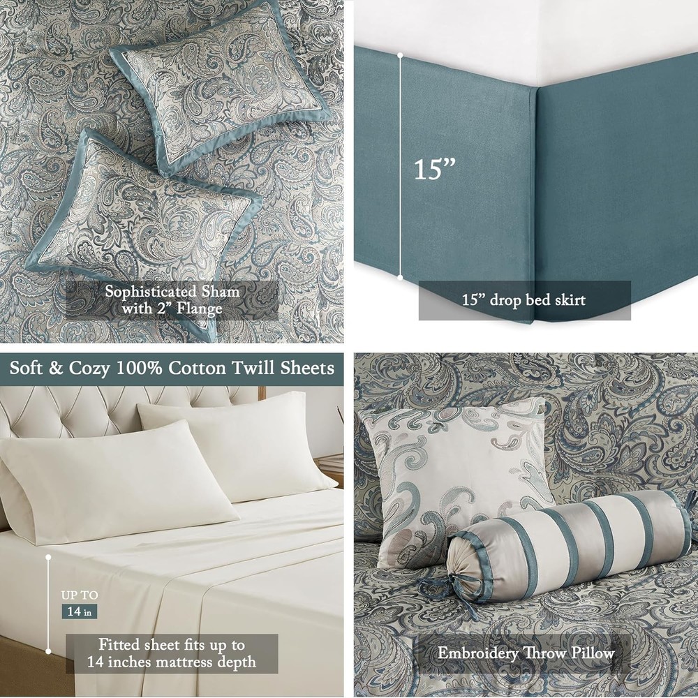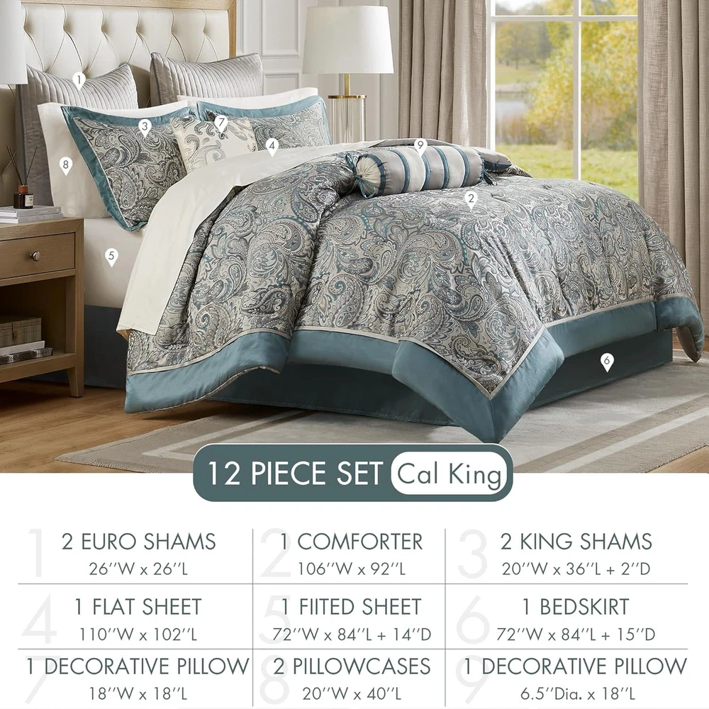 This is an OpenBoxed Item. Our Opened Box items are in great condition. Typically the item is 100% brand new in a replaced box. A great way to get a lot more for your money. All our items are 100% guaranteed! So buy worry free! Madison Park Aubrey Cozy 12 Piece Comforter California King, Teal Biab 12pcs Product Details Size: California King Included Components: 1 Comforter, 2 King Shams, 1 Bedskirt, 2 Euro Shams, 1 Flat Sheet, 1 Fitted Sheet, 2 Pillowcases, 2 Decorative Pillows Color: Teal Biab 12pcs Style: Comforter Set Brand: Madison Park Theme: Paisley Pattern: Paisley Material: Polyester Fabric Type: 100% Polyester Number of Pieces: 12 Seasons: All Thread Count: 200 Product Care Instructions: Machine wash cold separately, gentle cycle Manufacturer: E&E Co. Ltd DBA JLA Home Item dimensions L x W x H: 92 x 106 x 1.5 inches Product Dimensions: 92 x 106 x 1.5 inches Item Weight: 17.4 pounds Department: Home Item model number: MP10-8313 Batteries required: No Included Components: 1 Comforter, 2 King Shams, 1 Bedskirt, 2 Euro Shams, 1 Flat Sheet, 1 Fitted Sheet, 2 Pillowcases, 2 Decorative Pillows 1 Comforter, 2 King Shams, 1 Bedskirt, 2 Euro Shams, 1 Flat Sheet, 1 Fitted Sheet, 2 Pillowcases, 2 Decorative Pillows1 Comforter, 2 King Shams, 1 Bedskirt, 2 Euro Shams, 1 Flat Sheet, 1 Fitted Sheet, 2 Pillowcases, 2 Decorative Pillows See more 100% Polyester Comforter & Cotton Sheet Set - Traditional Bed in a bag comforter set design comes with all bedding essential you need to update your room décor Luxurious Bedding - The paisley jacquard weave creates a beautiful combination of design and color contrast, complemented by a pleated border design with a touch of natural sheen. It will add a luxurious feel to your décor Bed in a Bag Comforter Set - Beautiful faux silk fabric is not only giving a natural sheen finish, but also wrinkle resistant and colorfast. Paired with a soft 100% cotton sheet set in complementing color to complete the design Set includes: 1 Comforter: 106"W x 92"L, 2 King Shams: 20"W x 36"L + 2"D, 1 Bedskirt: 72"W x 84"L + 15"D, 2 Euro Shams: 26"W x 26"L, 1 Flat Sheet: 110"W x 102"L, 1 Fitted Sheet: 72"W x 84"L + 14"D, 2 Pillowcases: 20"W x 40"L, 1 Decorative Pillow: 18"W x 18"L, 1 Decorative Pillow: 6.5"Dia. x 18"L Easy Care - Machine washable. Use large capacity washer and dryer for best results. Cold/delicate cycle, low/no heat dry. Comes in compressed d & smaller packaging reducing carbon footprint. To remove wrinkle, use fabric steamer and fluff up as needed Give your bedroom a classic and elegant look with the Madison Park Aubrey 12 Piece Complete Bed Set including cotton bed sheets. This stunning set features a jacquard weave with a modern paisley pattern in a teal, grey color with a hint of silver for a touch of sheen to your bedding. The comforter and shams have a teal flange and 1/2" flat piping in a soft grey for a refined touch. The comforter reverses to a grey that complements the ivory tones of the 100% cotton, 200 thread count sheet set. This set includes everything you need to create a luxurious and cozy bed. Some items may arrive in compact packaging: just fluff them up or iron lightly and they're ready to use.