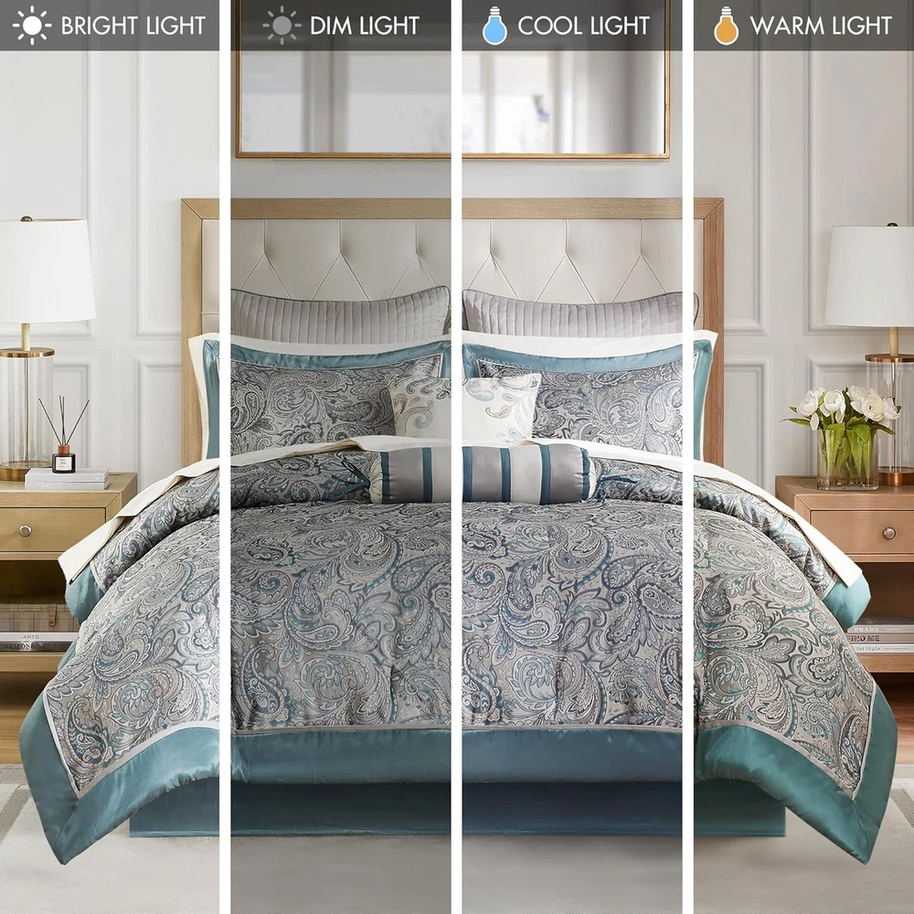 This comforter set is absolutely stunning—the teal color is rich, and the material feels so soft and luxurious. The 12-piece set covers everything you need for a fully made bed, and the quality is top-notch for the price. Even as an open-box item, it arrived in flawless condition, looking brand new. The shams, decorative pillows, and bedskirt add a polished, elegant touch. Super cozy and stylish—definitely a steal for such a complete set. Highly recommend!