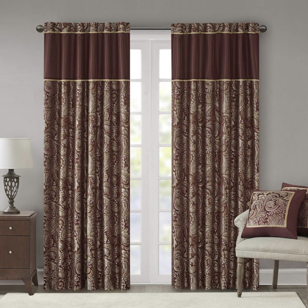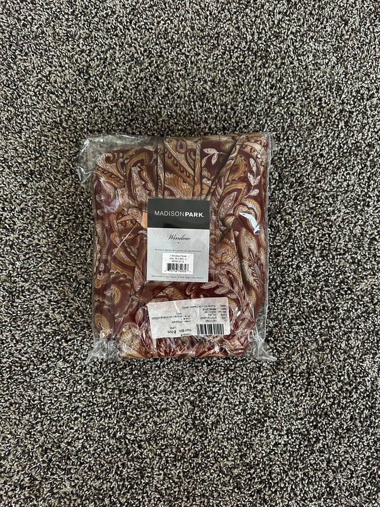 Madison Park Aubrey Faux Silk Paisley Jacquard, 50 in x 84 in, Burgundy, NWT * 100% Polyester * Set Includes: 2 window panels. * For a luxuriously classic style, our Madison Park Aubrey Window Curtain Pair is the perfect touch to your decor. * The window panels are pieced with solid faux silk and beautiful flat piping details in gold, creating an elegant look. * Simply hang on rod pocket or back tabs for a tailored finish; fits up to a 1. 25 diameter rod. * Care Instructions: Machine washable Enhance the visual appeal of your room with these beautiful Paisley patterned panels. The Madison Park Aubrey Faux Silk Jacquard curtains in Burgundy color are perfect for any room. Made of high-quality Faux Silk material, these curtains are durable and long-lasting. With a dimension of 50 in x 84 in, they are ideal for indoor use and come with new tags. The panels are perfect for adding a touch of elegance to your windows and making them the centerpiece of your room. Get the Madison Park Aubrey Faux Silk Paisley Jacquard curtains today and enhance your interior decor.