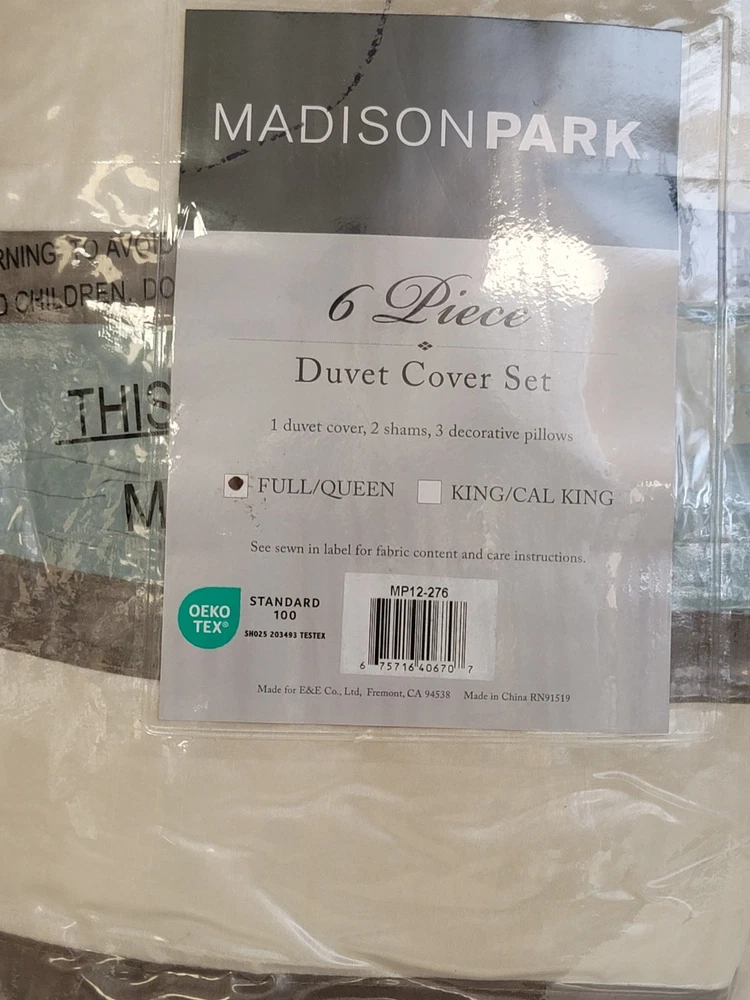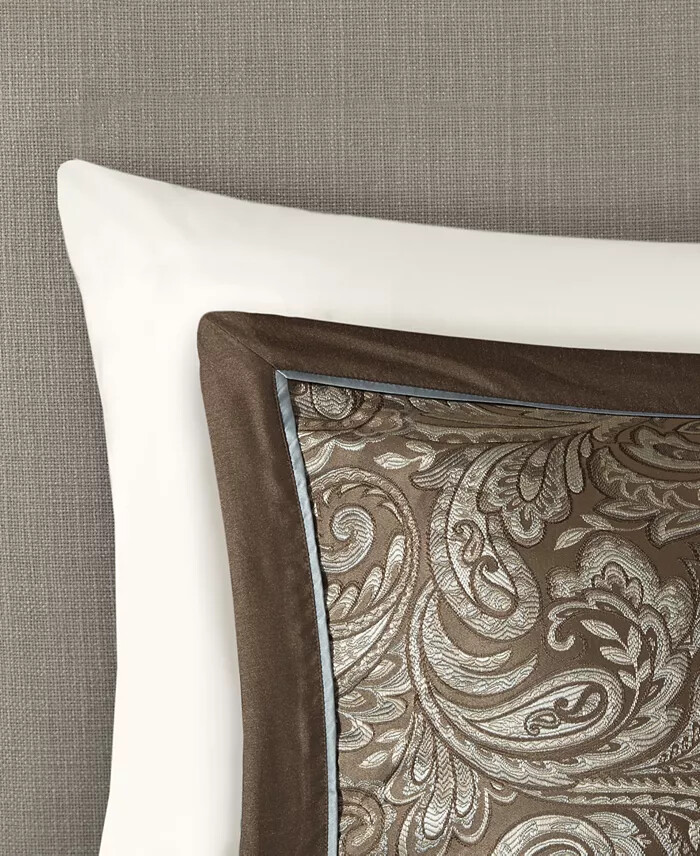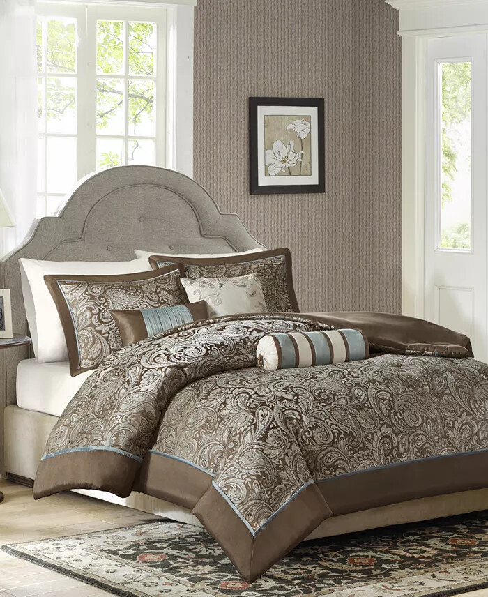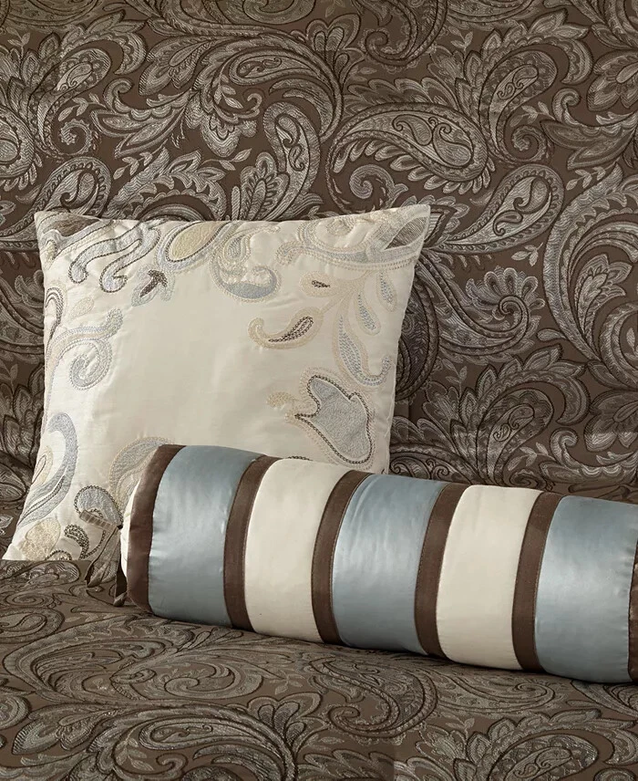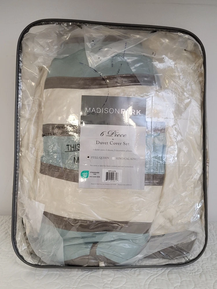 New Madison Park Aubrey Full/Queen 6 Piece Duvet Cover Set in Blue - Olliix MP12-276 Paisley jacquard and rich shimmering tones of this Aubrey duvet cover set from Madison Park. The included decorative pillows add stylish depth and dimension to the ensemble and any setting. Set includes: full/queen duvet (90" x 90"), two standard shams (20" x 26" + 2") and three decorative pillows (12.0" x 20.0", 18.0" x 18.0", 6.5" x 18.0") Duvet, shams and decorative pillows: polyester; Decorative pillows fill: polyester Machine washable. Spot clean pillows. Imported
