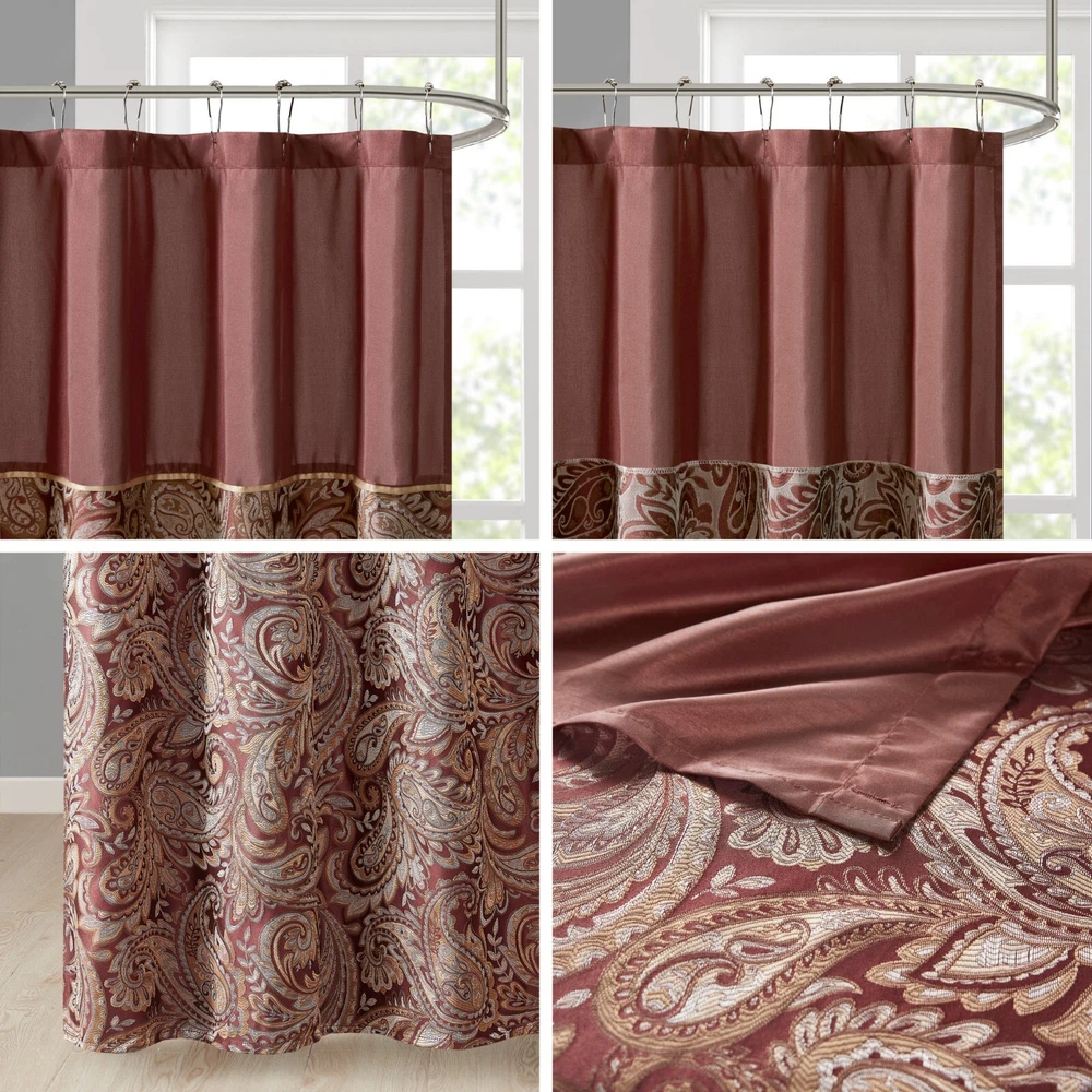 Store Categories Store Categories Bedding Comforters Decorative Pillows Duvet Covers Quilts & Coverlets Sheets Blankets & Throws Mattress Pads Pillows Home Decor Window Treatments Wall Art Home Accents Furniture Beds Dining Seating Ottomans & Benches Accent Chairs Accent Tables Dining Tables Sofas Bath Bath Robes Shower Curtains Towels Bath Rugs Bath Accessories Apparel Pajama Sets Nightgowns Rugs Rugs & Carpets Lighting Lamp Pendant Other Product Overview Details Description: The Madison Park Aubrey Polyester Jacquard Shower Curtain creates a sophisticated modern look in your bathroom. The pieced design flaunts a beautiful woven jacquard in an updated paisley motif with a large solid stripe at the top of the shower curtain. This jacquard shower curtain is machine washable for easy care. Various sizes are available to fit any bathroom space. 72x72" Size include: 1 Shower Curtain:72"W x 72"L Care Instruction: Dry Clean Only Material Details: 100% polyester faux silk Bedding Comforters Decorative Pillows Duvet Covers Quilts & Coverlets Sheets Blankets & Throws Mattress Pads Pillows Home Decor Window Treatments Wall Art Home Accents Furniture Beds Dining Seating Ottomans & Benches Accent Chairs Accent Tables Dining Tables Sofas Bath Bath Robes Shower Curtains Towels Bath Rugs Bath Accessories Rugs Rugs & Carpets Lighting Lamp Pendant Product Overview Product Details Description: The Madison Park Aubrey Polyester Jacquard Shower Curtain creates a sophisticated modern look in your bathroom. The pieced design flaunts a beautiful woven jacquard in an updated paisley motif with a large solid stripe at the top of the shower curtain. This jacquard shower curtain is machine washable for easy care. Various sizes are available to fit any bathroom space. 72x72" Size include: 1 Shower Curtain:72"W x 72"L Care Instruction: Dry Clean Only Material Details: 100% polyester faux silk