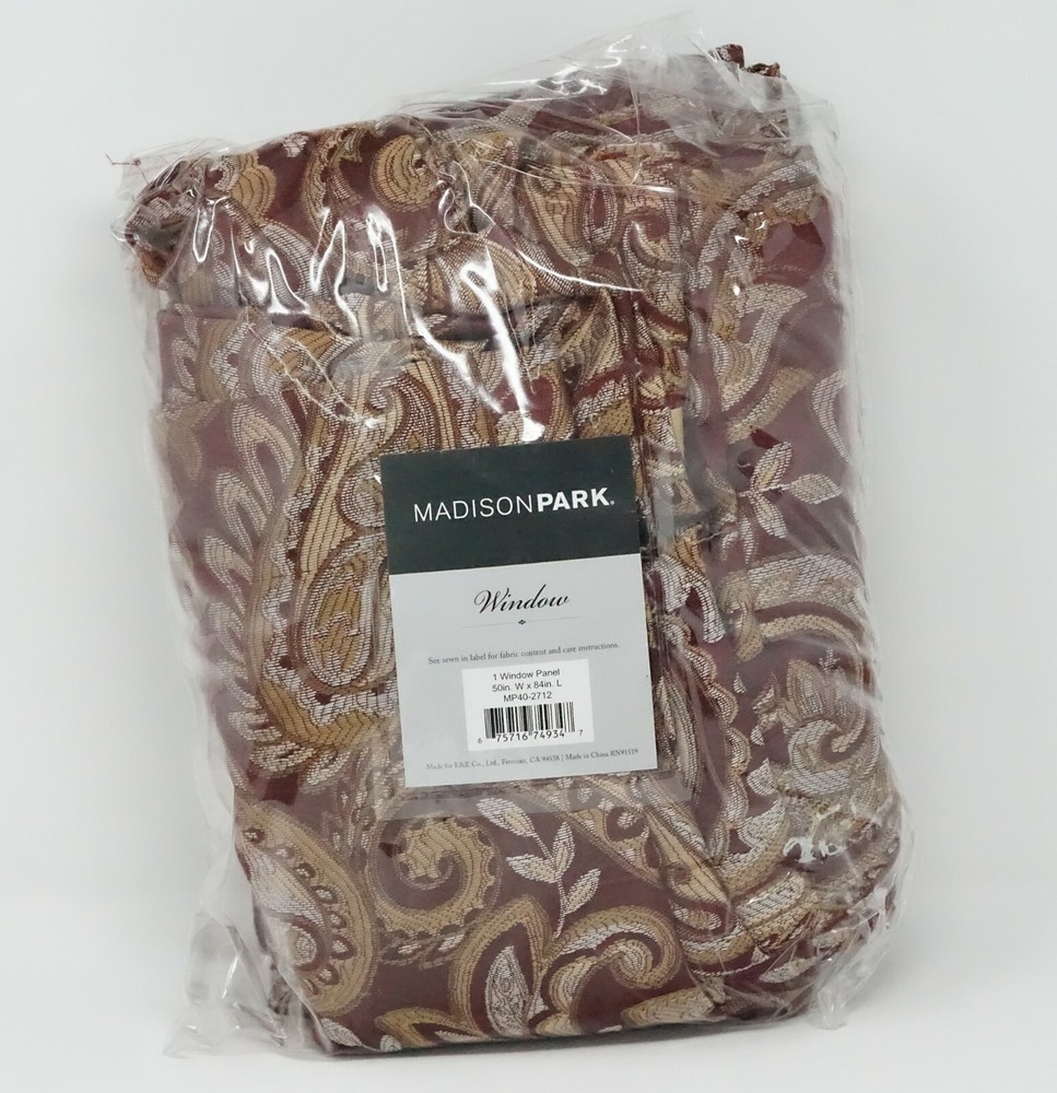 Brand New - Refolded Color: Red Size: 50" x 84" Make any room's look magnificent with the shimmering paisley jacquard, chic faux-silk piecing and beautiful flat piping details of this Aubrey curtain panel from Madison Park. Dimensions: 50" x 84" Fits curtain rods up to 1.25" diameter Includes: 1 curtain panel Rod pocket and back tab hanging options Polyester Machine washable Imported