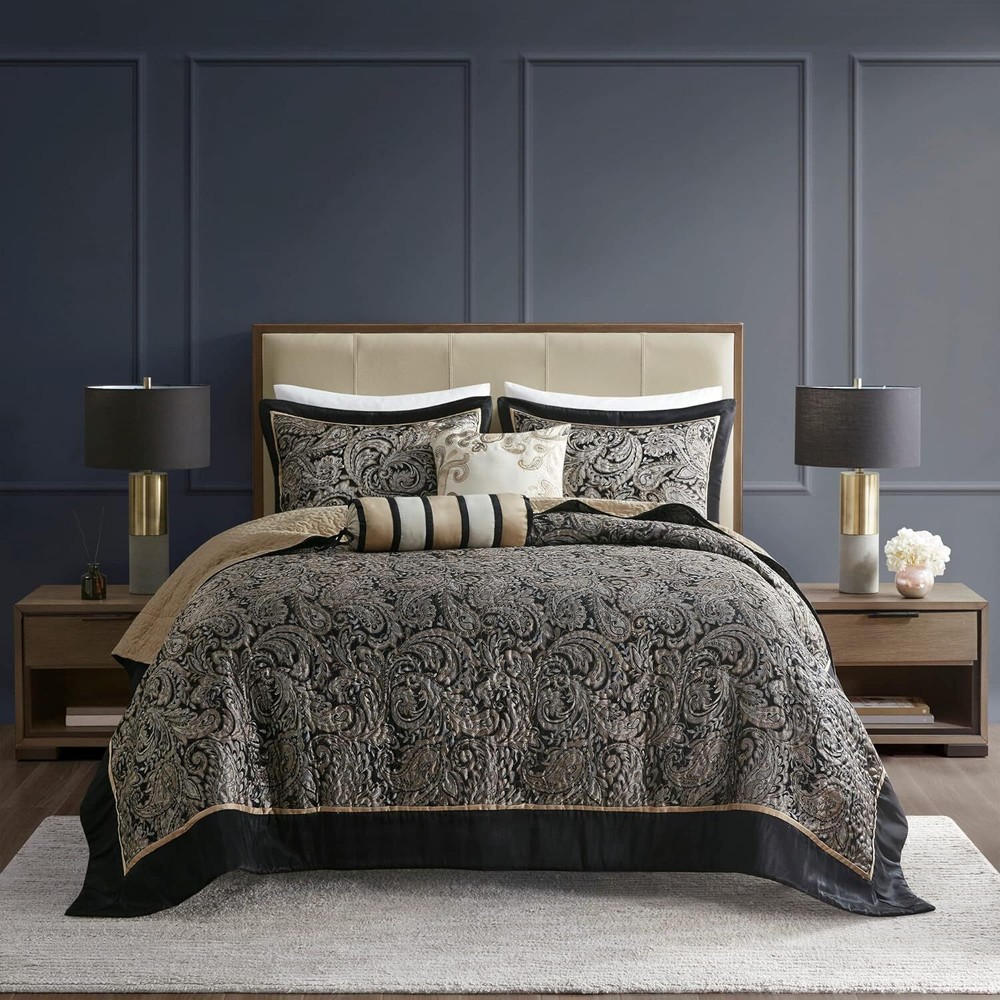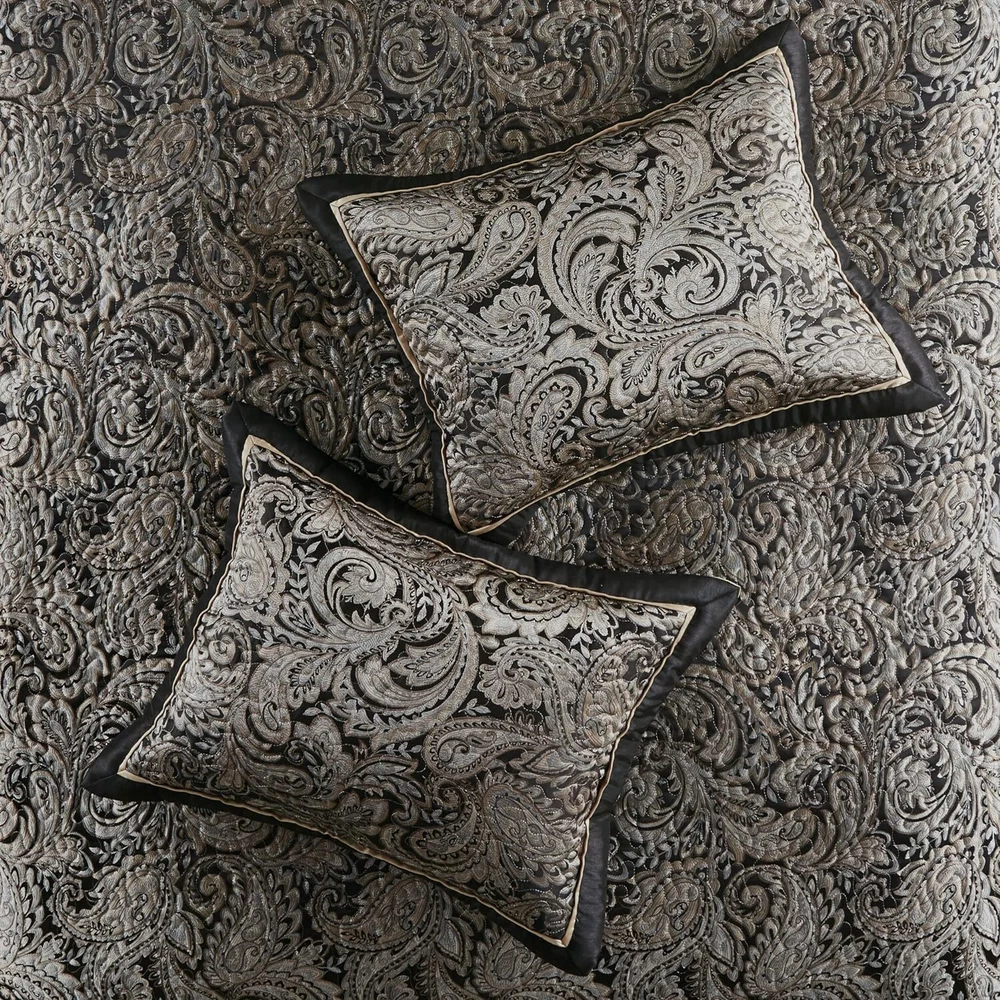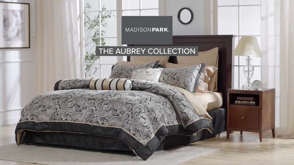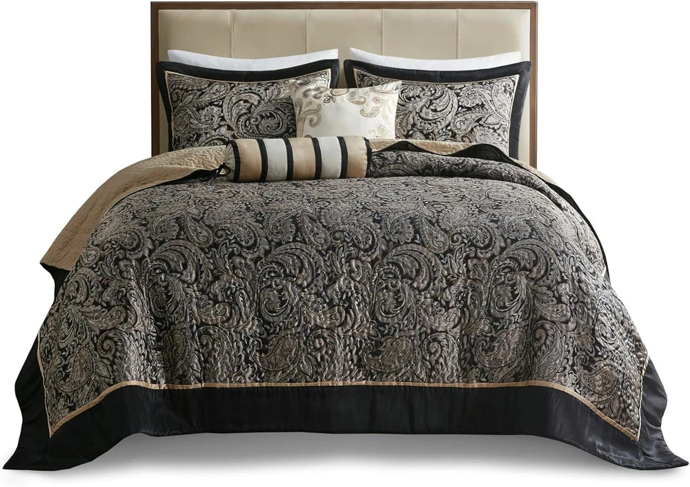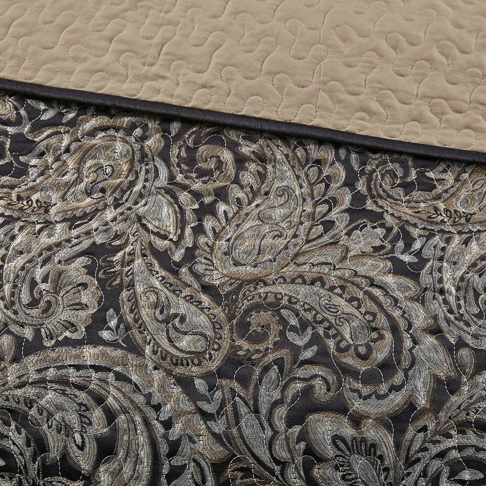Store Categories Store Categories Bedding Comforters Decorative Pillows Duvet Covers Quilts & Coverlets Sheets Blankets & Throws Mattress Pads Pillows Home Decor Window Treatments Wall Art Home Accents Furniture Beds Dining Seating Ottomans & Benches Accent Chairs Accent Tables Dining Tables Sofas Bath Bath Robes Shower Curtains Towels Bath Rugs Bath Accessories Apparel Pajama Sets Nightgowns Rugs Rugs & Carpets Lighting Lamp Pendant Other Product Overview Details DESCRIPTION If classic is your style, Aubrey 6 Piece Reversible is perfect for you. The jacquard weave is inspired from an updated paisley motif and is woven into a beautiful combination of deep black, gold and a hint of platinum for a touch of sheen to your bedding. Three decorative pillows complete this look with embroidery and fabric manipulation details. FEATURES • Set includes 1 quilt, 2 shams, and 3 throw pillows • Classic traditional style quilt with all over vermicelli quiling • Polyester jacquard face, microfiber reverse, cotton filling for comfort and durability • Embroidery details on decorative pillow • Machine washable for easy care MATERIAL Quilt/Sham: 100% Polyester Jacquard, all over quilting, 100% brushed Polyester reverse, 90% Cotton, 10% other fiber filling Pillow: 100% Polyester shell, Polyester filling Available Sizes: Full/Queen Quilt Set includes: 1 Quilt: 90"W x 90"L 2 Standard Shams: 20"W x 26"L + 2"D 1 Decorative Pillow: 18"W x 18"L 1 Decorative Pillow: 16"W x 16"L 1 Decorative Pillow: 6.5"W x 18"L King/California King Quilt Set includes: 1 Quilt: 104"W x 94"L 2 King Shams: 20"W x 36"L + 2"D 1 Decorative Pillow: 18"W x 18"L 1 Decorative Pillow: 16"W x 16"L 1 Decorative Pillow: 6.5"W x 18"L Bedding Comforters Decorative Pillows Duvet Covers Quilts & Coverlets Sheets Blankets & Throws Mattress Pads Pillows Home Decor Window Treatments Wall Art Home Accents Furniture Beds Dining Seating Ottomans & Benches Accent Chairs Accent Tables Dining Tables Sofas Bath Bath Robes Shower Curtains Towels Bath Rugs Bath Accessories Rugs Rugs & Carpets Lighting Lamp Pendant Product Overview Product Details DESCRIPTION If classic is your style, Aubrey 6 Piece Reversible is perfect for you. The jacquard weave is inspired from an updated paisley motif and is woven into a beautiful combination of deep black, gold and a hint of platinum for a touch of sheen to your bedding. Three decorative pillows complete this look with embroidery and fabric manipulation details. FEATURES • Set includes 1 quilt, 2 shams, and 3 throw pillows • Classic traditional style quilt with all over vermicelli quiling • Polyester jacquard face, microfiber reverse, cotton filling for comfort and durability • Embroidery details on decorative pillow • Machine washable for easy care MATERIAL Quilt/Sham: 100% Polyester Jacquard, all over quilting, 100% brushed Polyester reverse, 90% Cotton, 10% other fiber filling Pillow: 100% Polyester shell, Polyester filling Available Sizes: Full/Queen Quilt Set includes: 1 Quilt: 90"W x 90"L 2 Standard Shams: 20"W x 26"L + 2"D 1 Decorative Pillow: 18"W x 18"L 1 Decorative Pillow: 16"W x 16"L 1 Decorative Pillow: 6.5"W x 18"L King/California King Quilt Set includes: 1 Quilt: 104"W x 94"L 2 King Shams: 20"W x 36"L + 2"D 1 Decorative Pillow: 18"W x 18"L 1 Decorative Pillow: 16"W x 16"L 1 Decorative Pillow: 6.5"W x 18"L