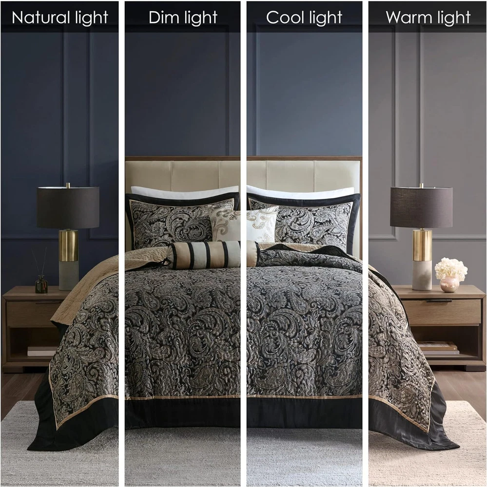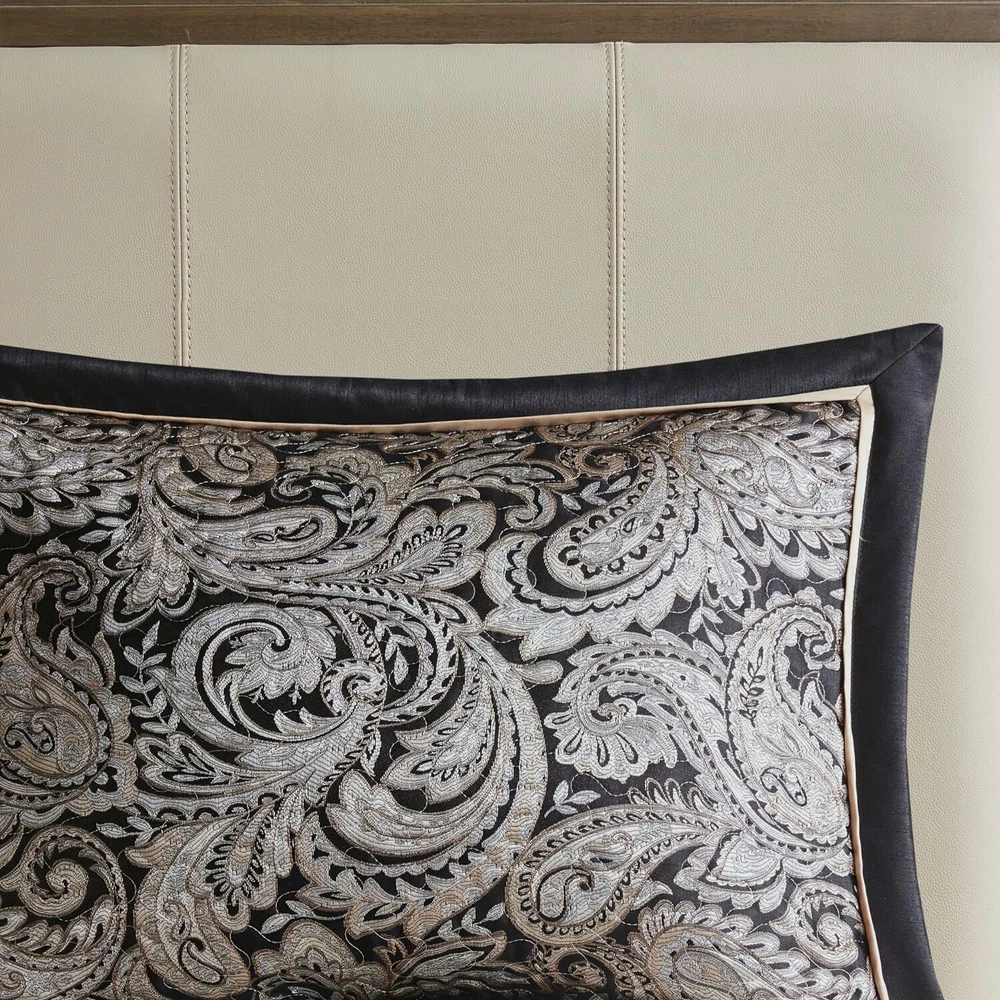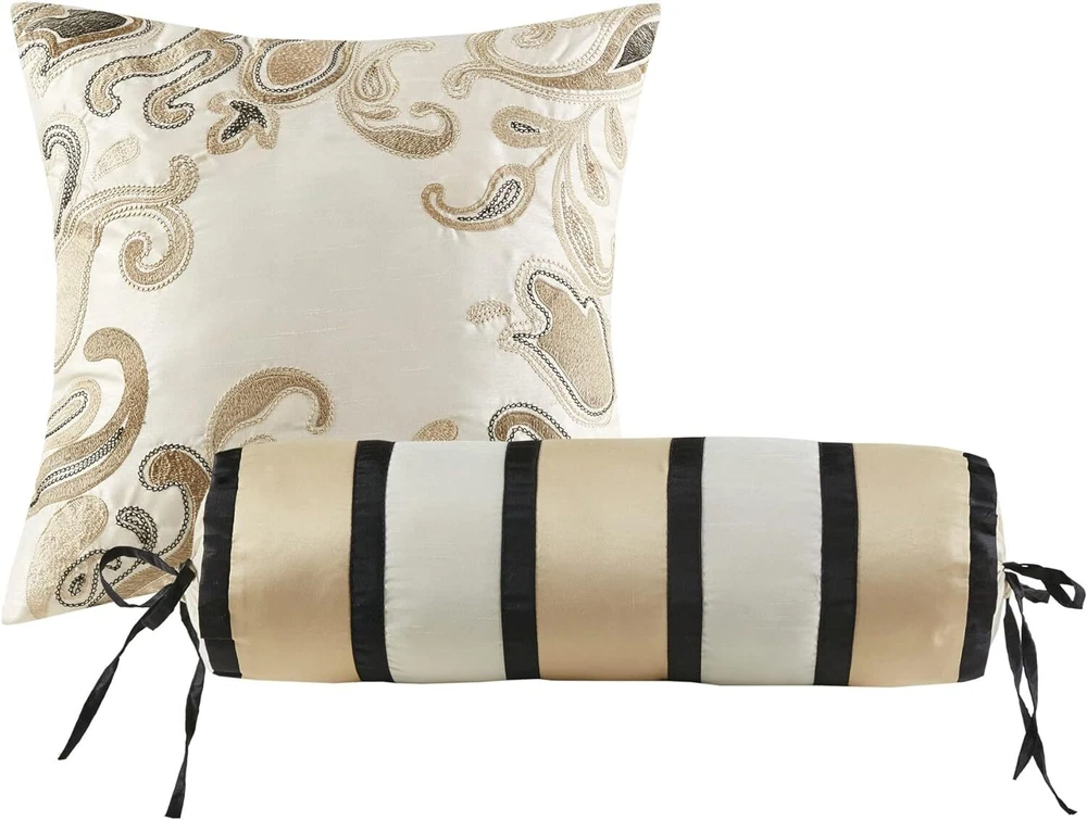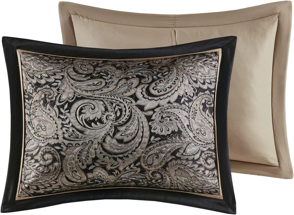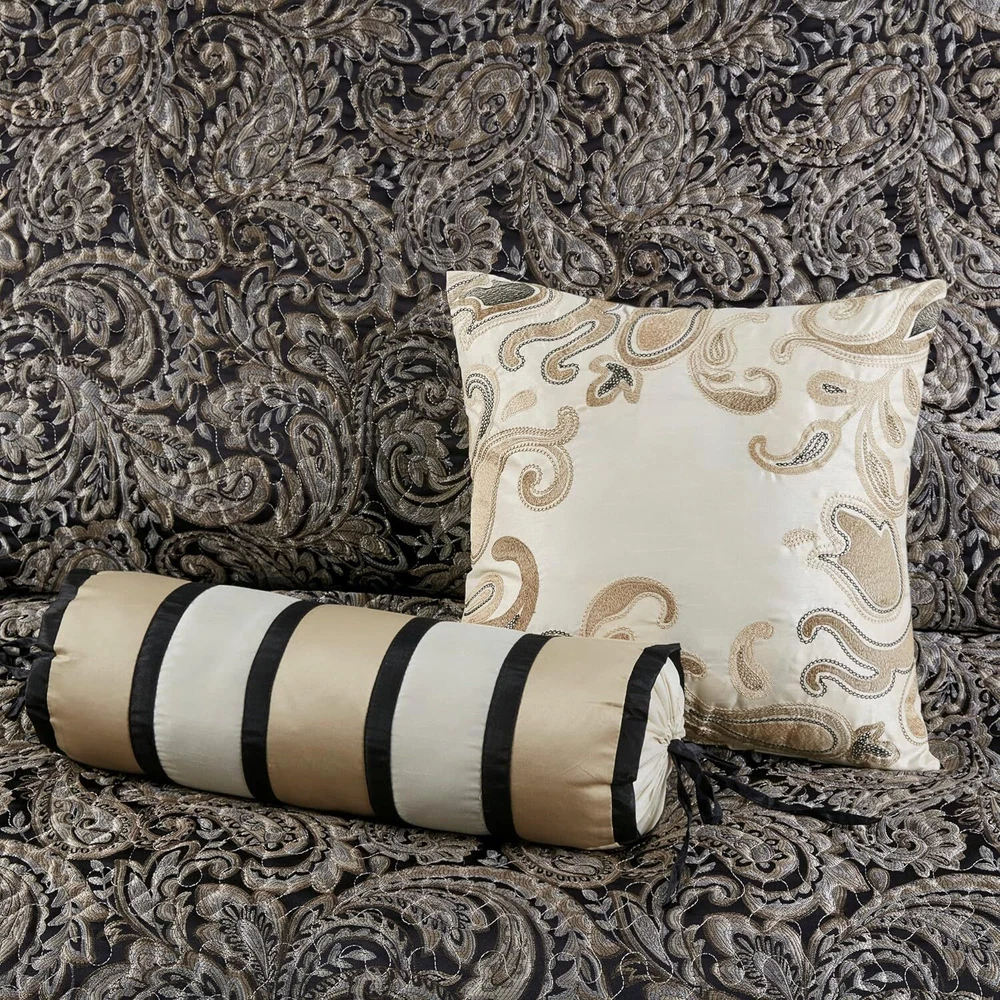 Store Categories Store Categories Bedding Comforters Decorative Pillows Duvet Covers Quilts & Coverlets Sheets Blankets & Throws Mattress Pads Pillows Home Decor Window Treatments Wall Art Home Accents Furniture Beds Dining Seating Ottomans & Benches Accent Chairs Accent Tables Dining Tables Sofas Bath Bath Robes Shower Curtains Towels Bath Rugs Bath Accessories Apparel Pajama Sets Nightgowns Rugs Rugs & Carpets Lighting Lamp Pendant Other Product Overview Details DESCRIPTION If classic is your style, Aubrey 6 Piece Reversible is perfect for you. The jacquard weave is inspired from an updated paisley motif and is woven into a beautiful combination of deep black, gold and a hint of platinum for a touch of sheen to your bedding. Three decorative pillows complete this look with embroidery and fabric manipulation details. FEATURES • Set includes 1 quilt, 2 shams, and 3 throw pillows • Classic traditional style quilt with all over vermicelli quiling • Polyester jacquard face, microfiber reverse, cotton filling for comfort and durability • Embroidery details on decorative pillow • Machine washable for easy care MATERIAL Quilt/Sham: 100% Polyester Jacquard, all over quilting, 100% brushed Polyester reverse, 90% Cotton, 10% other fiber filling Pillow: 100% Polyester shell, Polyester filling Available Sizes: Full/Queen Quilt Set includes: 1 Quilt: 90"W x 90"L 2 Standard Shams: 20"W x 26"L + 2"D 1 Decorative Pillow: 18"W x 18"L 1 Decorative Pillow: 16"W x 16"L 1 Decorative Pillow: 6.5"W x 18"L King/California King Quilt Set includes: 1 Quilt: 104"W x 94"L 2 King Shams: 20"W x 36"L + 2"D 1 Decorative Pillow: 18"W x 18"L 1 Decorative Pillow: 16"W x 16"L 1 Decorative Pillow: 6.5"W x 18"L Bedding Comforters Decorative Pillows Duvet Covers Quilts & Coverlets Sheets Blankets & Throws Mattress Pads Pillows Home Decor Window Treatments Wall Art Home Accents Furniture Beds Dining Seating Ottomans & Benches Accent Chairs Accent Tables Dining Tables Sofas Bath Bath Robes Shower Curtains Towels Bath Rugs Bath Accessories Rugs Rugs & Carpets Lighting Lamp Pendant Product Overview Product Details DESCRIPTION If classic is your style, Aubrey 6 Piece Reversible is perfect for you. The jacquard weave is inspired from an updated paisley motif and is woven into a beautiful combination of deep black, gold and a hint of platinum for a touch of sheen to your bedding. Three decorative pillows complete this look with embroidery and fabric manipulation details. FEATURES • Set includes 1 quilt, 2 shams, and 3 throw pillows • Classic traditional style quilt with all over vermicelli quiling • Polyester jacquard face, microfiber reverse, cotton filling for comfort and durability • Embroidery details on decorative pillow • Machine washable for easy care MATERIAL Quilt/Sham: 100% Polyester Jacquard, all over quilting, 100% brushed Polyester reverse, 90% Cotton, 10% other fiber filling Pillow: 100% Polyester shell, Polyester filling Available Sizes: Full/Queen Quilt Set includes: 1 Quilt: 90"W x 90"L 2 Standard Shams: 20"W x 26"L + 2"D 1 Decorative Pillow: 18"W x 18"L 1 Decorative Pillow: 16"W x 16"L 1 Decorative Pillow: 6.5"W x 18"L King/California King Quilt Set includes: 1 Quilt: 104"W x 94"L 2 King Shams: 20"W x 36"L + 2"D 1 Decorative Pillow: 18"W x 18"L 1 Decorative Pillow: 16"W x 16"L 1 Decorative Pillow: 6.5"W x 18"L