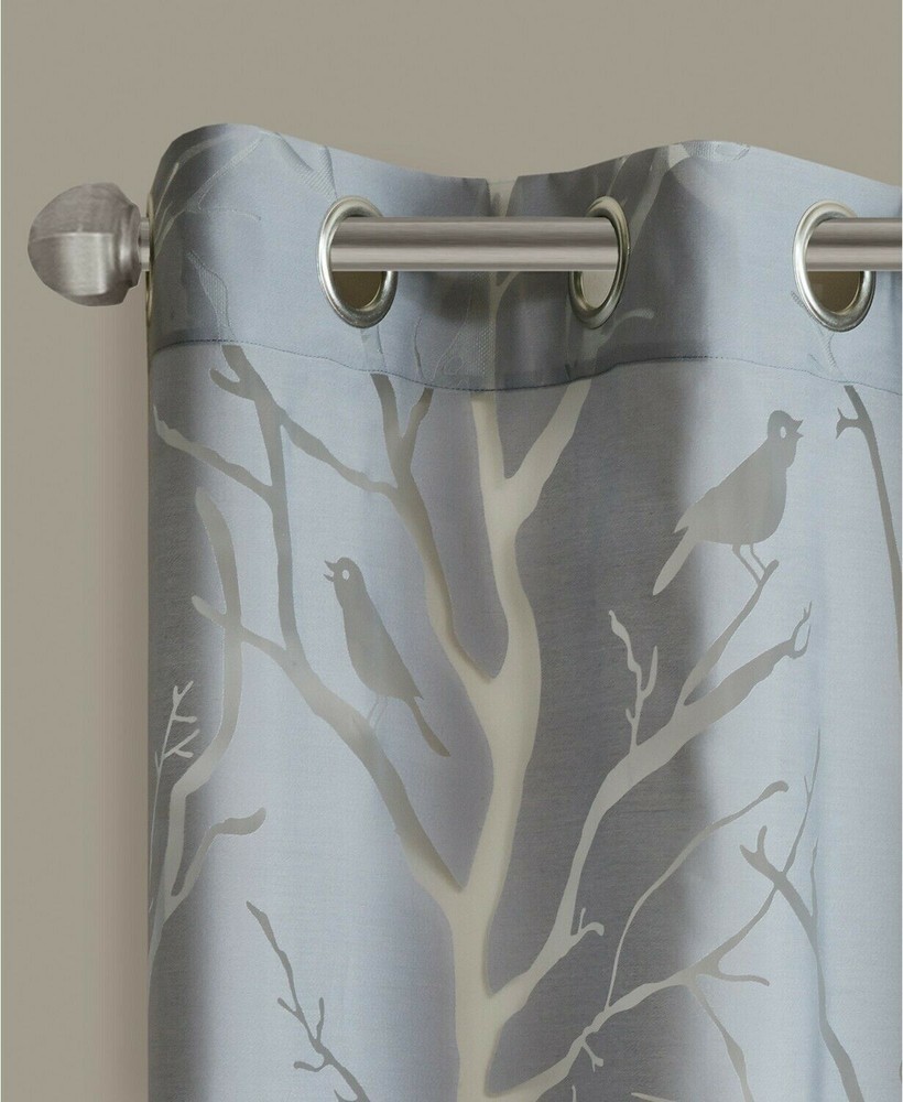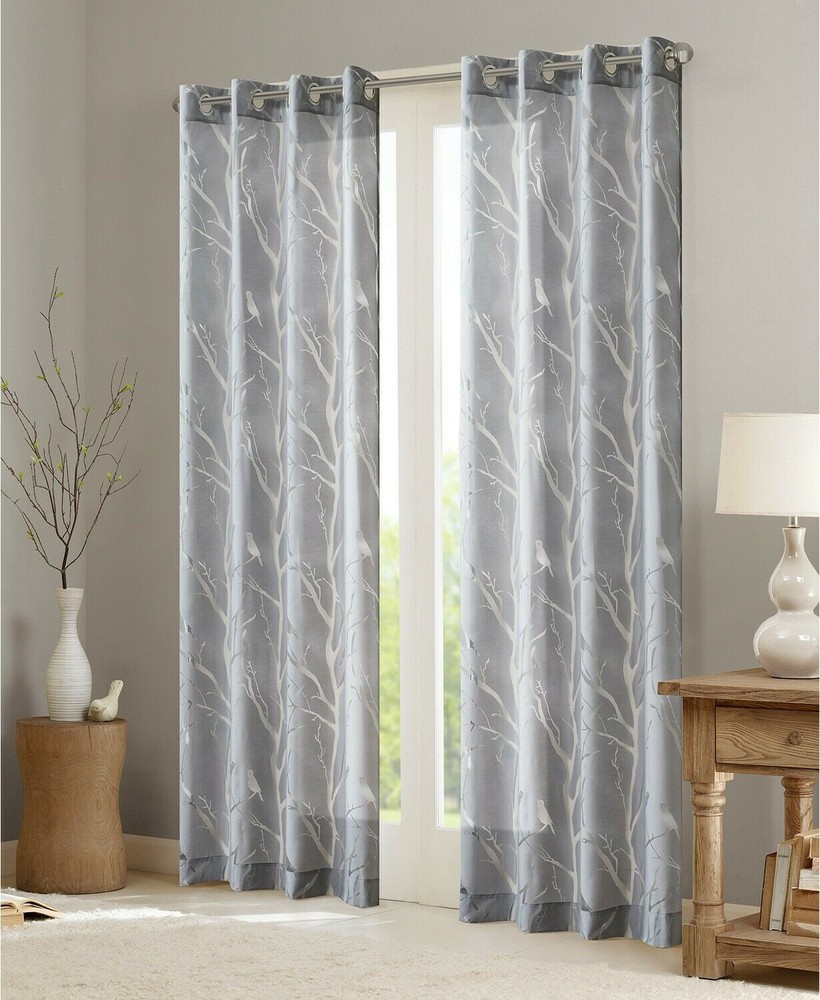 * Color: Grey * Size: 50" x 95" Add some whimsical style to your windows with the breezy light-diffusing sheer and cheerful burnout birds and branches featured on this Averil curtain panel from Madison Park. The grommet top makes hanging and styling a cinch. * Dimensions: 50" x 95" * Grommet top header * Fits rods up to 1.25" diameter * Burnout bird and branch pattern * NOTE: photo displays two panels for a finished look, but this item contains only 1 panel. Each panel is sold individually. * Fabric: rayon/polyester * Hand wash * Importedv
