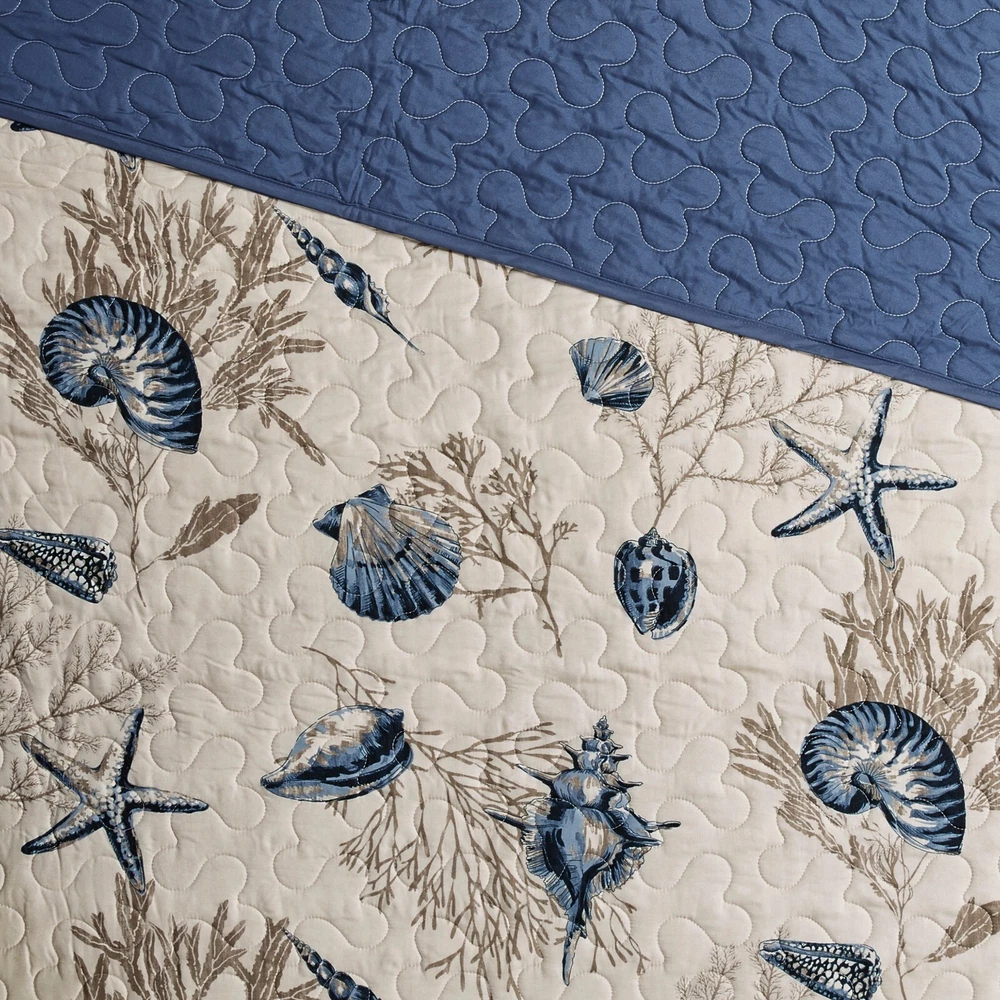 Store Categories Store Categories Bedding Comforters Decorative Pillows Duvet Covers Quilts & Coverlets Sheets Blankets & Throws Mattress Pads Pillows Home Decor Window Treatments Wall Art Home Accents Furniture Beds Dining Seating Ottomans & Benches Accent Chairs Accent Tables Dining Tables Sofas Bath Bath Robes Shower Curtains Towels Bath Rugs Bath Accessories Apparel Pajama Sets Nightgowns Rugs Rugs & Carpets Lighting Lamp Pendant Other Product Overview Details DESCRIPTION Create a coastal getaway right in your bedroom with the Reversible Bayside Quilt Collection. Made from polyester microfiber the quilt and sham feature assorted seashells accentuated with light and dark blue coloring on an ivory background. In a deep taupe color, a coral motif is printed on the background to give another dimension to this pattern. The reverse of both the quilt and sham is the same corresponding dark blue from the face. Three decorative pillows use pleating and embroidery details for added value to this quilt collection. FEATURES • Coastal style microfiber 6 piece reversible quilt set (5PC for T/TXL size) • Features assorted seashells print all over quilt and coral motif in background • quilt is quilted with vermicelli quilting for added dimension • Embroidery and pleating details on decorative pillows • Set includes 1 quilt, 2 matching shams and 3 decorative pillows (1 sham for twin/twin xl size) • Machine washable for easy care MATERIAL Quilt/Sham: Brushed polyester microfiber, solid brushed polyester reverse, cotton filling, quilted, self fabric binding, prewash finish Square Pillow: Brushed polyester microfiber, printed, piping, polyester filling Oblong Pillow: Brushed polyester microfiber, pintuck, pieced, flat piping, polyester filling Available Sizes: Twin/Twin XL Quilt Set includes: 1 Quilt: 68"W x 90"L 1 Standard Sham: 20"W x 26"L + 0.5"D 1 Decorative Pillow: 16"W x 16"L 1 Decorative Pillow: 12"W x 18"L 1 Decorative Pillow: 18"W x 18"L Full/Queen Quilt Set includes: 1 Quilt: 90"W x 90"L 2 Shams: 20"W x 26"L + 0.5"D 1 Decorative Pillow: 16"W x 16"L 1 Decorative Pillow: 12"W x 18"L 1 Decorative Pillow: 18"W x 18"L King Quilt Set includes: 1 Quilt: 104"W x 94"L 2 King Shams: 20"W x 36"L + 0.5"D 1 Decorative Pillow: 16"W x 16"L 1 Decorative Pillow: 12"W x 18"L 1 Decorative Pillow: 18"W x 18"L Bedding Comforters Decorative Pillows Duvet Covers Quilts & Coverlets Sheets Blankets & Throws Mattress Pads Pillows Home Decor Window Treatments Wall Art Home Accents Furniture Beds Dining Seating Ottomans & Benches Accent Chairs Accent Tables Dining Tables Sofas Bath Bath Robes Shower Curtains Towels Bath Rugs Bath Accessories Rugs Rugs & Carpets Lighting Lamp Pendant Product Overview Product Details DESCRIPTION Create a coastal getaway right in your bedroom with the Reversible Bayside Quilt Collection. Made from polyester microfiber the quilt and sham feature assorted seashells accentuated with light and dark blue coloring on an ivory background. In a deep taupe color, a coral motif is printed on the background to give another dimension to this pattern. The reverse of both the quilt and sham is the same corresponding dark blue from the face. Three decorative pillows use pleating and embroidery details for added value to this quilt collection. FEATURES • Coastal style microfiber 6 piece reversible quilt set (5PC for T/TXL size) • Features assorted seashells print all over quilt and coral motif in background • quilt is quilted with vermicelli quilting for added dimension • Embroidery and pleating details on decorative pillows • Set includes 1 quilt, 2 matching shams and 3 decorative pillows (1 sham for twin/twin xl size) • Machine washable for easy care MATERIAL Quilt/Sham: Brushed polyester microfiber, solid brushed polyester reverse, cotton filling, quilted, self fabric binding, prewash finish Square Pillow: Brushed polyester microfiber, printed, piping, polyester filling Oblong Pillow: Brushed polyester microfiber, pintuck, pieced, flat piping, polyester filling Available Sizes: Twin/Twin XL Quilt Set includes: 1 Quilt: 68"W x 90"L 1 Standard Sham: 20"W x 26"L + 0.5"D 1 Decorative Pillow: 16"W x 16"L 1 Decorative Pillow: 12"W x 18"L 1 Decorative Pillow: 18"W x 18"L Full/Queen Quilt Set includes: 1 Quilt: 90"W x 90"L 2 Shams: 20"W x 26"L + 0.5"D 1 Decorative Pillow: 16"W x 16"L 1 Decorative Pillow: 12"W x 18"L 1 Decorative Pillow: 18"W x 18"L King Quilt Set includes: 1 Quilt: 104"W x 94"L 2 King Shams: 20"W x 36"L + 0.5"D 1 Decorative Pillow: 16"W x 16"L 1 Decorative Pillow: 12"W x 18"L 1 Decorative Pillow: 18"W x 18"L
