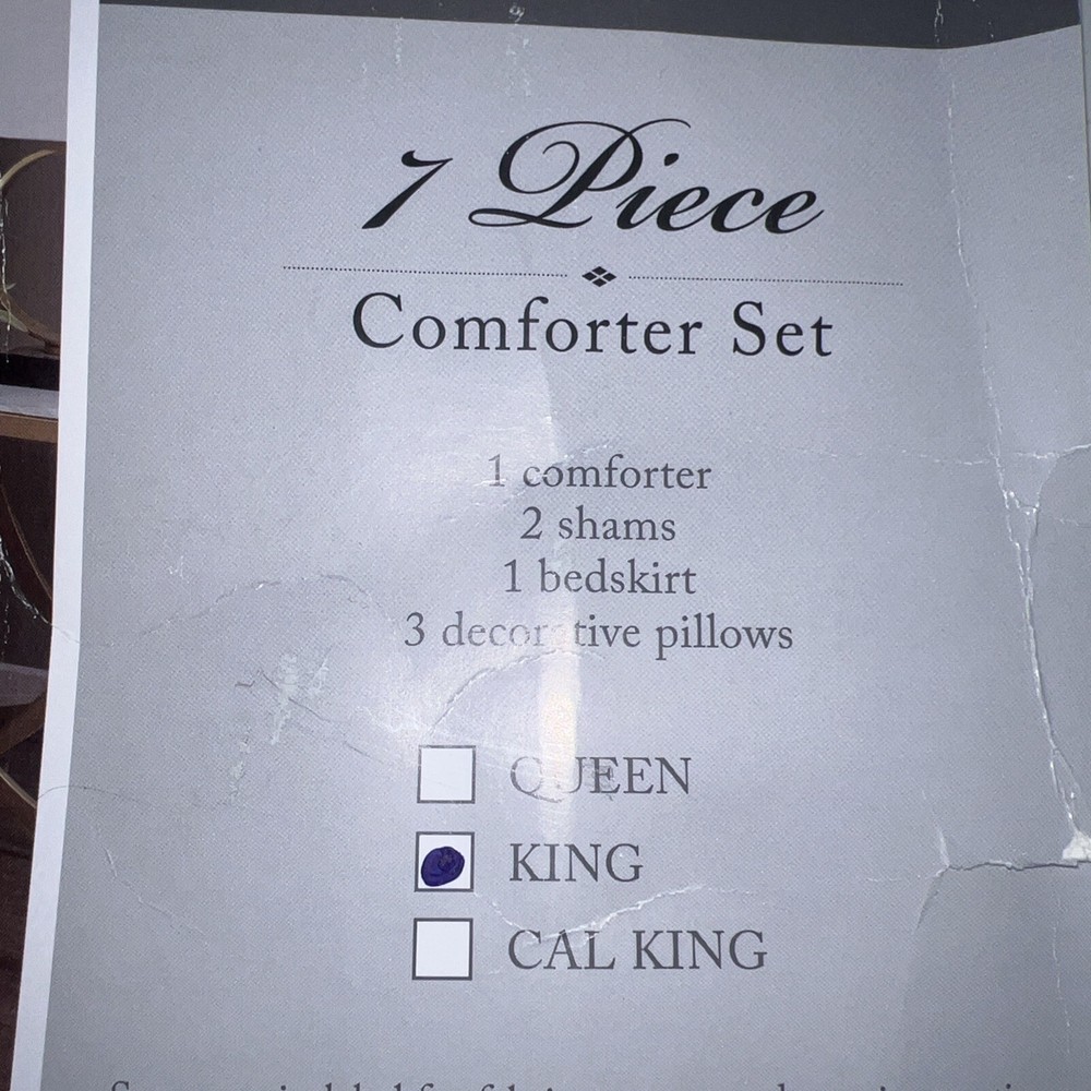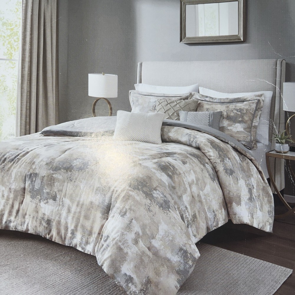 Modernize your bedroom decor with the chic styling of the Madison Park Beacon 7 piece comforter set. This luxurious comforter features an abstract print on the cotton-rich ottoman face with a solid color reverse to create a glamorous look. Product Features Bed size- king Product dimension- comforter- 104" L x 92" W, 2 king shams- 20" L x 36" W + 2" W, bed skirt- 78" L x 80" W + 15" drop, 3 decorative pillows- 18" L x 18" W, 12" L x 18" W and 16" L x 16" W Set includes- 1 comforter, 2 king shams, 1 bed skirt, 3 decorative pillows Free from allergies polyester filling in the comforter and decorative pillow Asian American & Pacific Islander Owned, Woman Owned Comforter, Sham- Cotton and Polyester with Polyester Filling, Bed skirt- Polyester and Cotton Drop, Pillow- Polyester and Cotton Cover with Polyester Filling Machine Washable Imported OEKO-TEX® Standard 100 Item will be shipped out of the box in poly mailer with any tags (row4 box)