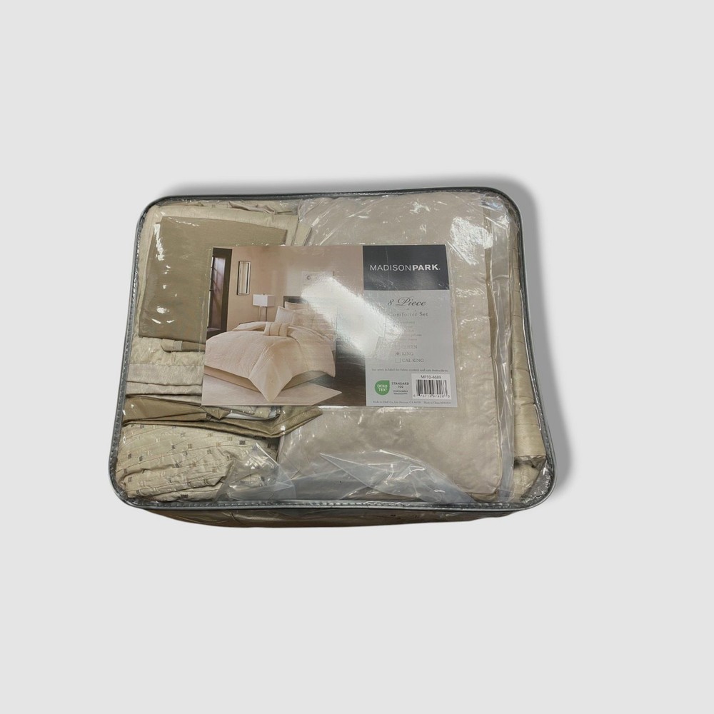 Madison Park Beige 8 Piece Embroidered Comforter Set Size King Description Set includes: comforter (104" x 92"), two king shams (20" x 36"), bedskirt (78" x 80" + 15"), two decorative pillows (18" x 18", 12" x 18") and two European shams (26" x 26") Pinch pleat design Solid pattern Fabric: polyester; comforter/pillow fill: polyester 85 GSM Machine washable. Spot clean pillows. Imported About Us We sell only 100% authentic clothing from new with tags to gently used. We have a 100% authentic or money back guarantee on every item we sell. Items are listed daily so make sure to put us on your favorite! We have been in business for over 10 years selling tens of thousands of designer items. We strive to meet your designer needs at a quality price! Payment Shipping Returns Payment accepted via paypal, credit/debit card. Shipping is usually within 24 hours of purchase (M-F). Super fast service. Tracked delivery. 100% satisfaction guaranteed. Please review our eBay return policy for more details.