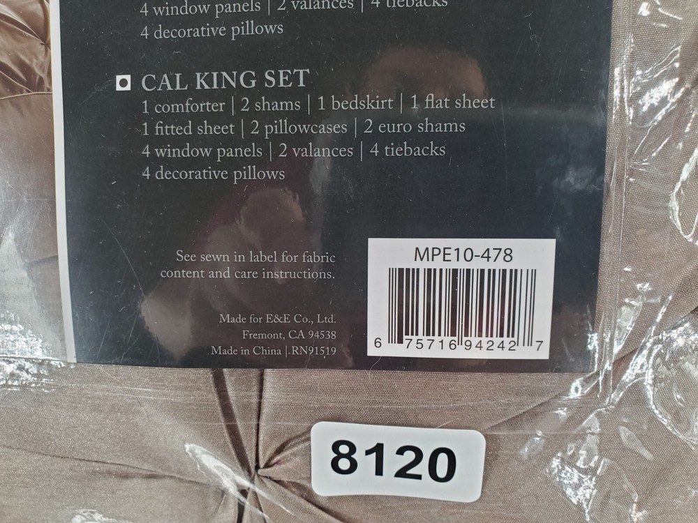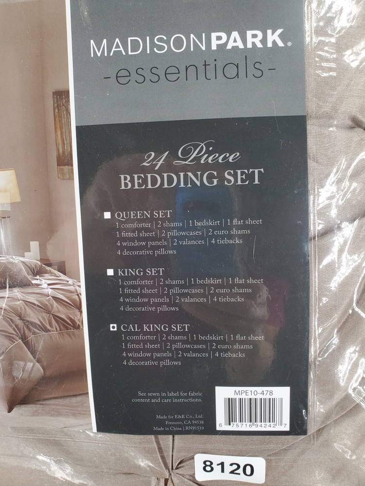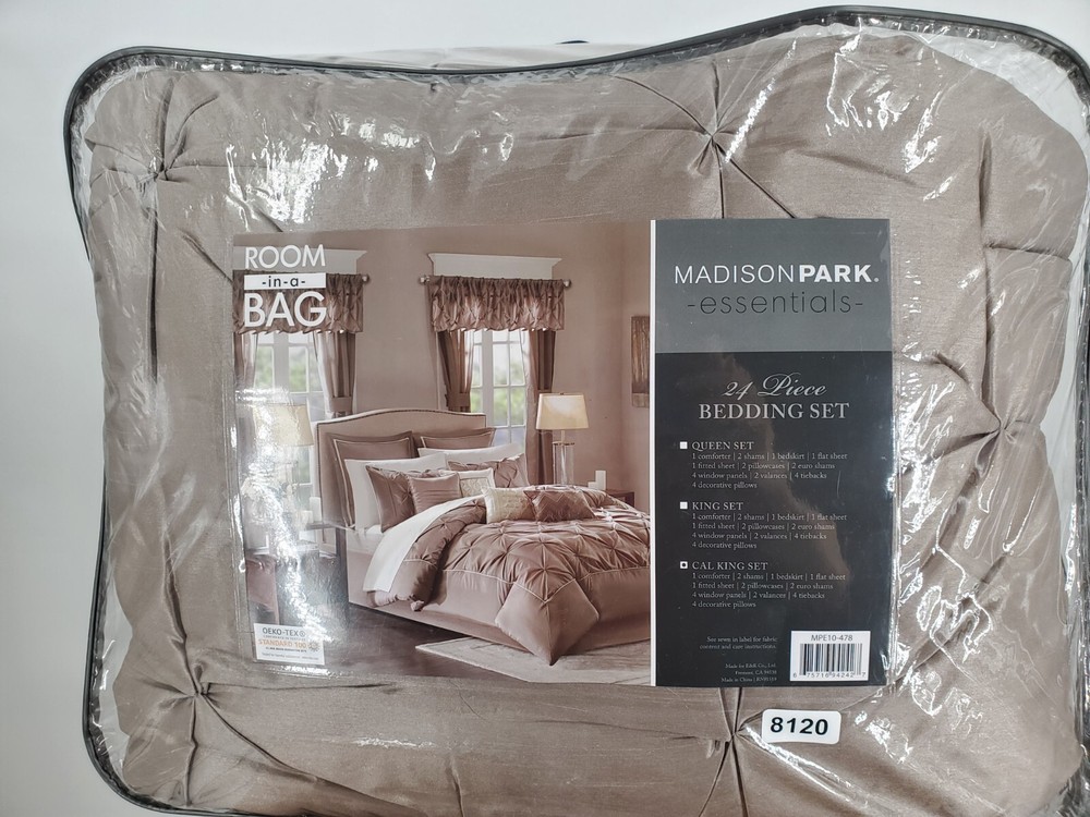 Joella 24 Piece Room in a Bag Cal King by Madison Park Invigorate your space with the Madison Park Essentials Joella 24 Piece Room in a Bag. The lavish tufted details flaunted on the comforter, shams, and window valances deliver an elegant statement in bold, natural hues. A large border frames the luxurious comforter, adding charm and dimension to the bedding set. Matching shams echo the motif seen on top of the bed, creating an elegant look in your space. An included microfiber sheet set and bed skirt complements the bedding collection and offers exceptional comfort and style. Two Euro shams and four embroidered decorative pillows help to complete the bedding set, giving it a finished look. Accompanying this bedroom set are four window panels with four tie backs to keep curtains drawn open, while two tufted valances provide the finishing touches to your bedroom.