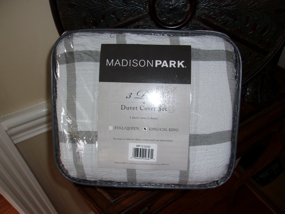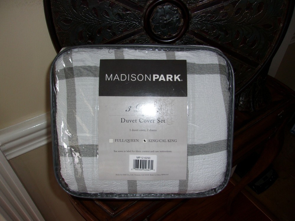 Up for purchase is a new Madison Park Beige/Taupe Plaid Seersucker King/Cal King Duvet Cover Set. Inside corner ties to secure the insert, button closure. Set includes: 1 King Duvet Cover - 104x92 2 King Shams - 20x36 New and in the original packaging