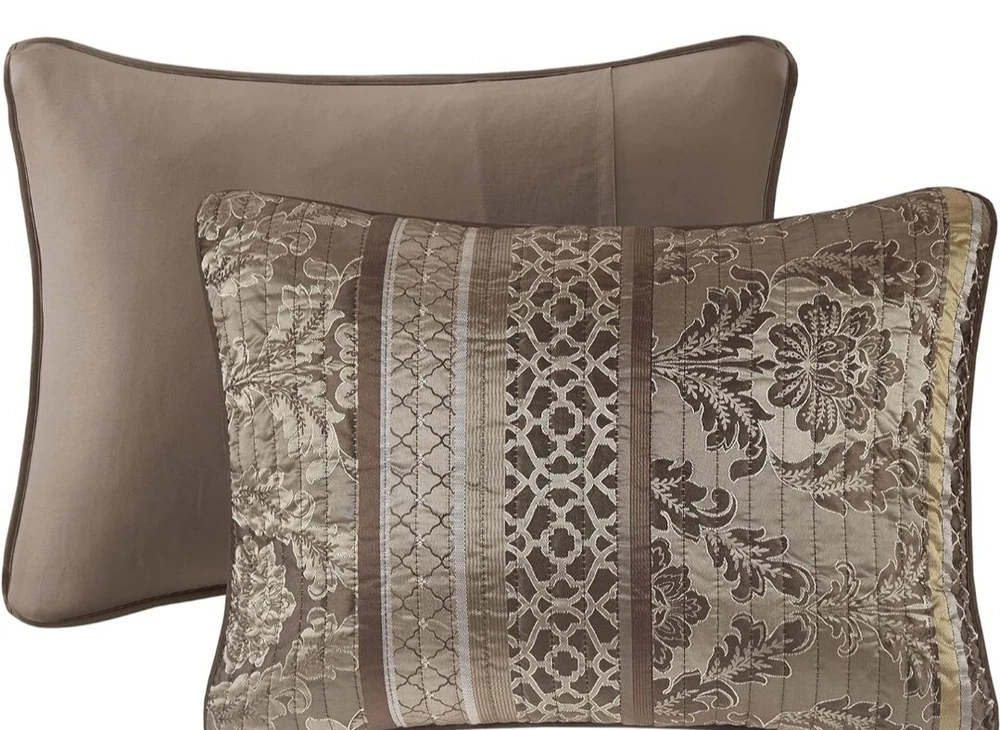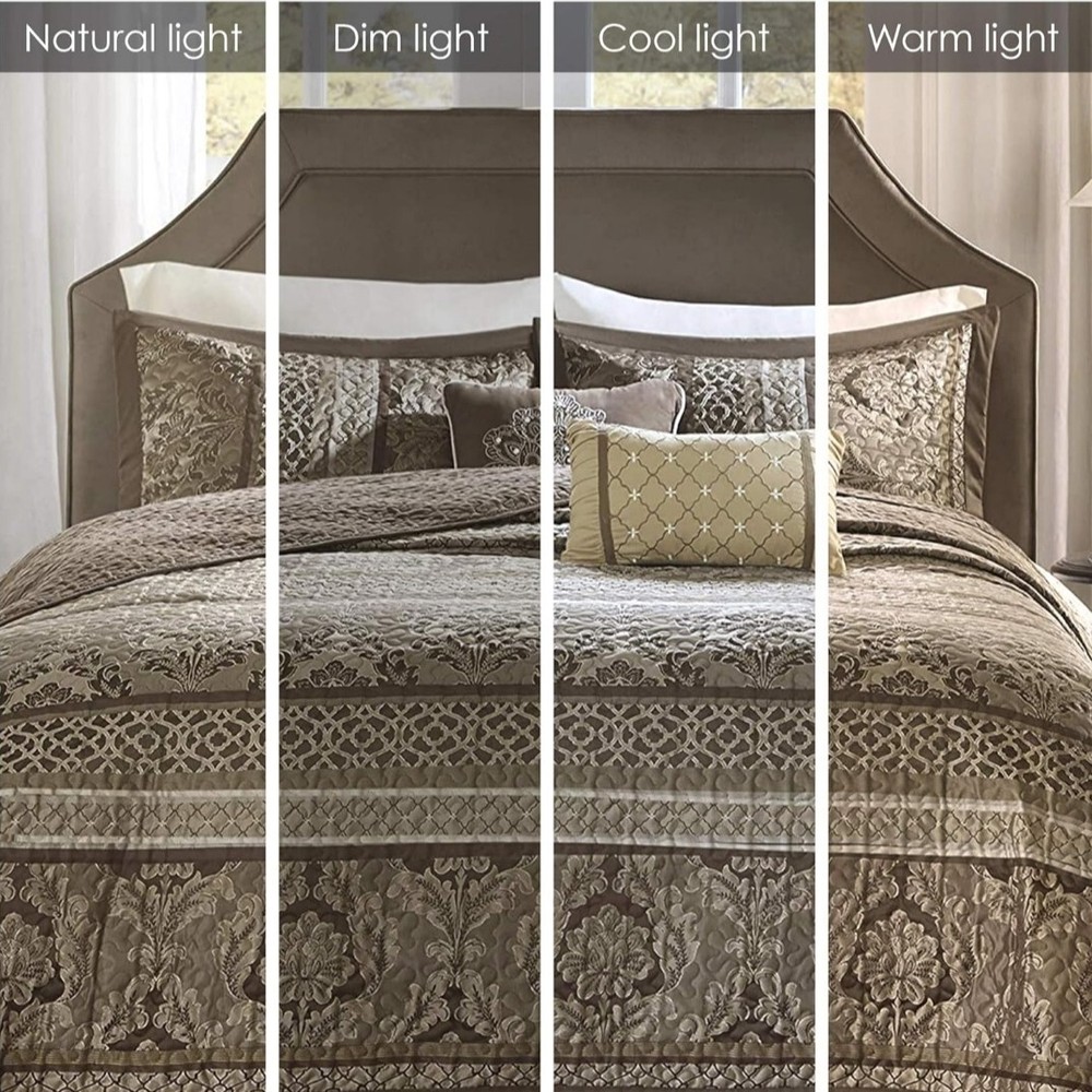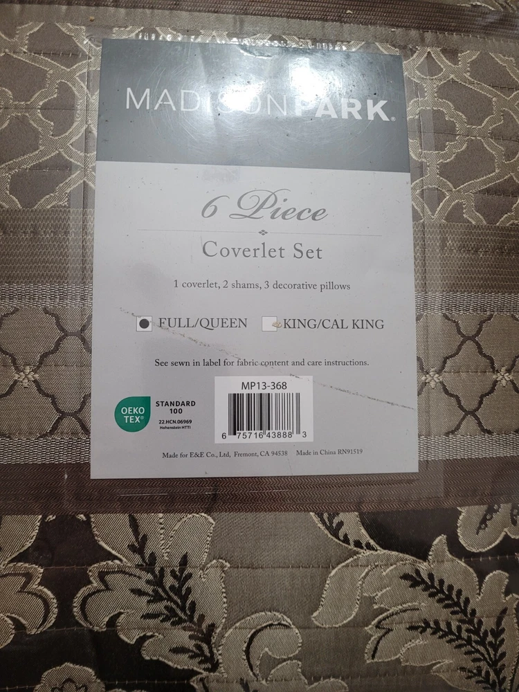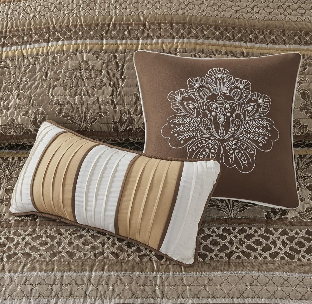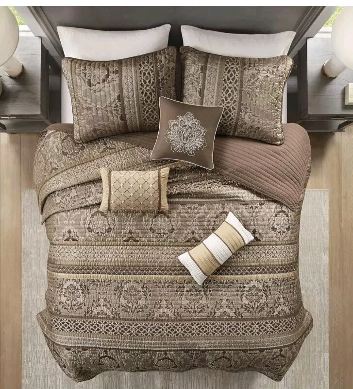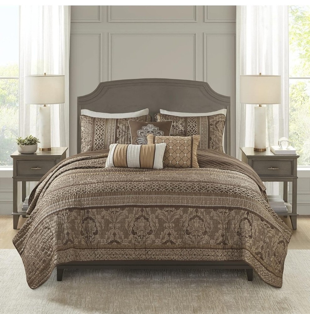 Madison Park Quilt Traditional Damask Design All Season, Lightweight Coverlet Bedspread Bedding Set, Matching Shams, Pillows, Full/Queen(90"x90"), Bellagio, Jacquard Brown/Gold 6 Piece (MP13-368) Size Full/Queen(90"x90") Included Components Pillow Sham, Coverlet, Pillow Color Brown/Gold Brand Madison Park Theme Geometric Pattern Classic, Victorian 100% Polyester Imported Madison Park Bellagio Coverlet Set can update your room with a luxurious classic update. Design featuring intricate jacquard floral and geometric patterns in bronze, taupe with brown trim accent, channel quilting Naturally lightweight fabric perfect for summer use or layer it on for cold weather. Set includes: 1 Coverlet: 90"W x 90"L, 2 Standard Shams: 20"W x 26"L, 3 Decorative Pillows: 12"W x 18"L/16"W x 16"L/10"W x18"L Care instructions: machine wash cold, gentle cycle, and separately. Do not bleach. tumble dry low, remove promptly, do not iron. If there is no free movement in the washer or dryer, use large capacity commercial washer/dryer.