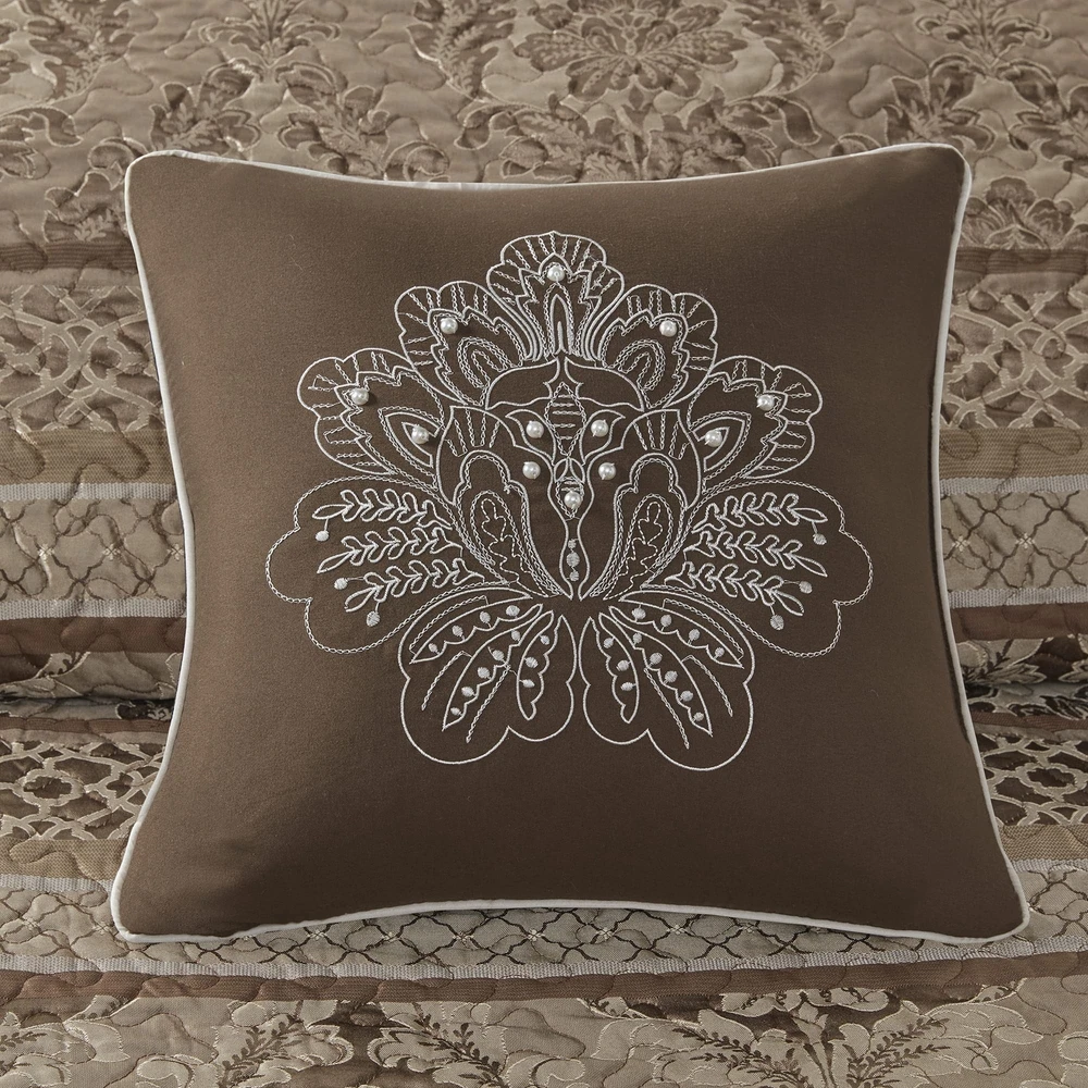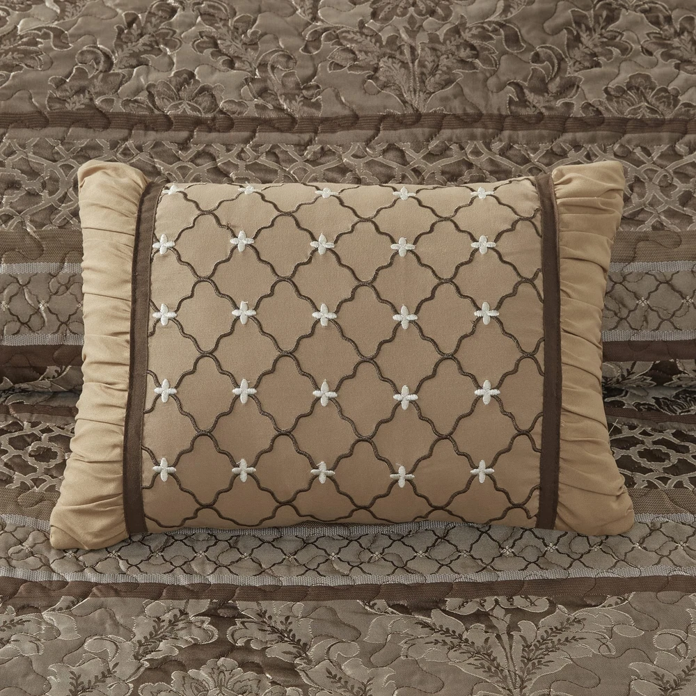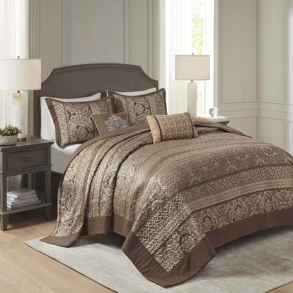 Madison Park Bellagio Reversible Quilted Bedspread Set, Solid Reverse Summer Breathable, Lightweight All Season Bedding Layer, Matching Shams, Bedspread King(120"x118"), Brown 5 Piece Product Details Color: Brown/Gold Size: Oversized King Brand: Madison Park MPN: MP13-5319 UPC: 086569963949 EAN: 0086569963949 Size: Oversized King Included Components: 1 Bedspread, 2 King Shams, 2 Decorative Pillows Color: Brown/Gold Style: Bedspread Set Brand: Madison Park Size: Oversized King Included Components: 1 Bedspread, 2 King Shams, 2 Decorative Pillows Color: Brown/Gold Style: Bedspread Set Brand: Madison Park Theme: Stripe Pattern: Striped Material: Polyester Fabric Type: Cover: 100% Polyester Filling: 90% Cotton 10% Other Fiber Number of Pieces: 5 Seasons: All Product Care Instructions: Machine Wash, Spot Clean Pillows Manufacturer: Madison Park UPC: 086569963949 Global Trade Identification Number: 49 Product Dimensions: 118 x 120 x 0.25 inches Item Weight: 13.44 pounds Department: unisex-adult Country of Origin: China Item model number: MP13-5319 Assembly required: No Batteries required: No Cover: 100% Polyester Filling: 90% Cotton 10% Other Fiber Polyester jacquard quilted Woven stripe motif Embroidered decorative pillows Traditional lifestyle Jacquard bedspread and shams, 7oz/sq yd2 90% cotton, 10% other fiber filling, microfiber pillows 1 Bedspread:120"W x 118"L 2 King Shams:20"W x 36"L + 2"D (2) 2 Decorative Pillows:16"W x 16"L /12"W x 18"L Machine Washable Spot Clean Pillows The Madison Park Bellagio 5 Piece Jacquard Bedspread Set offers a luxurious update to your bedroom decor. Made from quilted polyester jacquard, the brown coverlet and shams share leaf, woven striping, and ironwork motifs that are accentuated by elegant stitching. Flashes of gold are used throughout this collection adding a lavish feeling to your decor. Two decorative pillows feature embroidered details that correspond back to the coverlet to complete the stately ensemble. Machine washable for easy care, this jacquard bedspread brings an extravagant and traditional touch to your bedroom.