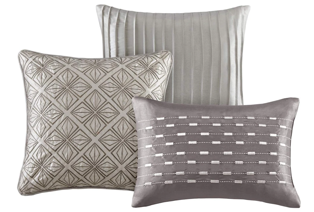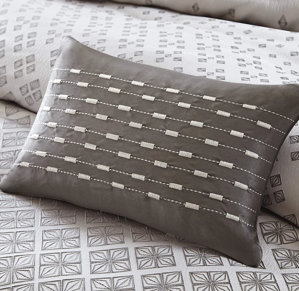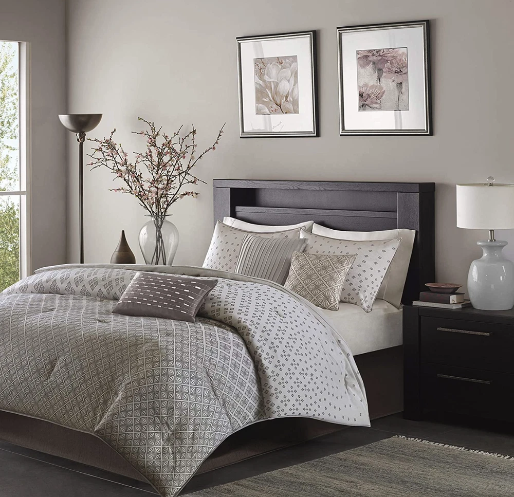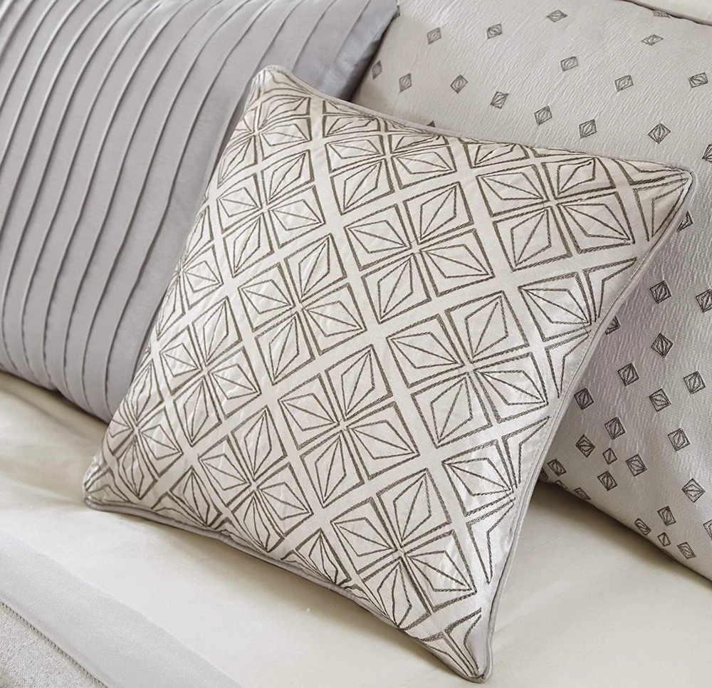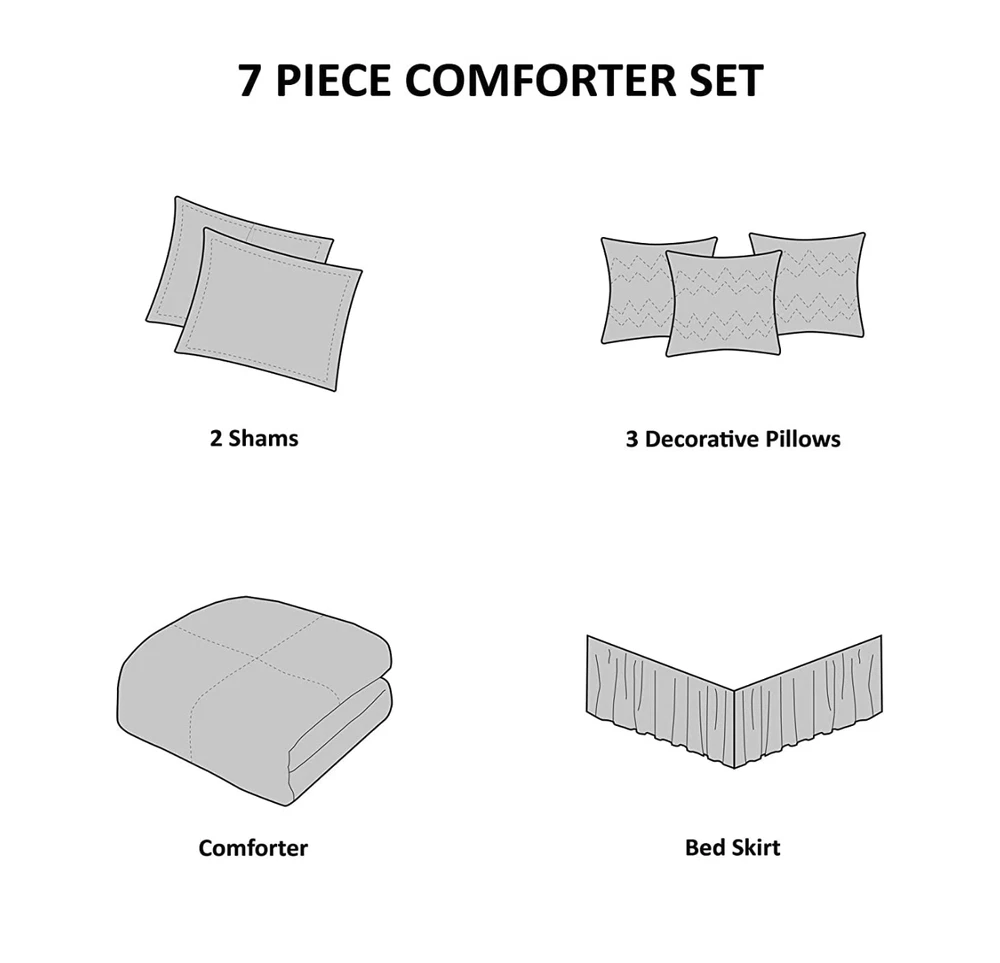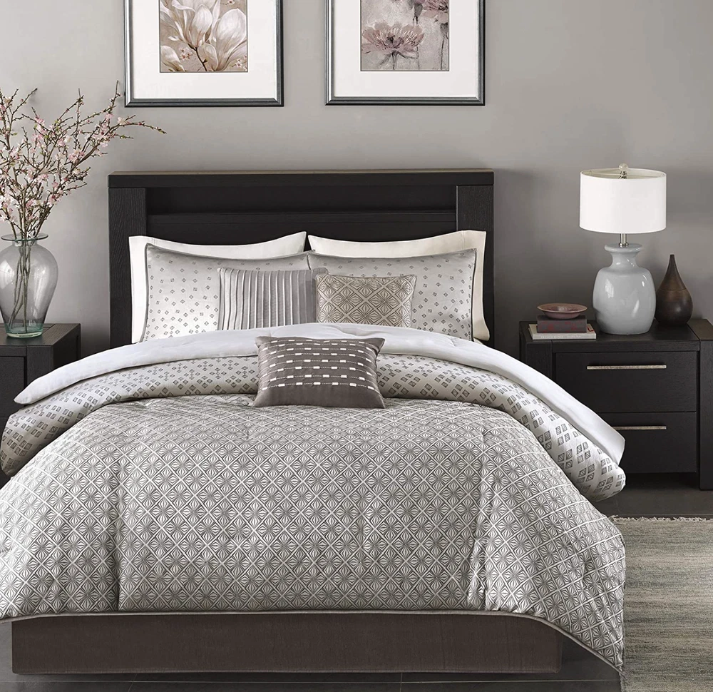 Madison Park Biloxi Jacquard Comforter Set-Modern Geometric Design All Season Down Alternative Cozy Bedding with Matching, Shams, Decorative Pillow, Queen (90 in x 90 in), Ombre Silver, 7 Piece 100% Polyester Jacquard To update your space to a modern look, try the Madison Park Biloxi Collection. The design has an ombre affect looking heavy in the center of the bed and spreading out towards the top and bottom of the comforter. Faux silk jacquard is not only giving a natural sheen finish, but also wrinkle resistant and colorfast. Set includes: 1 Comforter: 90"W x 90"L, 1 Bed Skirt: 60"W x 80"L + 15"D, 2 Standard Shams: 20"W x 26"L, 3 Decorative Pillows: 18"W x 18"L/16"W x 16"L/12"W x 18"L Care instructions: Machine wash cold, gentle cycle, and separately. Do not bleach. Tumble dry low, remove promptly. Do not iron. If there is no free movement in the washer or dryer, use large capacity commercial washer/dryer. Domestic Shipping: I ship within 1 business day of receiving cleared payment through paypal. International Shipping: International shipping is cost varies by buyer location and country. International buyer: - Import duties, taxes, and charges are not included in the item price or shipping cost. These charges are buyers's responsibility. - Check with your local custom office to determine what the additional cost will be prior to bidding or buying. - If your package is held up by your local custom office, please contact them as soon as possible and pay off the duty so that they can release your package. * International shipping does not accept return.