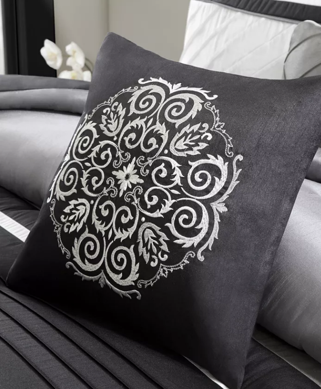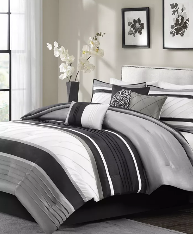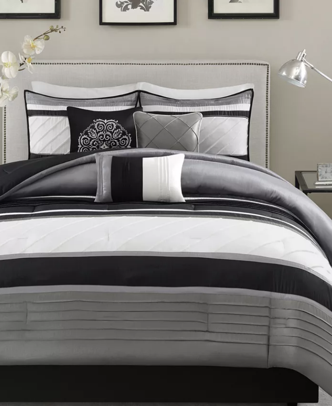 Madison Park Blaire 7-Pc. Faux-Silk Queen Comforter Set Bedding 1003 Details & Care Give any room a sophisticated modern feel with the shimmering faux silk, contemporary colorblocking and pintucked detailing of this Blaire comforter set from Madison Park. -Set includes: queen comforter (90" x 90"), queen bedskirt (60" x 80" + 15"), two standard shams (20" x 26") and three decorative pillows (16" x 16", 18" x 18", 12" x 18") -Faux-silk comforter and sham face: polyester; microfiber from polyester reverse; Bedskirt: polyester; Decorative pillows: polyester; polyester fill; Comforter fill: polyester 8-oz. per square yard -Machine washable. Spot clean pillows. -Imported