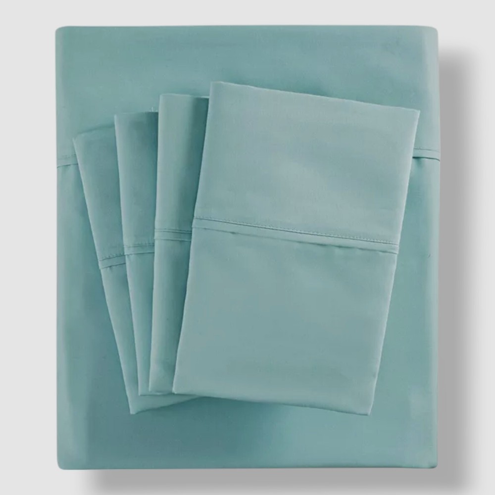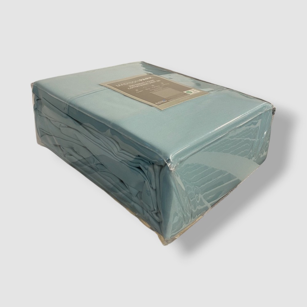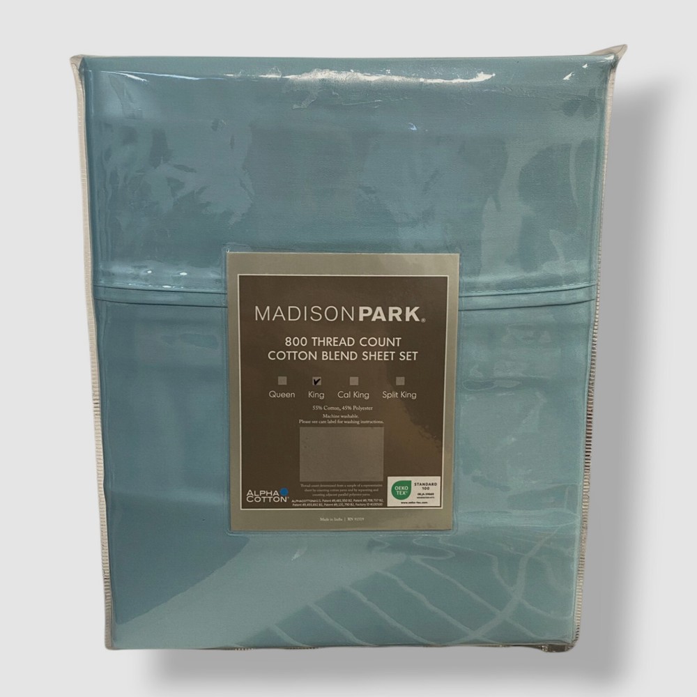 Madison Park Blue 800-TC Cotton Blend Sateen 6-Pc. Sheet Set, King Size Description Dimensions - 1 flat sheet:108" W x 102" L, 4 king pillowcases:20" W x 40" L, 1 fitted sheet:78" W x 80" L x 15" D Cotton blend sateen 800 thread count sheet set Set includes flat sheet, all over elastic fitted sheet (2 fitted sheets for split king sizes), 4 pillowcases Resistant to fading, shrinking and wrinkles Fitted sheets fits up to 17-inch pocket depth mattress Durable and long lasting many washes Machine washable for easy care 56% Cotton,44% Polyester Machine Washable Imported About Us We sell only 100% authentic clothing from new with tags to gently used. We have a 100% authentic or money back guarantee on every item we sell. Items are listed daily so make sure to put us on your favorite! We have been in business for over 10 years selling tens of thousands of designer items. We strive to meet your designer needs at a quality price! Payment Shipping Returns Payment accepted via paypal, credit/debit card. Shipping is usually within 24 hours of purchase (M-F). Super fast service. Tracked delivery. 100% satisfaction guaranteed. Please review our eBay return policy for more details.