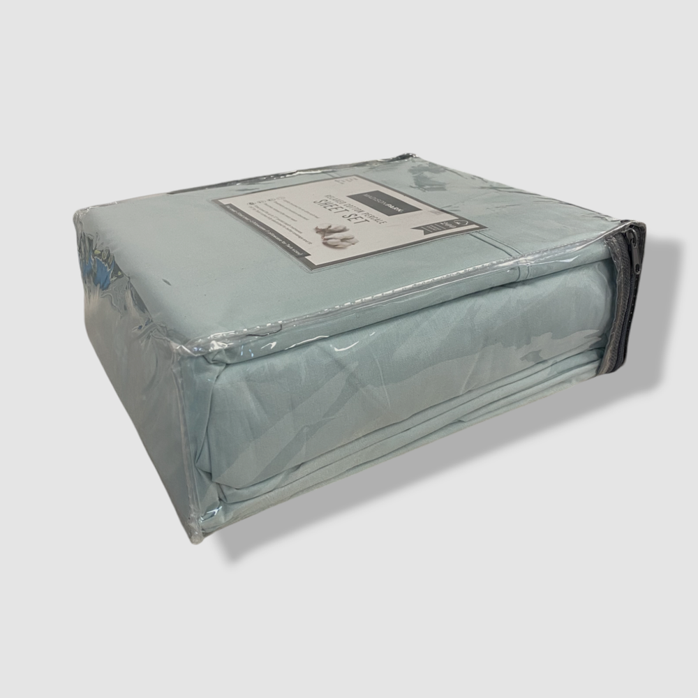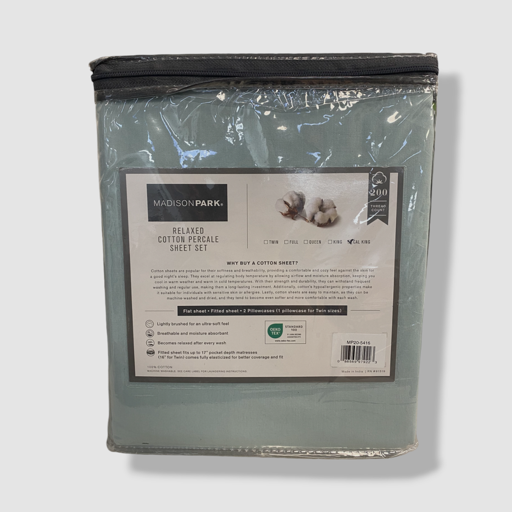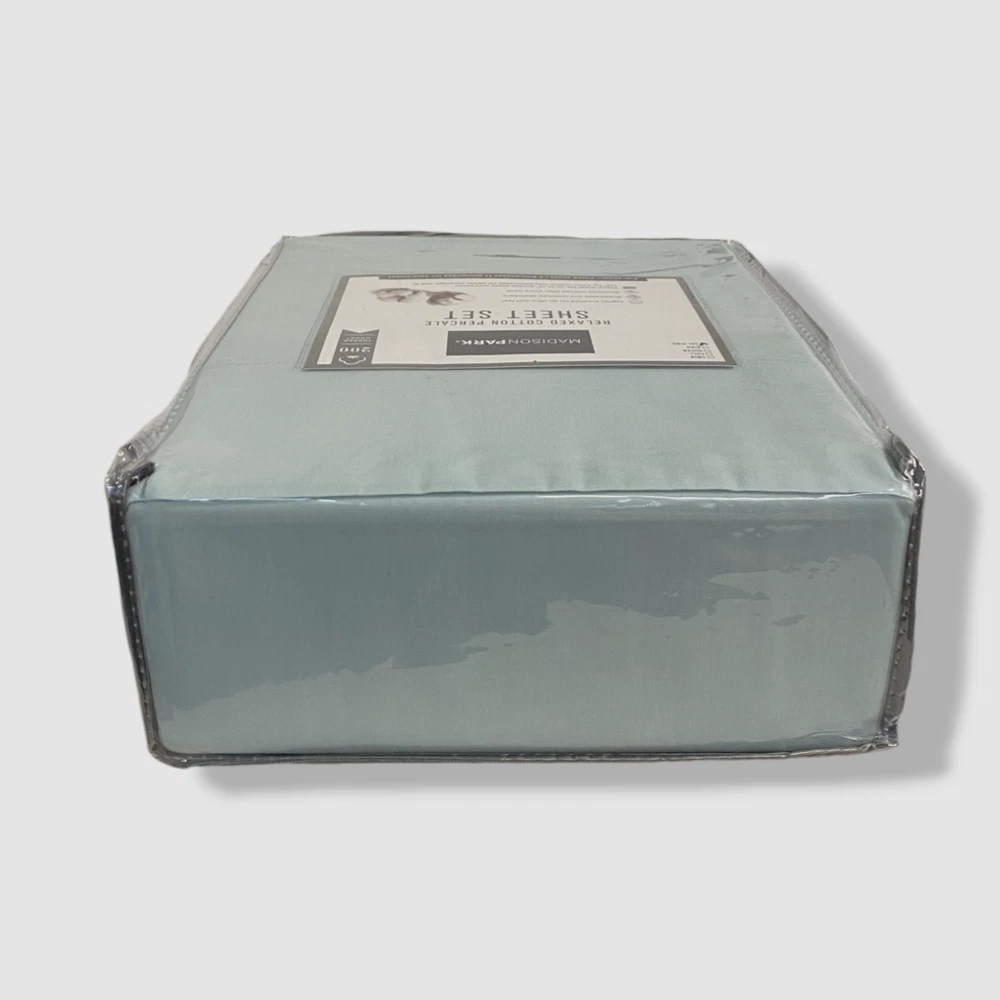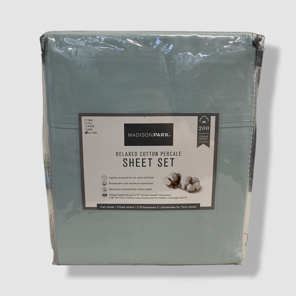 Madison Park Blue Aqua Relaxed Cotton Percale California King Sheet Set Description Piece 1: Flat Sheet: 102 Inches (L) x 108 Inches (W), Quantity 1 Piece 2: Fitted Sheet: 84 Inches (L) x 72 Inches (W), Quantity 1 Piece 3: Pillow Case: 40 Inches (L) x 20 Inches (W), Quantity 2 200 Thread Count 100% Cotton Percale sheet set Percale weave is lightly brushed to have soft feel Breathable and moisture absorbant Becomes relaxed after every wash Fitted sheet fits up to 17" pocket depth mattresses (16" for Twin) comes fully elasticized for better coverage and fit Machine washable for easy care Imported About Us We sell only 100% authentic clothing from new with tags to gently used. We have a 100% authentic or money back guarantee on every item we sell. Items are listed daily so make sure to put us on your favorite! We have been in business for over 10 years selling tens of thousands of designer items. We strive to meet your designer needs at a quality price! Payment Shipping Returns Payment accepted via paypal, credit/debit card. Shipping is usually within 24 hours of purchase (M-F). Super fast service. Tracked delivery. 100% satisfaction guaranteed. Please review our eBay return policy for more details.