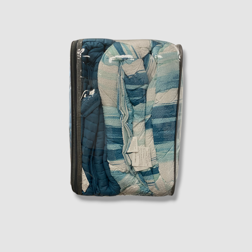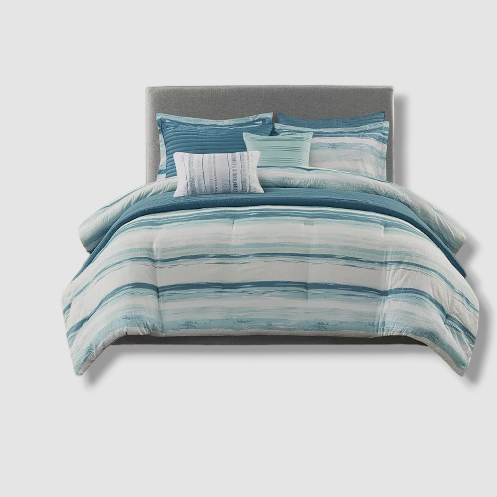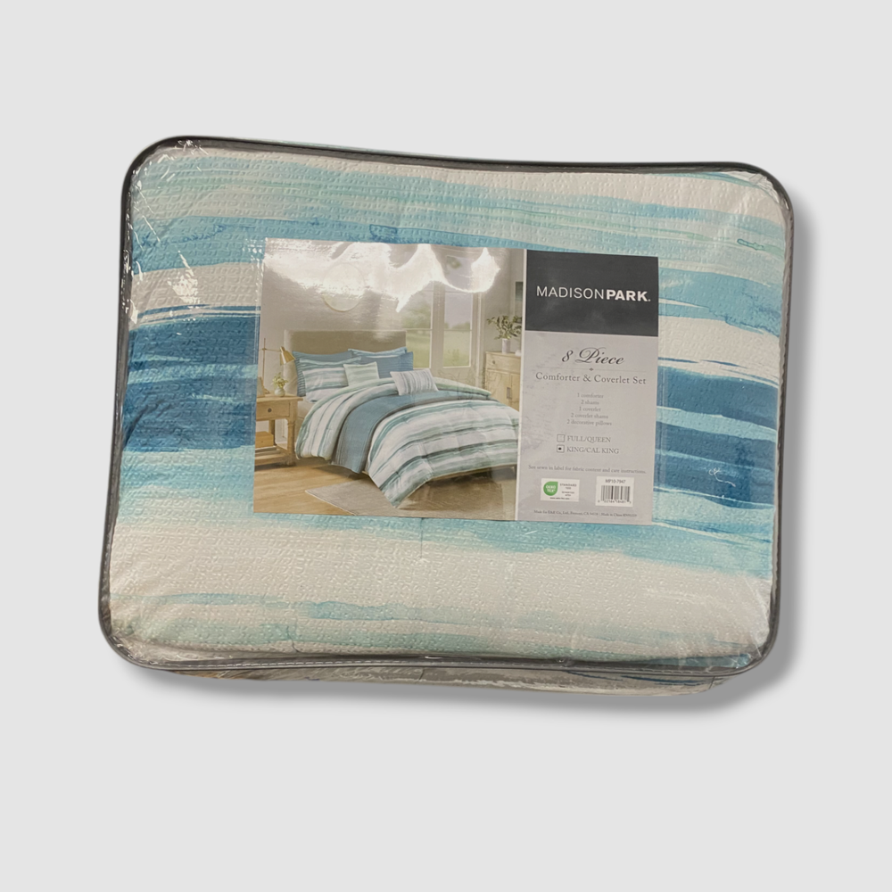 Madison Park Blue Marina Comforter King/Cal King Description Bed size - King/California King Comforter dimensions - 92" L x 104" W x 1.5" H King shams - 20" W x 36 " L plus 1.5" D Decorative pillow 1 - 16" W x 16" L Decorative pillow 2 - 12" W x 18" L Coverlet - 104" W x 94" L King shams - 20" W x 36" L Product weight - 14.87 lbs Set includes - 1 comforter, 2 king shams, 2 decorative pillow, 1 coverlet, 2 king shams Super value - Serene and tranquil watercolor printed 8 piece seersucker comforter and coverlet set Textured seersucker comforter features watercolor stripe in storm blue, aqua and teal hues and a pastel blue reverse Use coverlet quilt alone for summer season or layer it on the comforter for extra warmth Polyester filling in the comforter, coverlet quilt, and decorative pillows Items in this set may come in rolled or compressed packaging and will need to be fluffed up Polyester Machine Washable Imported About Us We sell only 100% authentic clothing from new with tags to gently used. We have a 100% authentic or money back guarantee on every item we sell. Items are listed daily so make sure to put us on your favorite! We have been in business for over 10 years selling tens of thousands of designer items. We strive to meet your designer needs at a quality price! Payment Shipping Returns Payment accepted via paypal, credit/debit card. Shipping is usually within 24 hours of purchase (M-F). Super fast service. Tracked delivery. 100% satisfaction guaranteed. Please review our eBay return policy for more details.
