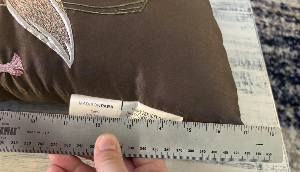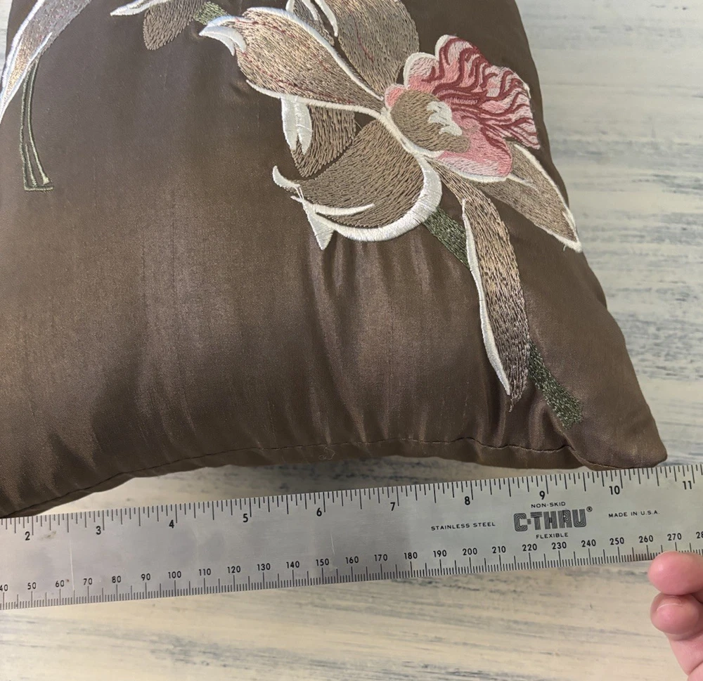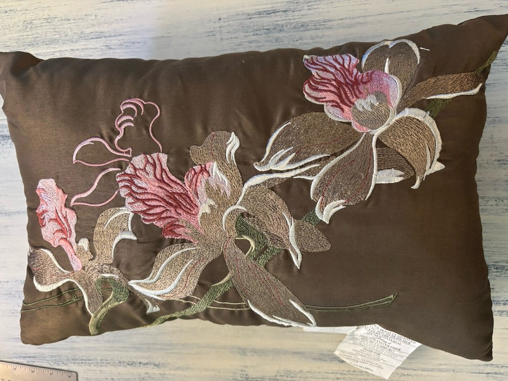 Preowned, please see all photos for condition and measurements. Thanks! The Madison Park Brown Pink Embroidered Flower Pillow is a medium-sized throw pillow featuring a rectangular shape with intricate flower petals embroidery in brown and pink colors. Made from 100% polyester, this pillow is perfect for adding a touch of floral elegance to any bedroom, living room, or guestroom. With a height of 11 inches and a length of 17 inches, it is designed for easy care with spot cleaning instructions. The Madison Park brand ensures quality and style in this charming addition to your home decor.