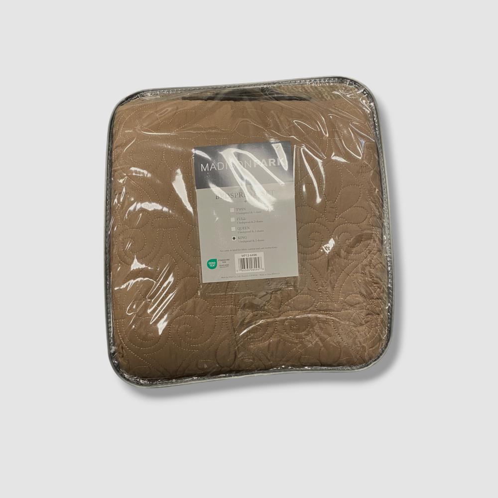 Madison Park Brown Quebec Quilted 3-Pc. Bedspread Set, King Description Bedspread, 2 king shams Bedspread: 120" x 118", king sham (2):20" x 36" Polyester; Bedspread fill: cotton/polyester Machine Washable Imported About Us We sell only 100% authentic clothing from new with tags to gently used. We have a 100% authentic or money back guarantee on every item we sell. Items are listed daily so make sure to put us on your favorite! We have been in business for over 10 years selling tens of thousands of designer items. We strive to meet your designer needs at a quality price! Payment Shipping Returns Payment accepted via paypal, credit/debit card. Shipping is usually within 24 hours of purchase (M-F). Super fast service. Tracked delivery. 100% satisfaction guaranteed. Please review our eBay return policy for more details.
