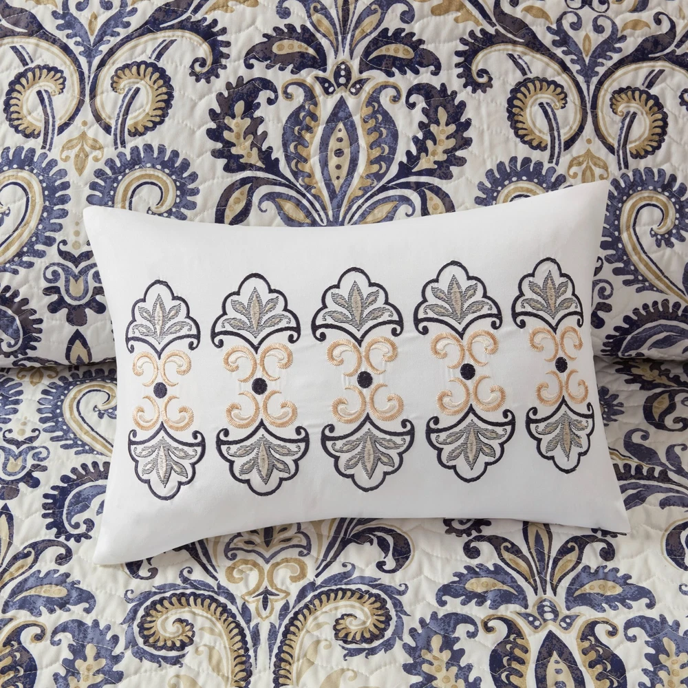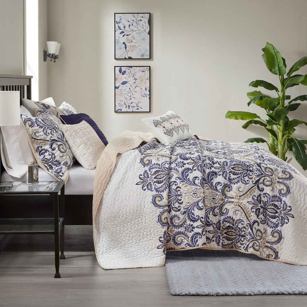 Madison Park Cali 6 Piece Reversible Quilt Set with Embroidery Throw Pillows DESCRIPTION Create your modern space with the Madison Park Cali 6 Piece Reversible Quilt Set. This white ground features an updated paisley design in shades of navy, blue, tan, and beige with the quilt reversing to a solid beige back for the perfect color balance. Three decorative pillows features pleating and embroidery details to pull this whole look together. FEATURES • Set includes 1 quilt, 2 matching shams and 3 decorative pillows • Features updated paisley design and all over quilting • 100% microfiber quilt reverse to soft brushed fabric in solid beige color • Embroidery and pleating details on decorative pillows • Machine washable and spot clean fabric (See care label) • Items may come in compressed packaging to ensure efficient shipping MATERIAL Quilt/Sham: 100% polyester microfiber, printed, all over quilting, 100% brushed polyester reverse, 90% cotton, 10% other fiber filling Pillow: 100% polyester shell, polyester filling Available Sizes: Full/Queen Quilt Set includes: 1 Quilt Set: 90"W x 90"L 2 Standard Shams: 20"W x 26"L 1 Decorative Pillow: 12"W x 18"L 1 Decorative Pillow: 16"W x 16"L 1 Decorative Pillow: 18"W x 18"L King/California King Quilt Set includes: 1 Quilt Set: 104"W x 94"L 2 King Shams: 20"W x 36"L 1 Decorative Pillow: 12"W x 18"L 1 Decorative Pillow: 16"W x 16"L 1 Decorative Pillow: 18"W x 18"L