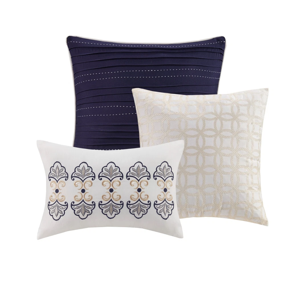 Absolutely love this quilt set! The reversible design is a game-changer—so versatile for any season. The embroidery and pleating on the pillows add such a chic, elegant touch. The fabric is soft, cozy, and high-quality, making my bed look like a magazine spread. The navy and beige color combo is timeless and pairs perfectly with my decor. Washes well, too! Highly recommend for a stylish, comfy upgrade.