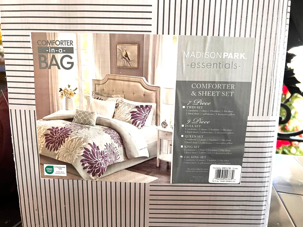 Madison Park California King Size Complete Comforter & Cotton Sheet Set, Purple About this item: Transform your bedroom into a comfortably casual retreat with the madison park essentials maible complete comforter and cotton sheet set. A beautiful printed floral design, in purple and white hues, adorns the grey ultra-soft microfiber comforter and shams, for an enchanting look. An embroidered decorative pillow and a solid grey bed skirt add chic finishing touches to the bedding set. Also included a 100% cotton sheet set with pillowcases, a flat and a fitted sheet that fits up to a 14-inch (12-inch in twin size) mattress features a printed design that complements the comforter. Machine washable for easy care, this complete bed and sheet set provides a complete makeover for your bedroom decor.. Specifications Color: Purple; Material: Cotton; Age: Adult; Size: California King; Weight: 15.64 lbs; Size California King (104 in x 92 in) Included Components 1 Comforter, 2 King Shams, 1 Bedskirt, 1 Flat Sheet, 1 Fitted Sheet, 2 King Pillowcases, 1 Decorative Pillow 1 Comforter, 2 King Shams, 1 Bedskirt, 1 Flat Sheet, 1 Fitted Sheet, 2 King Pillowcases, 1 Decorative Pillow Color Floral Purple If for any reason you not satisfied with our product, you may return any un-opened merchandise (except Skincare, and Makeup items due to health reasons ) in its original condition, including original packaging and packing slip within 7 days of receipt and you will receive a refund less shipping charges. 15% restocking fee will apply. Shipping cost is non-refundable for undelivered, unclaimed or returned packages, unless we made an error. *********************************************** Payment must be received within seven (7) days of auction close. Unpaid auction wins will be forfeited after seven (7) days and a Non-Payer report will be filed with eBay to recover the closing fees of the auction. If you wish to combine multiple auctions for shipping, please make sure the closing dates from the first auction to the last auction are within seven (7) days Sellers are not responsible for service transit time. Transit times are provided by the carrier, exclude weekends and holidays, and may vary with package origin and destination, particularly during peak periods. ******************************************************************************************* PLEASE CONTACT ME FIRST IF YOU ARE NOT SATISFIED WITH YOUR PURCHASE. I WILL BE HAPPY TO SOLVE ANY PROBLEM. CUSTOMER SATISFACTION IS MY NUMBER ONE PRIORITY. ************************************** PLEASE GIVE US THE OPPORTUNITY TO SERVE YOU !!!