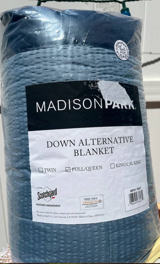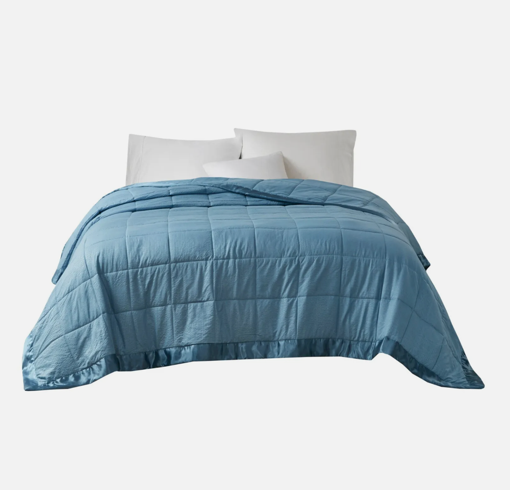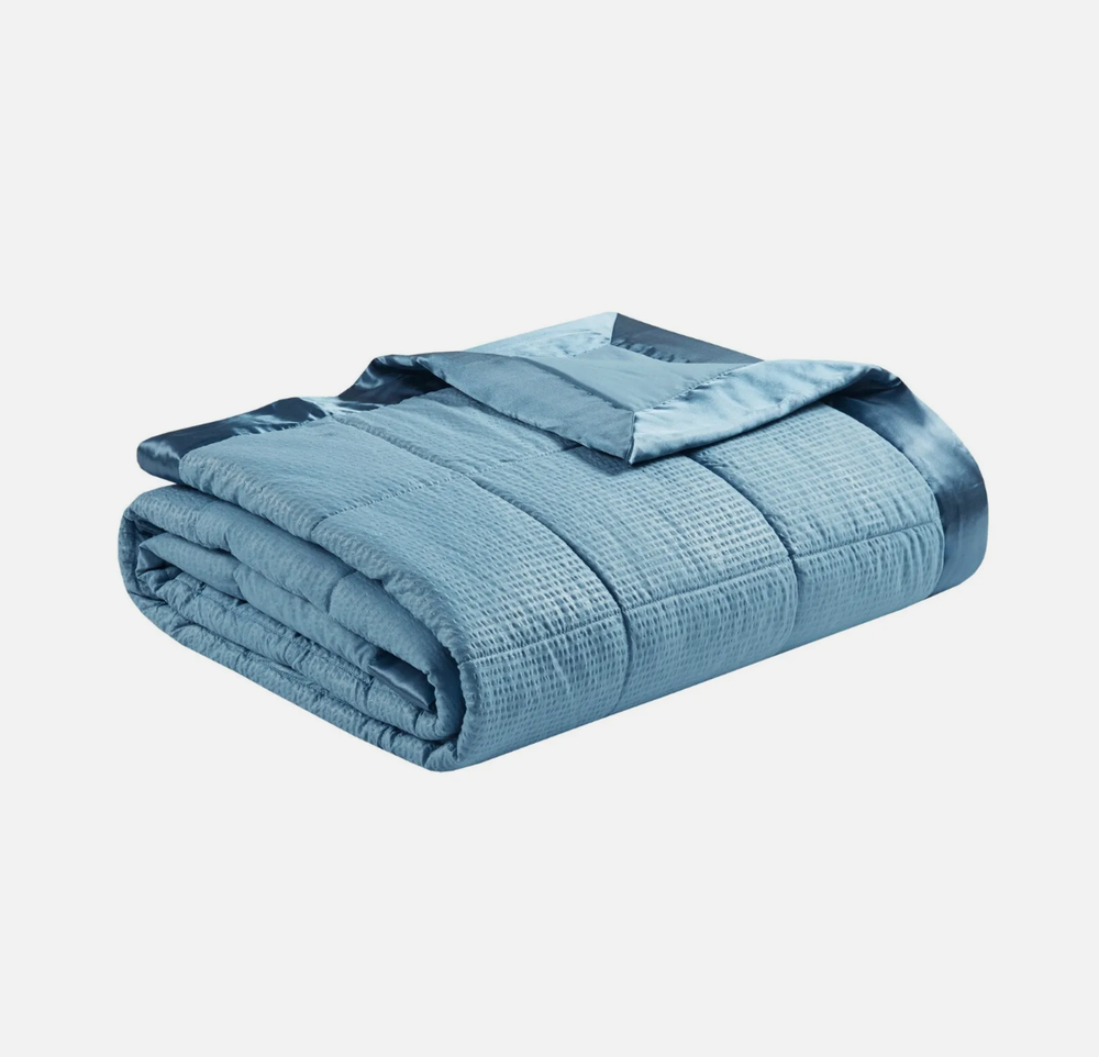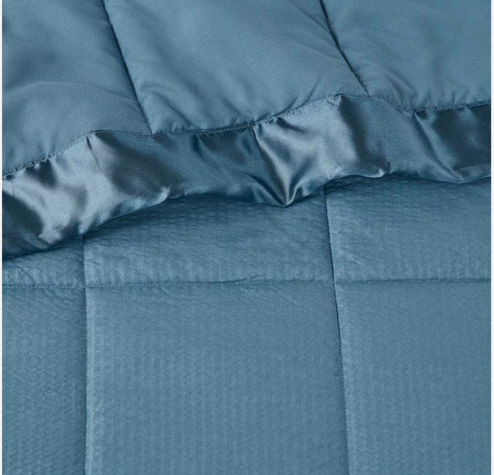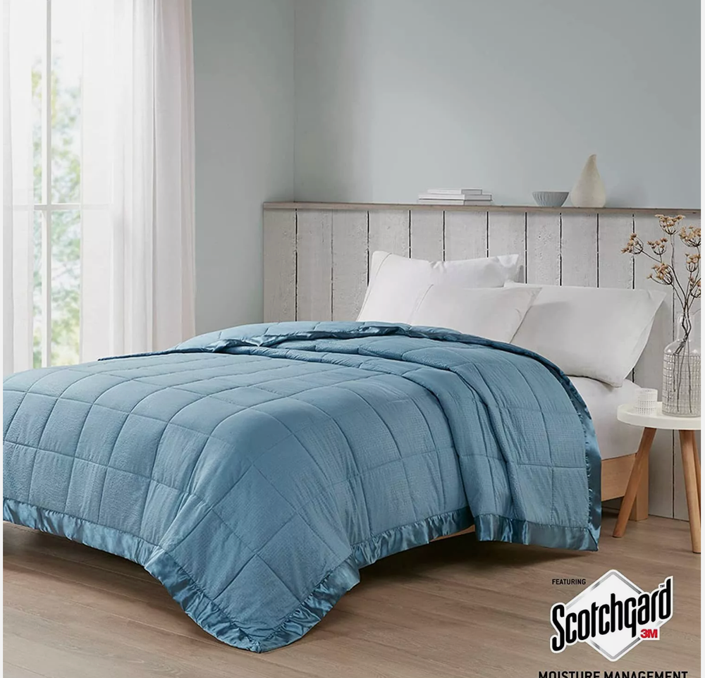 Make every night a cozy one with this textured oversized down alternative blanket. The color-matched 3" satin trim adds a luxury element that feels great on your skin. It features a 3M Scotchgard Moisture Management Treatment that wicks away moisture while helping release stains. Machine washable for easy care with a classic box quilting design. Machine washable and steam iron for wrinkle removal. MPN: 89287822 Size: Full/Queen Color: slate blue Age Group: adult Gender: unisex Weight: 1.78lb